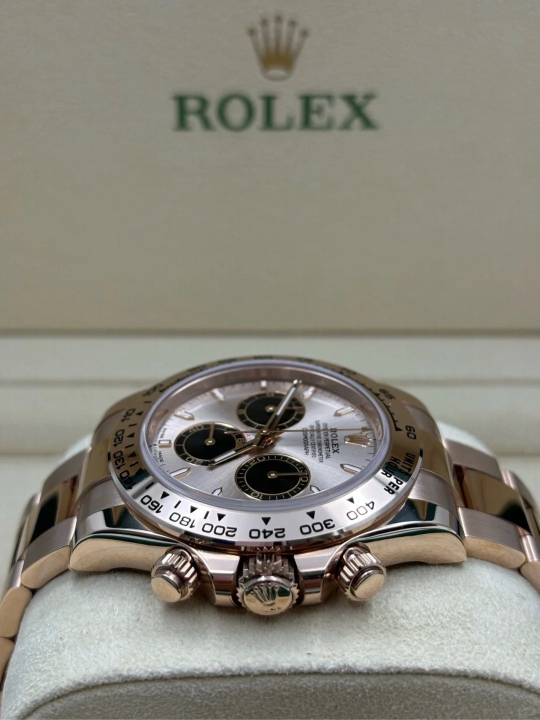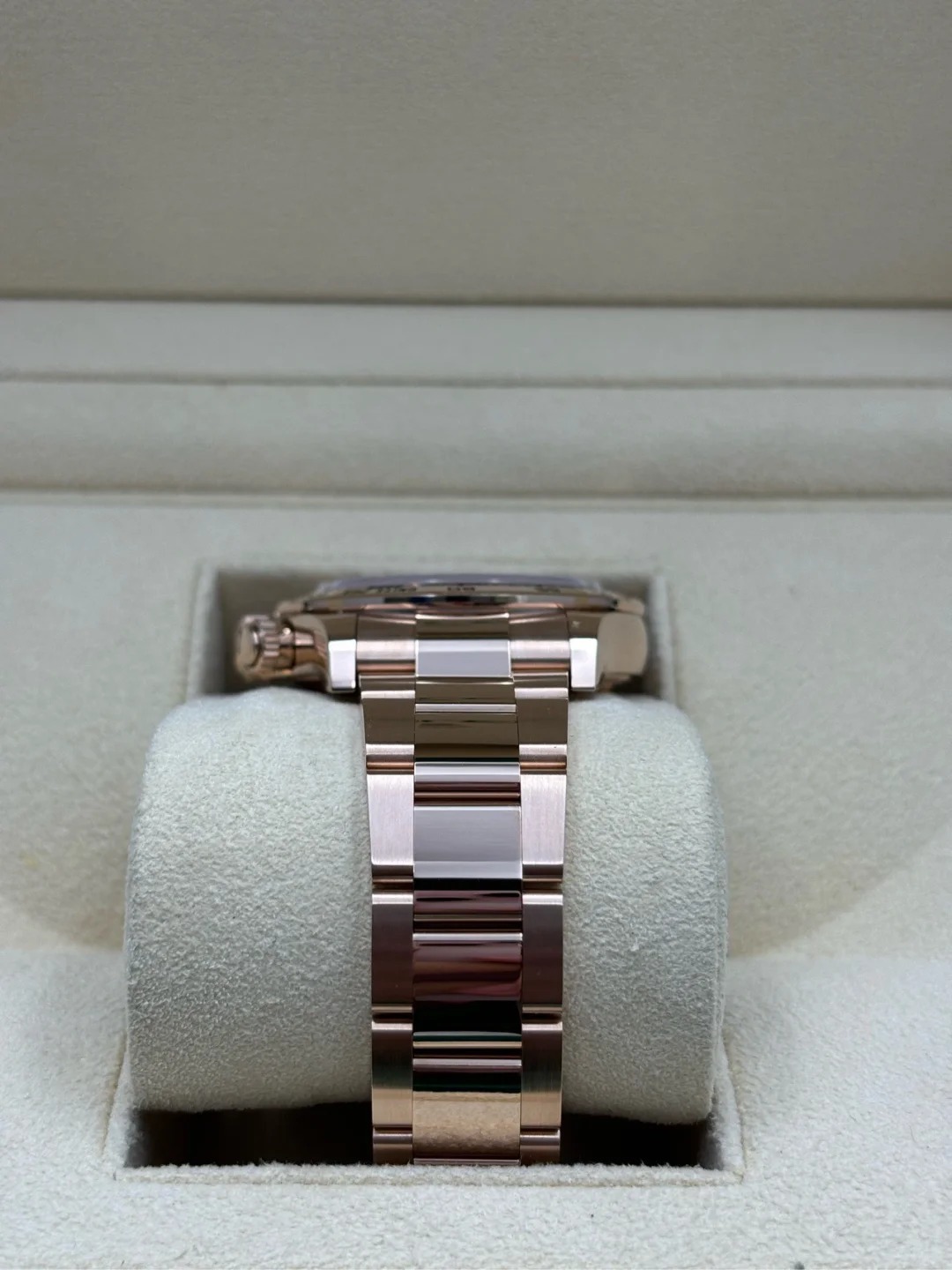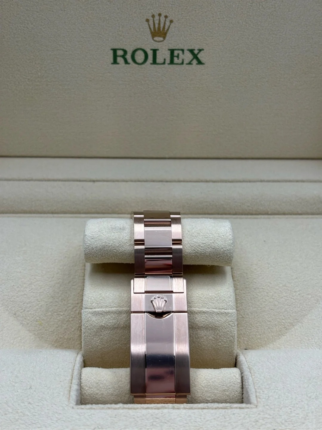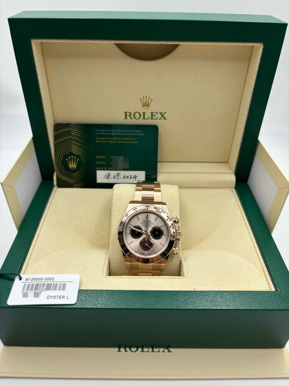 The Oyster Perpetual Cosmograph Daytona in 18 ct Everose gold features a sunrise gold and gloss black dial and an Oyster bracelet, with an engraved tachymeter on an 18-carat Everose gold bezel. -m126505-0003 40mm