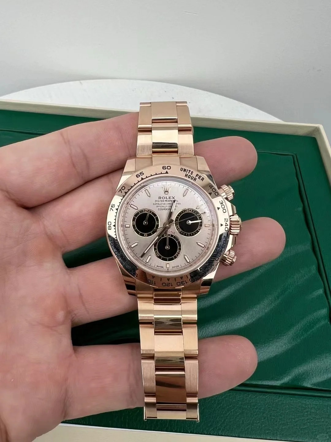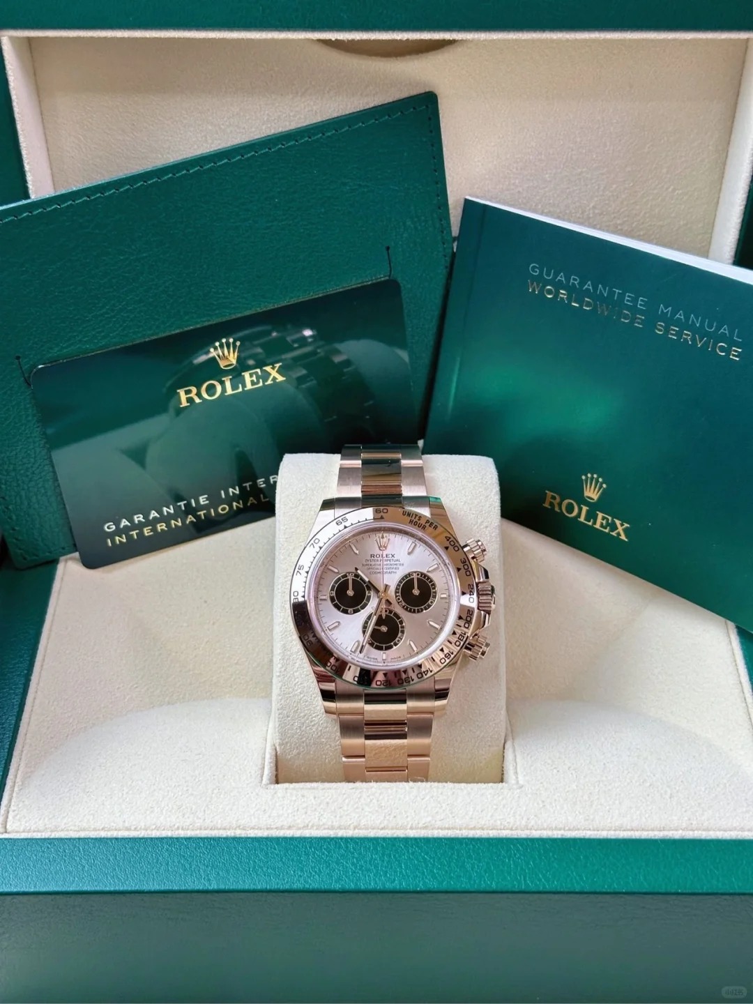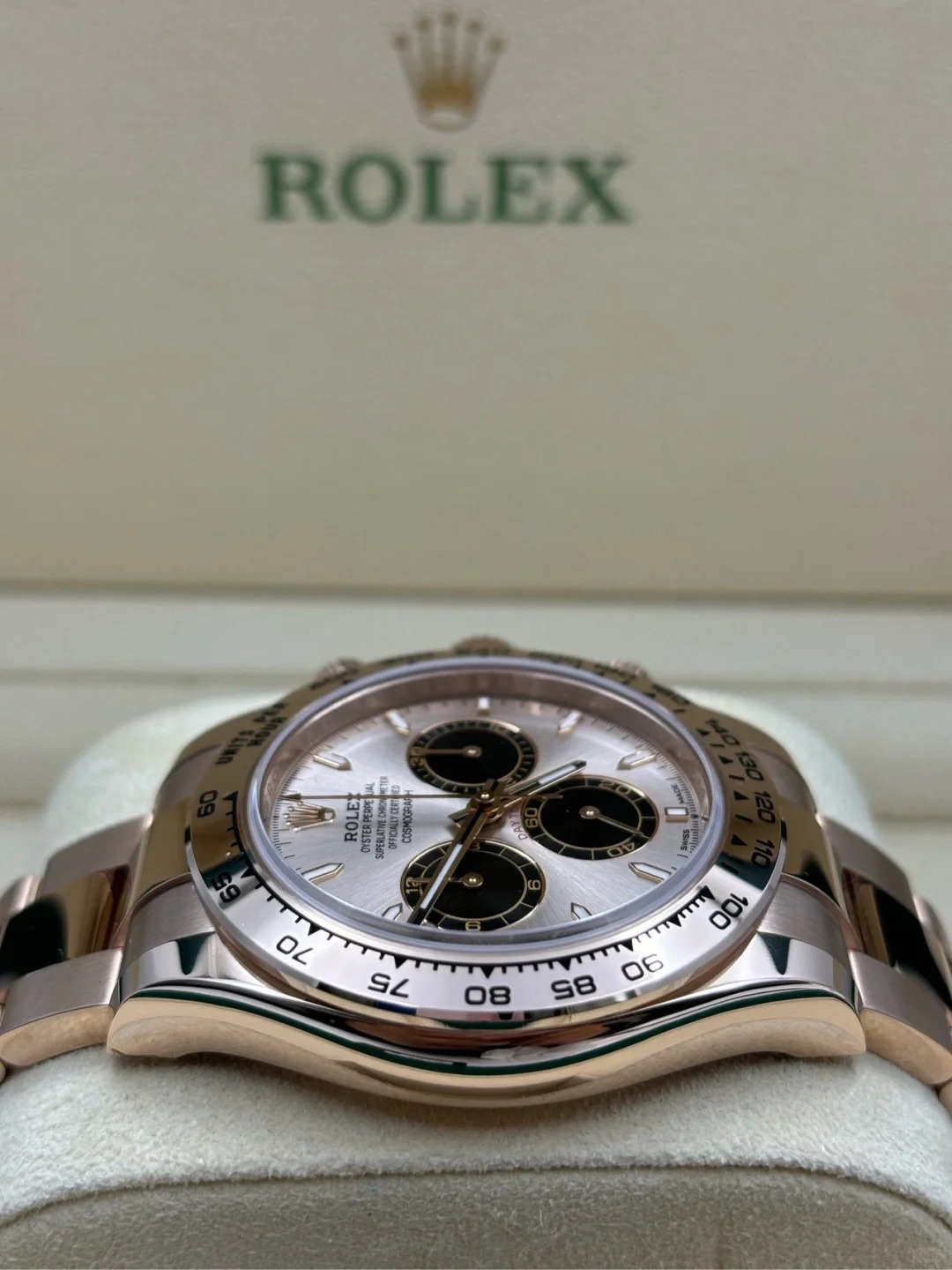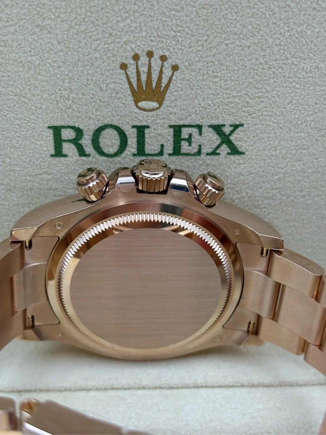 The Oyster Perpetual Cosmograph Daytona in 18 ct Everose gold features a sunrise gold and gloss black dial and an Oyster bracelet, with an engraved tachymeter on an 18-carat Everose gold bezel. -m126505-0003 40mm