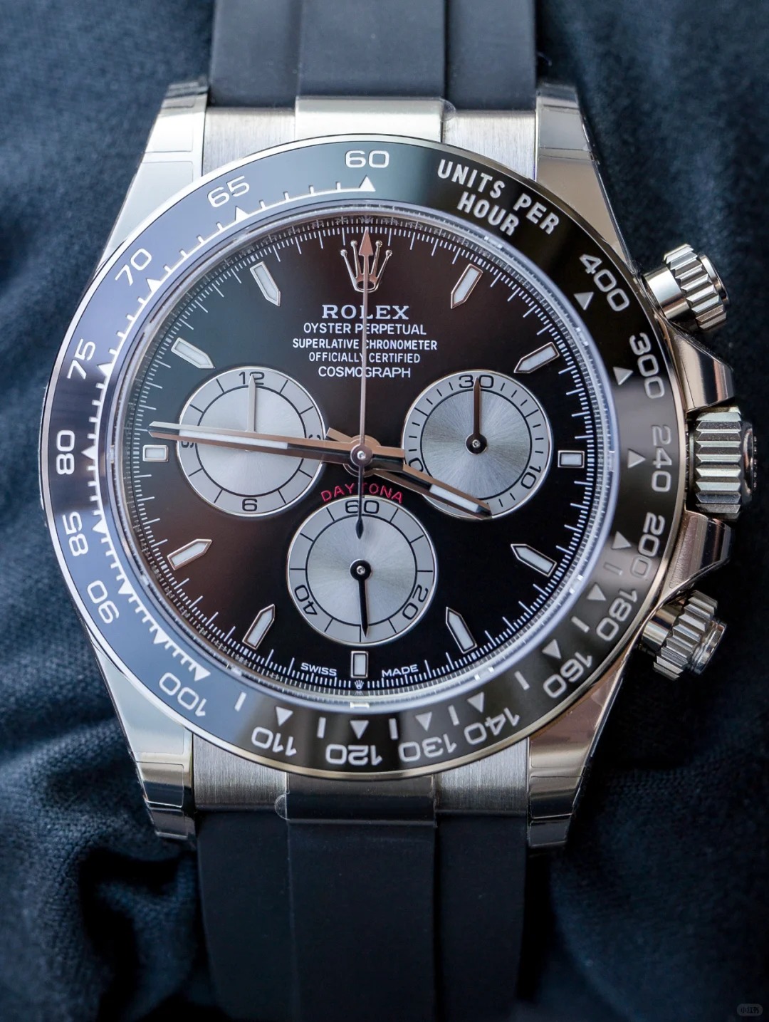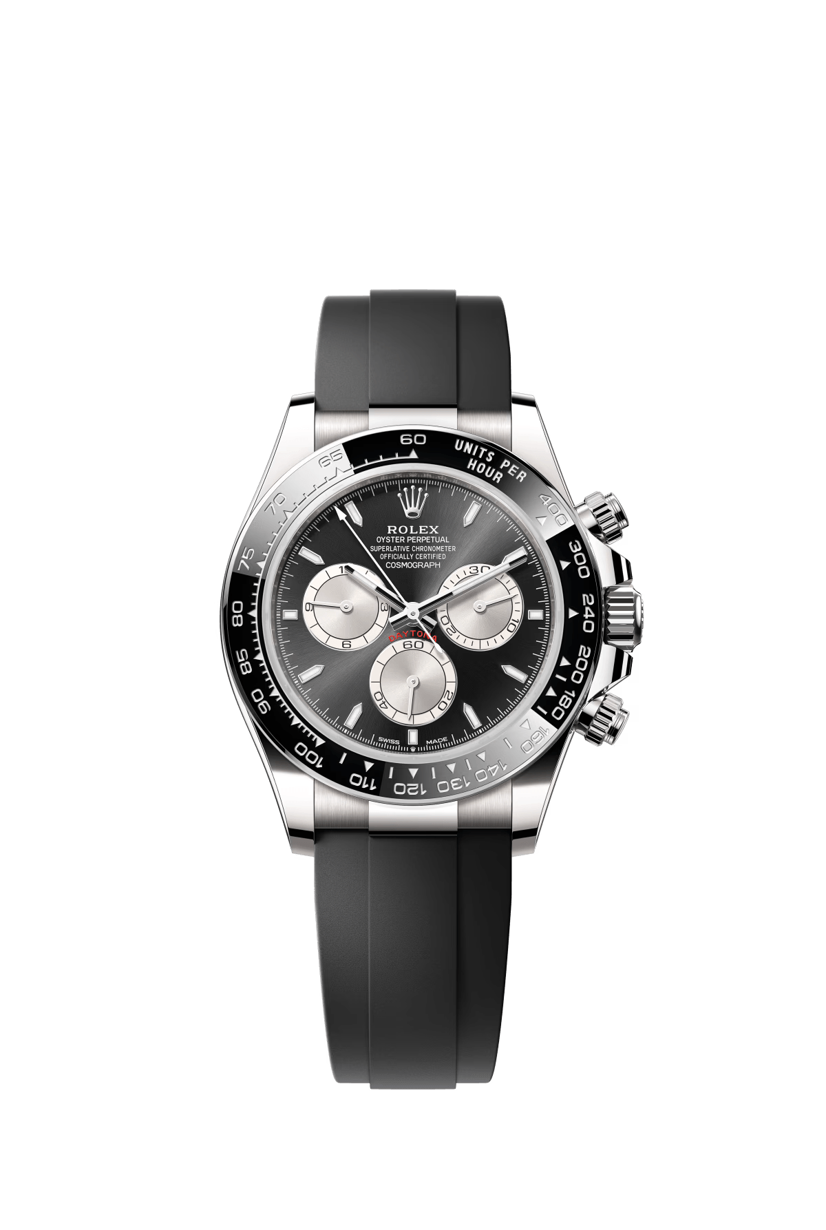 The Oyster Perpetual Cosmograph Daytona in 18K white gold features a glossy black and stainless steel dial and an Oysterflex bracelet with a black Cerachrom bezel with tachymeter. -m126519ln-0002 40mm