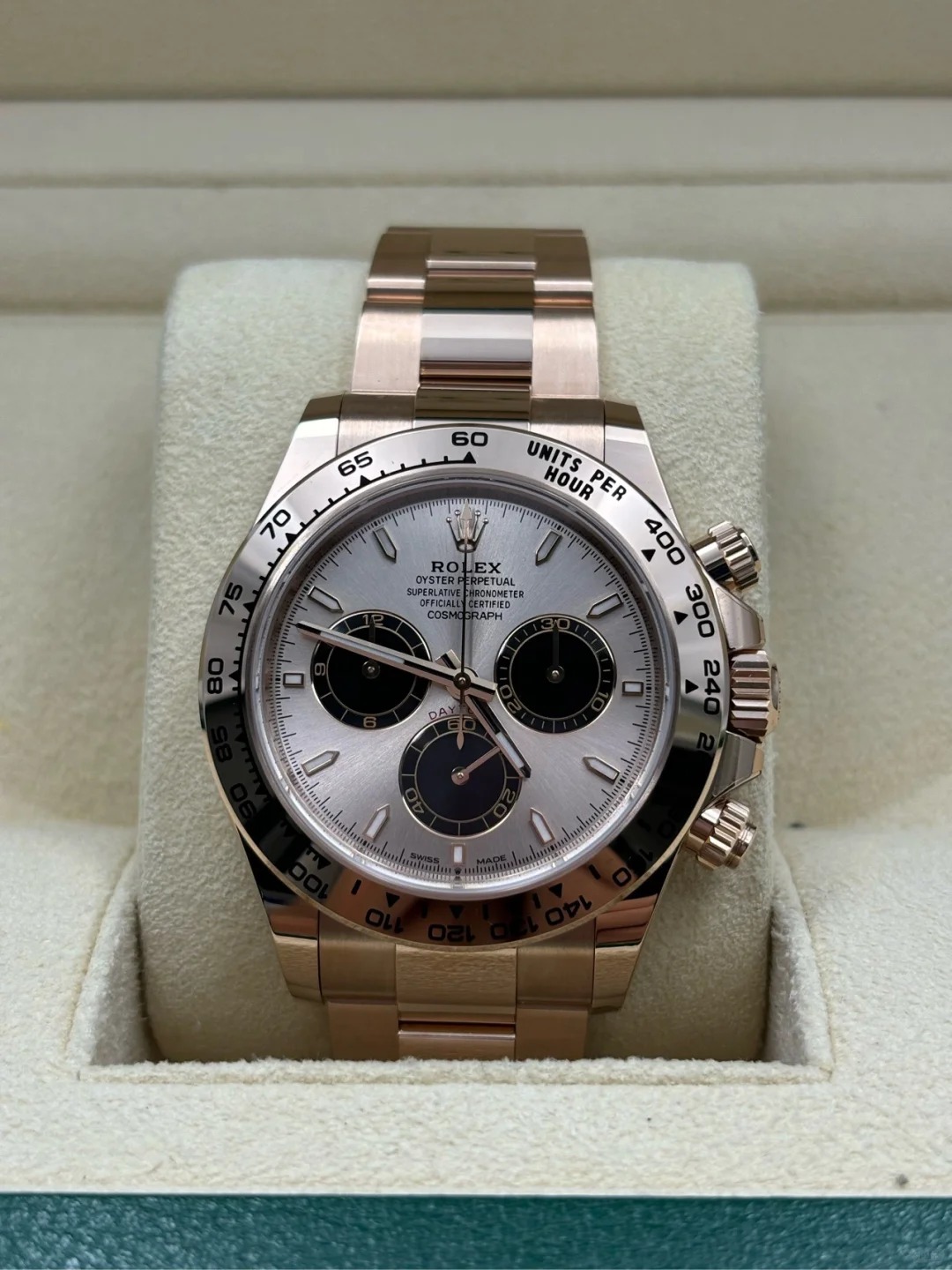 The Oyster Perpetual Cosmograph Daytona in 18 ct Everose gold features a glossy black and sunrise gold dial and an Oyster bracelet with an engraved tachymeter on an 18-carat Everose gold bezel. -m126505-0001 40mm