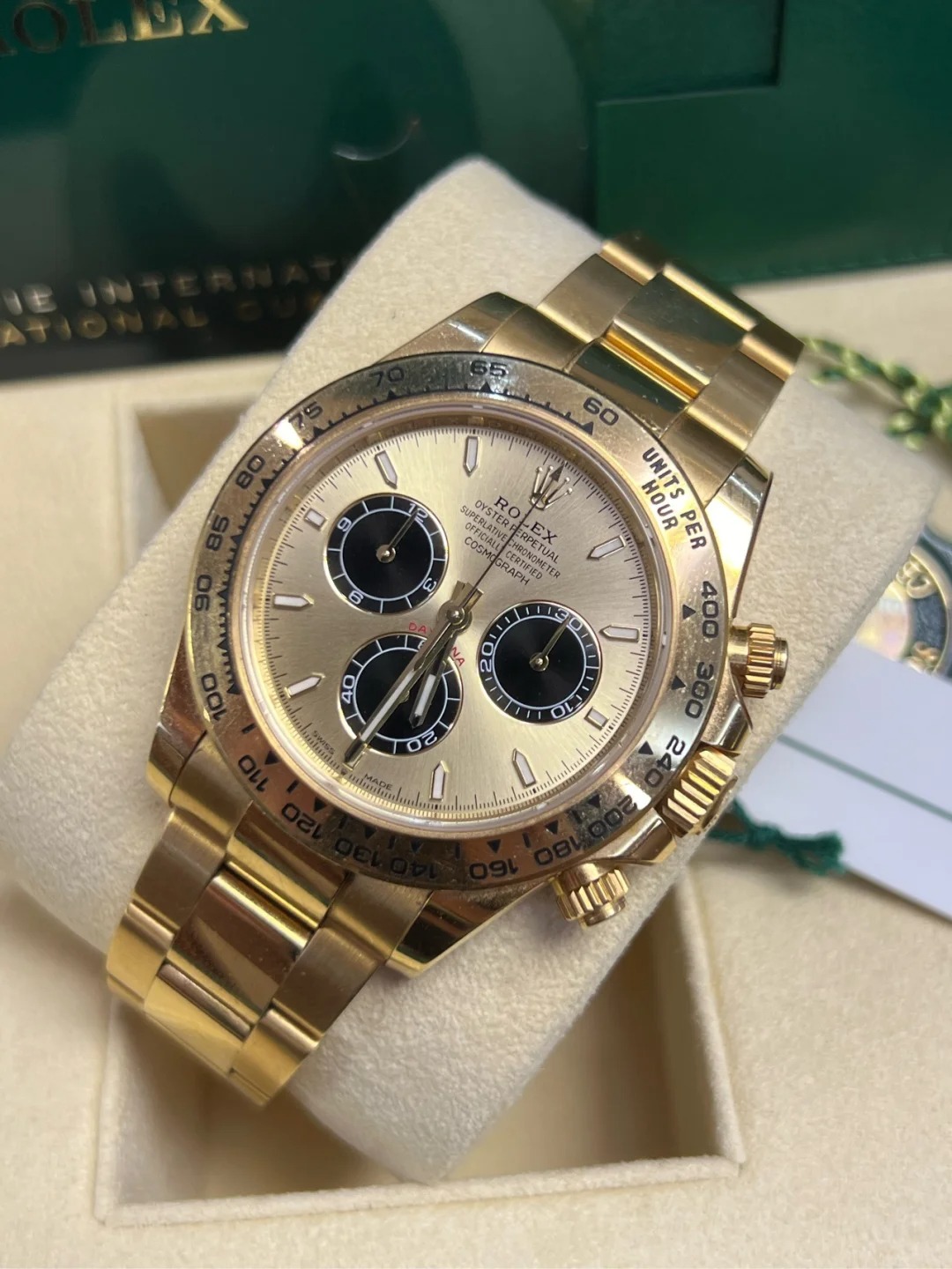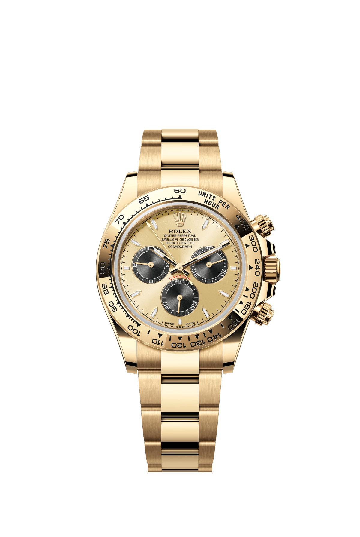The Oyster Perpetual Cosmograph Daytona in 18 ct yellow gold with a mellow black and champagne dial and an Oyster bracelet with an engraved tachymeter on the 18-carat yellow gold bezel. -m126508-0002 40mm