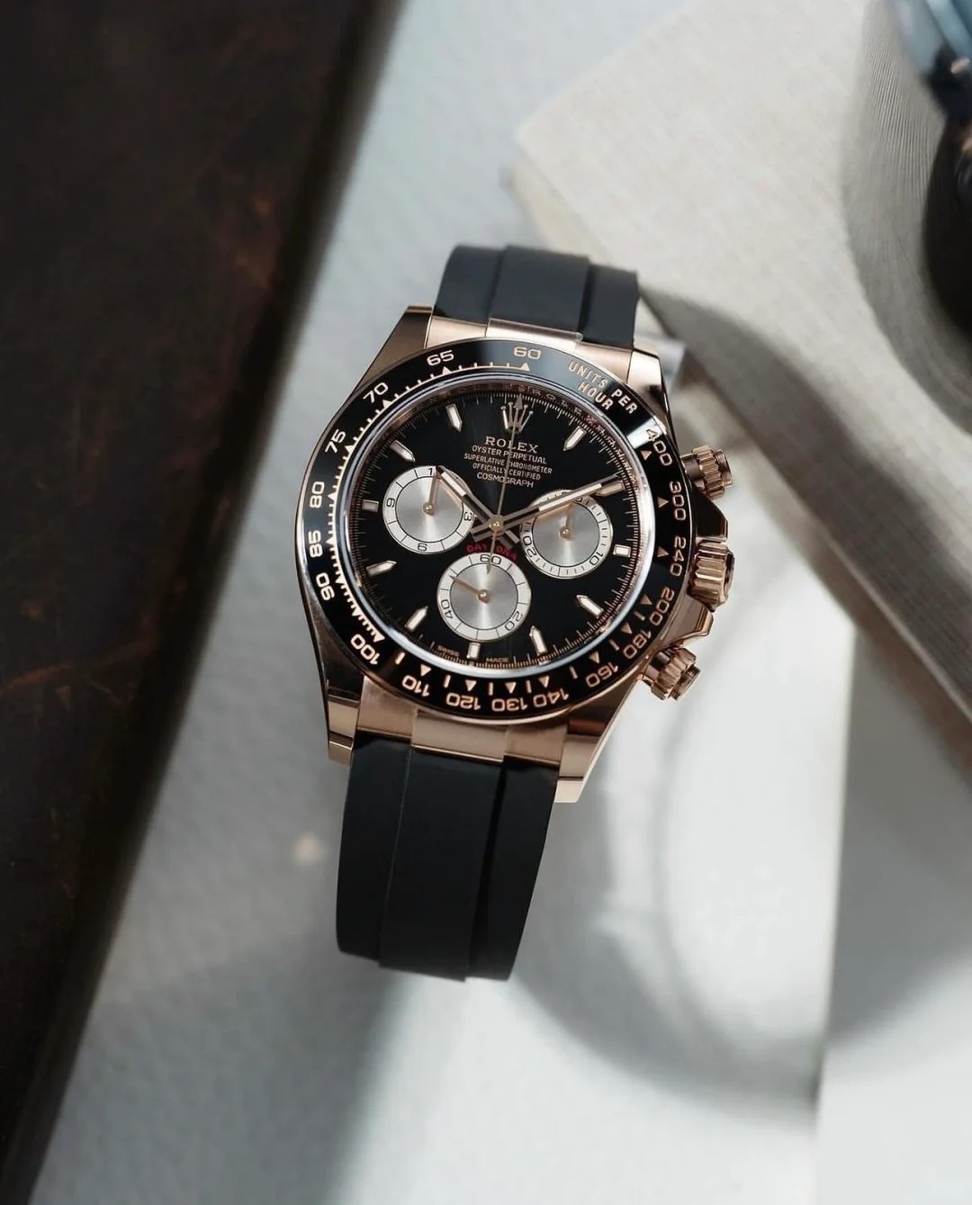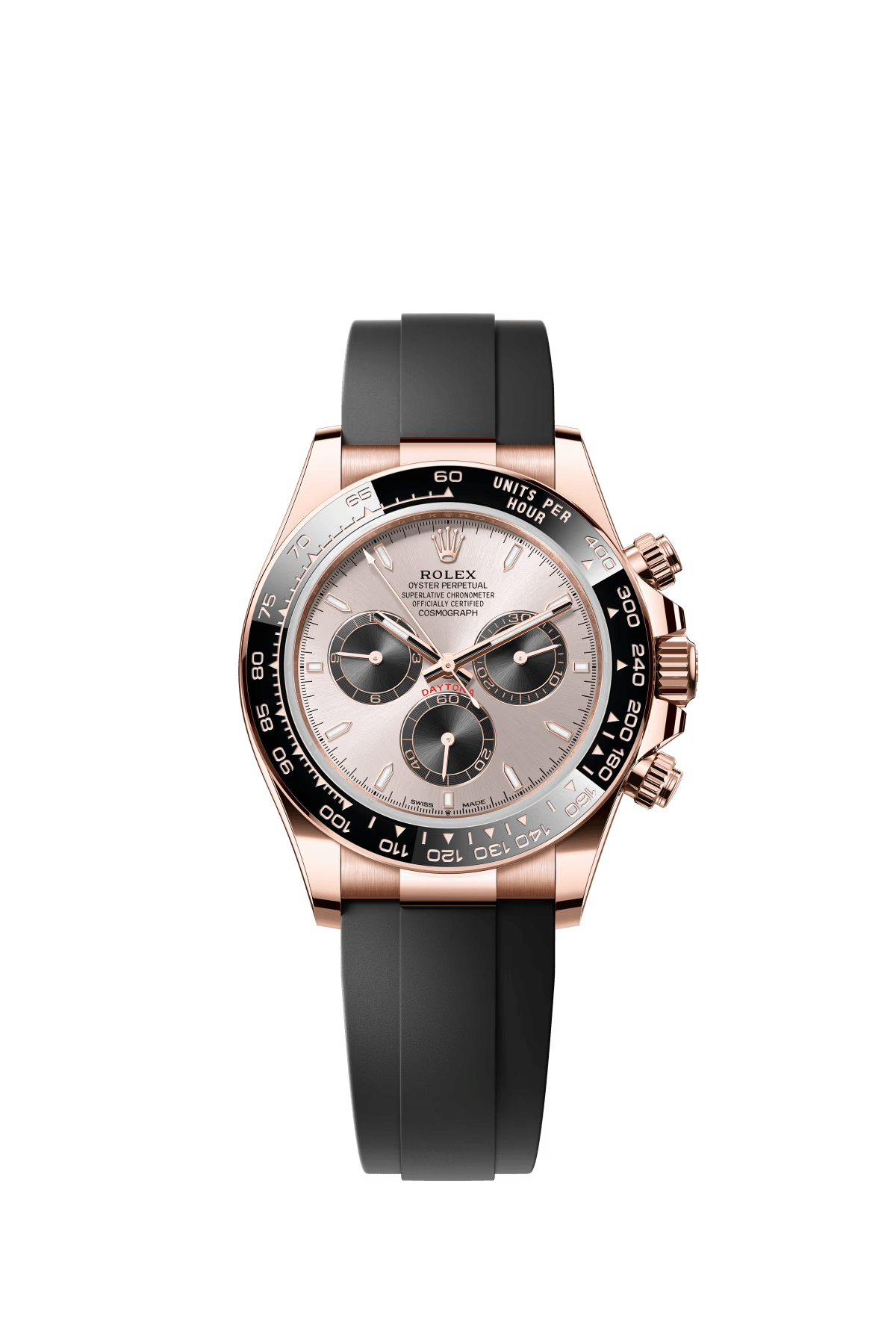The Oyster Perpetual Cosmograph Daytona in 18 ct Everose gold features a sunrise gold and gloss black dial and an Oysterflex strap with a black Cerachrom bezel with tachymeter. -m126515ln-0006 40mm