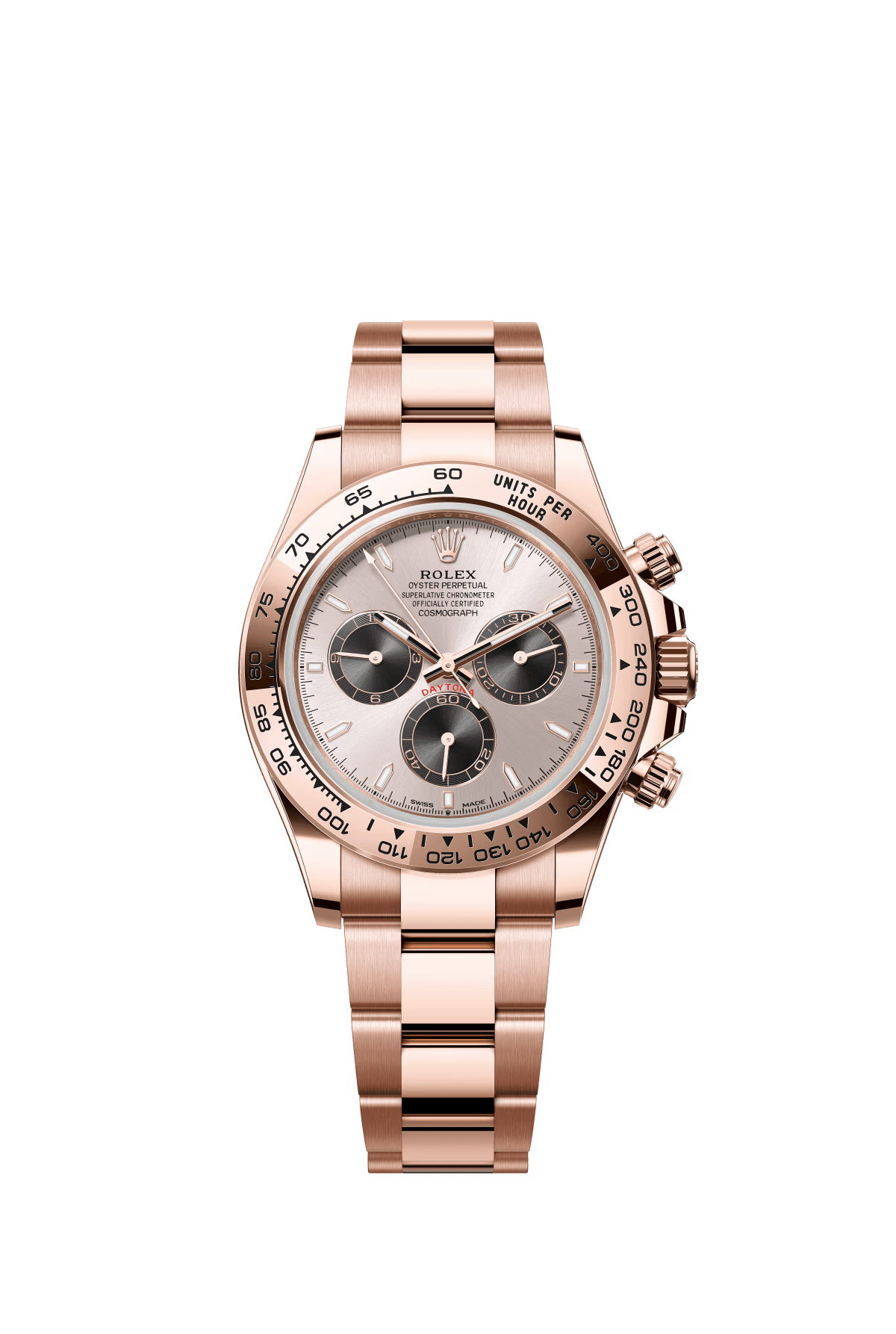 The Oyster Perpetual Cosmograph Daytona in 18 ct Everose gold features a sunrise gold and gloss black dial and an Oyster bracelet, with an engraved tachymeter on an 18-carat Everose gold bezel. -m126505-0003 40mm