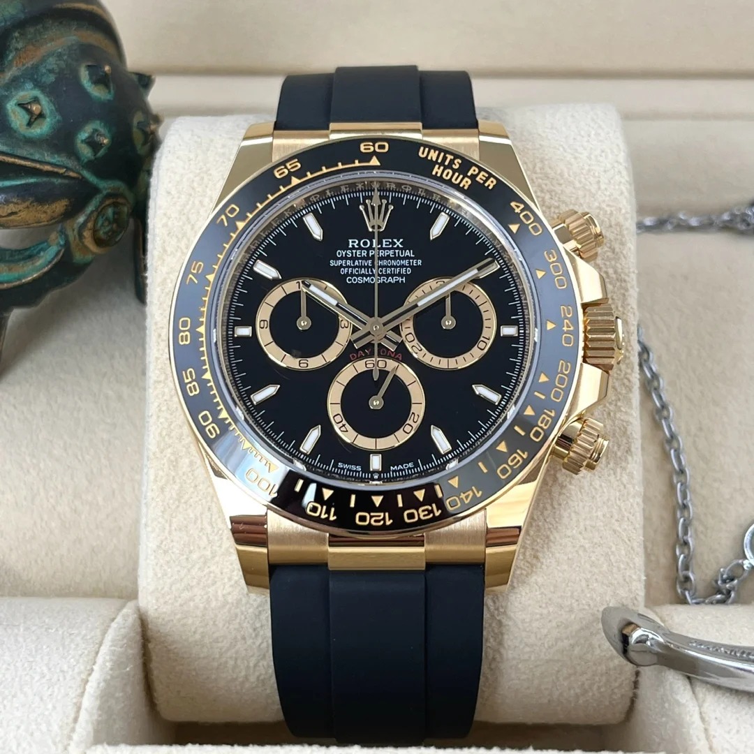The Oyster Perpetual Cosmograph Daytona in 18K yellow gold features a shiny black and gold diamond-set dial and an Oysterflex bracelet with a black Cerachrom bezel with a tachymeter. -m126518ln-0006 40mm