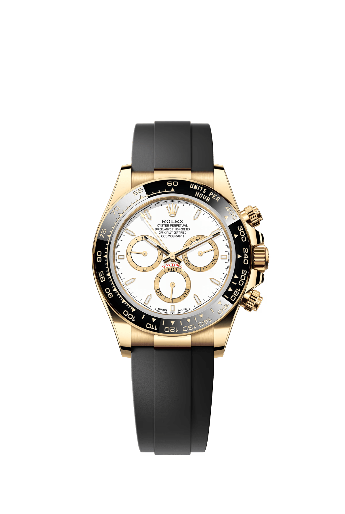 The Oyster Perpetual Cosmograph Daytona in 18 ct yellow gold with a white dial and contrasting counters. The watch is fitted with an Oysterflex strap with a tachymeter on a black Cerachrom bezel. -m126518ln-0002 40mm