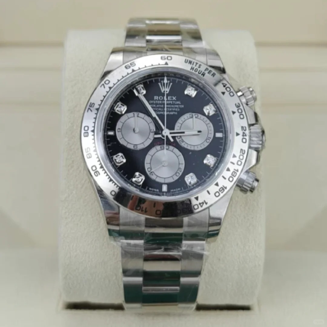 The Oyster Perpetual Cosmograph Daytona in 18K white gold features a diamond-set glossy black and stainless steel dial and Oyster bracelet with an engraved tachymeter on an 18K white gold bezel. -m126509-0002 40mm