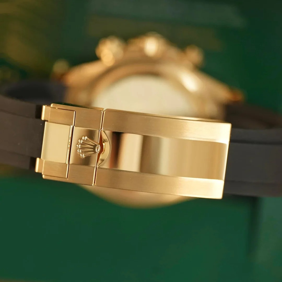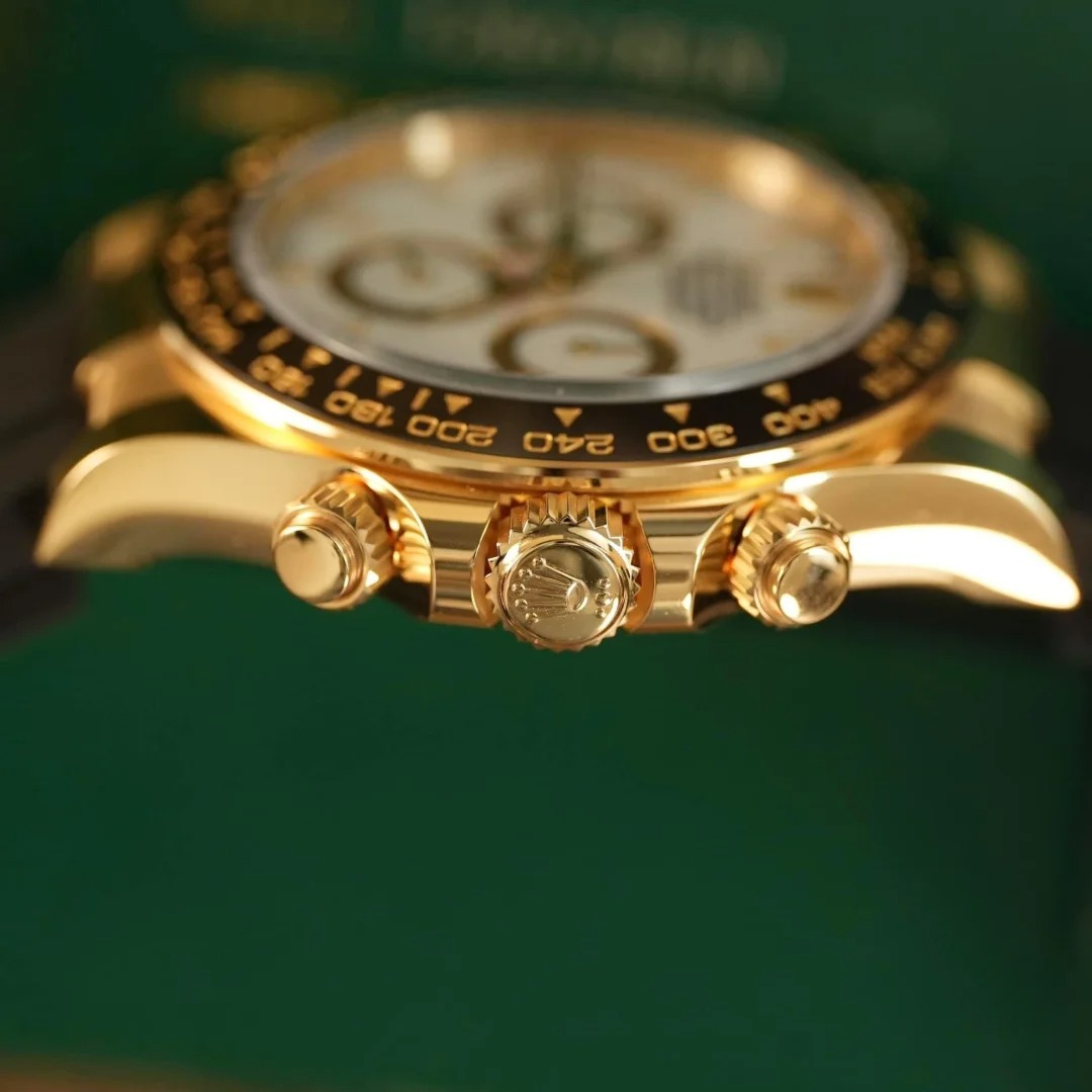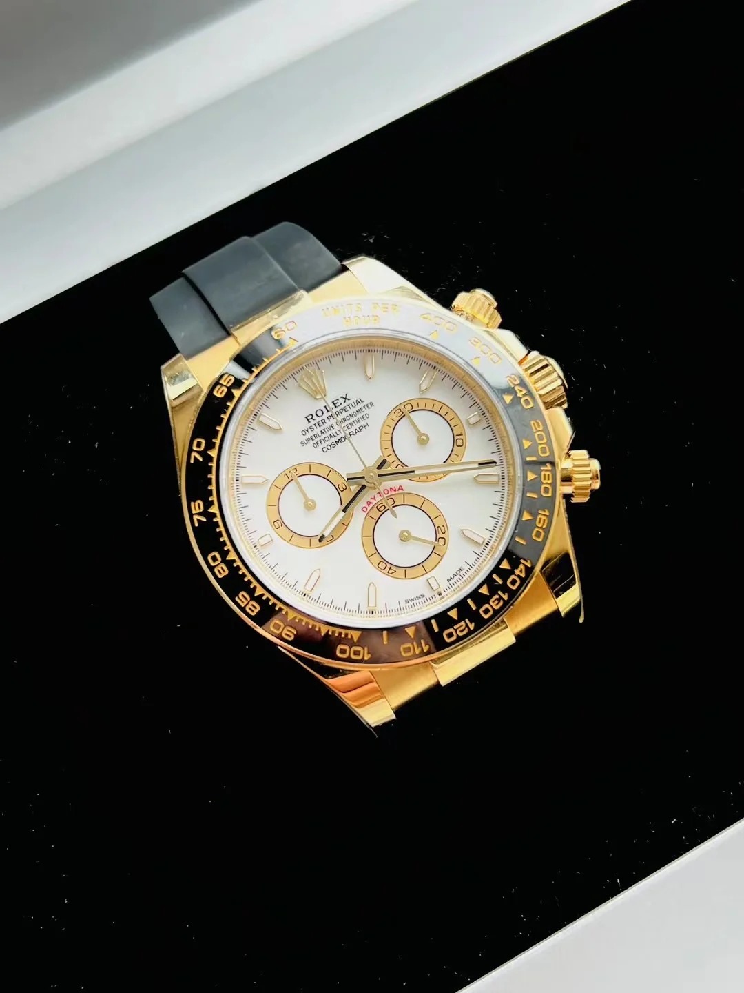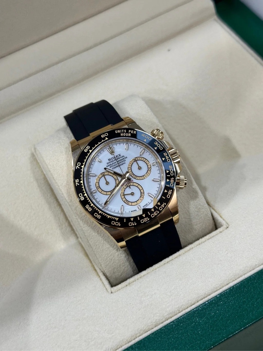 The Oyster Perpetual Cosmograph Daytona in 18 ct yellow gold with a white dial and contrasting counter rings. It features an Oysterflex bracelet and a black Cerachrom bezel with tachymetric scale.