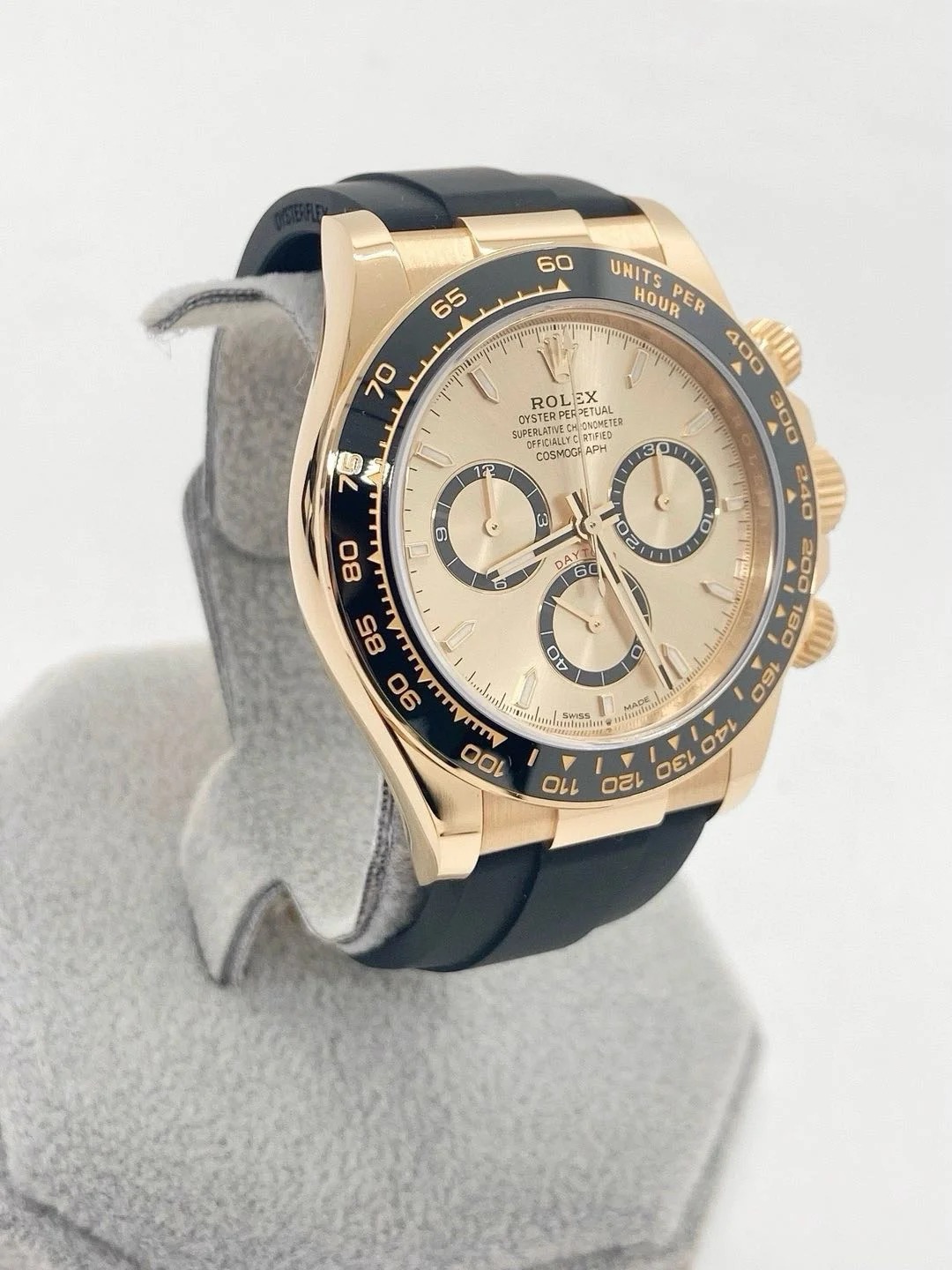 The Oyster Perpetual Cosmograph Daytona in 18 ct yellow gold with a golden dial and contrasting counter rings. It features an Oysterflex bracelet and a black Cerachrom bezel with tachymetric scale.