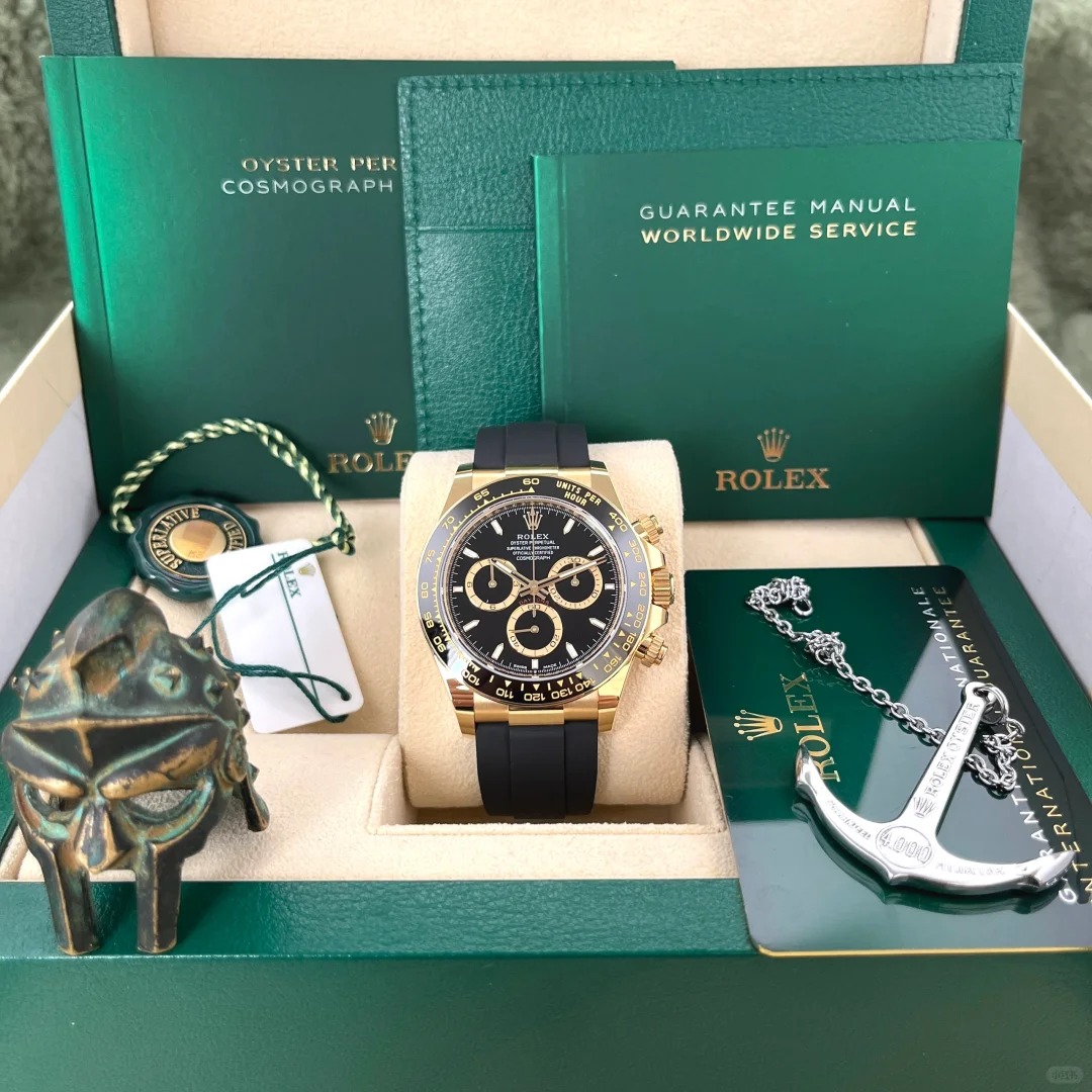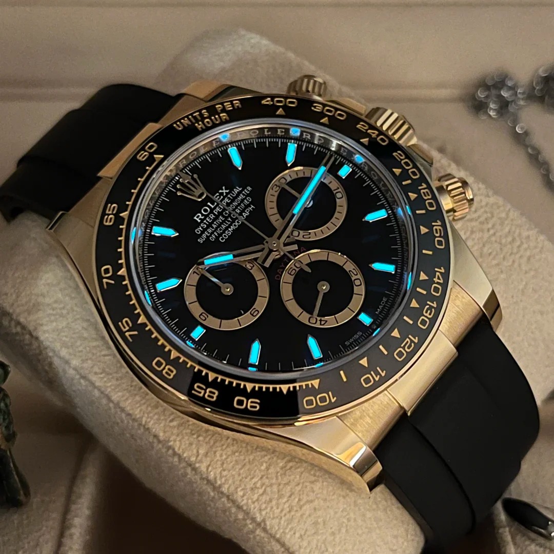 The Oyster Perpetual Cosmograph Daytona in 18 ct yellow gold with a black dial and contrasting counter rings. It features an Oysterflex bracelet and a black Cerachrom bezel with tachymetric scale. The Oysterflex Bracelet