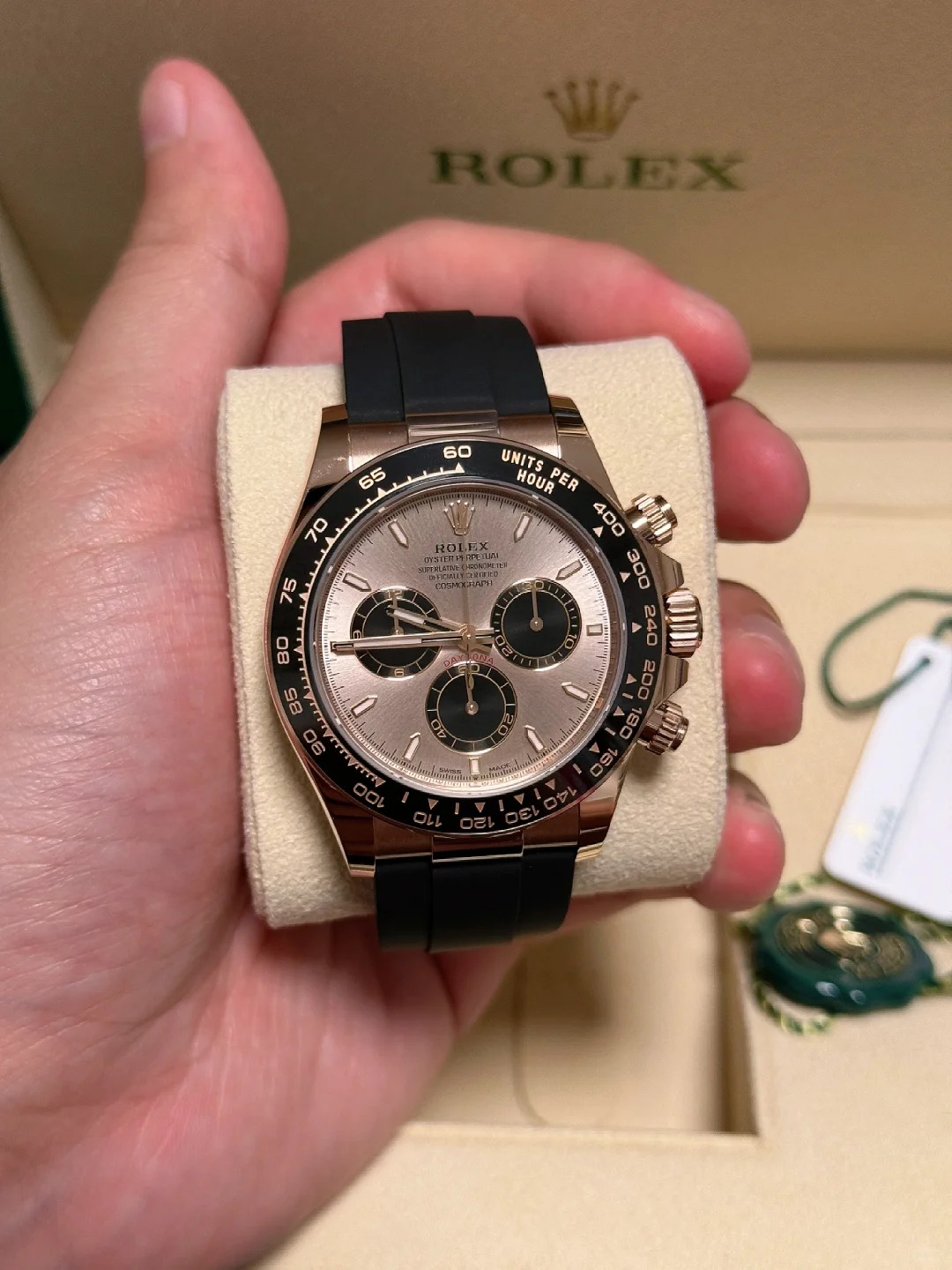• The Oyster Perpetual Cosmograph Daytona in 18 ct Everose gold features a diamond-set gloss black and sunrise gold dial and an Oysterflex bracelet, while a black Cerachrom bezel with tachymeter meter. -m126515ln-0004 40mm