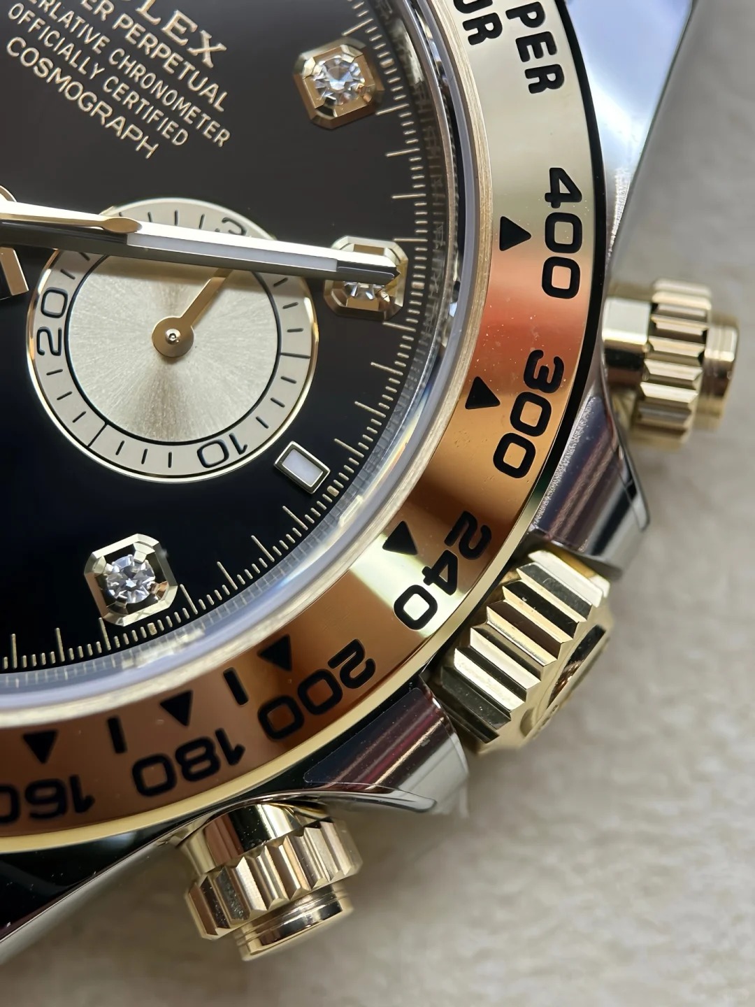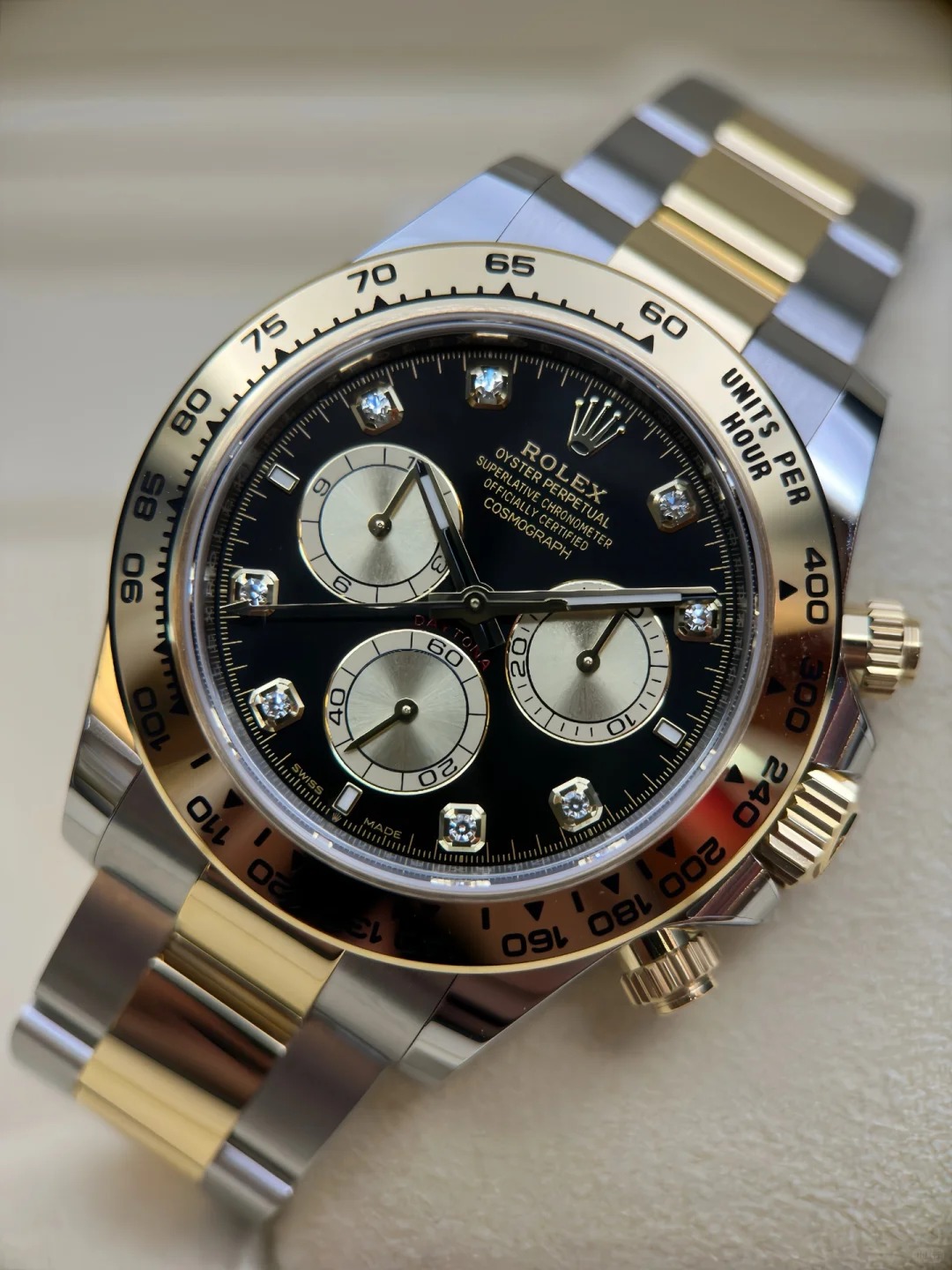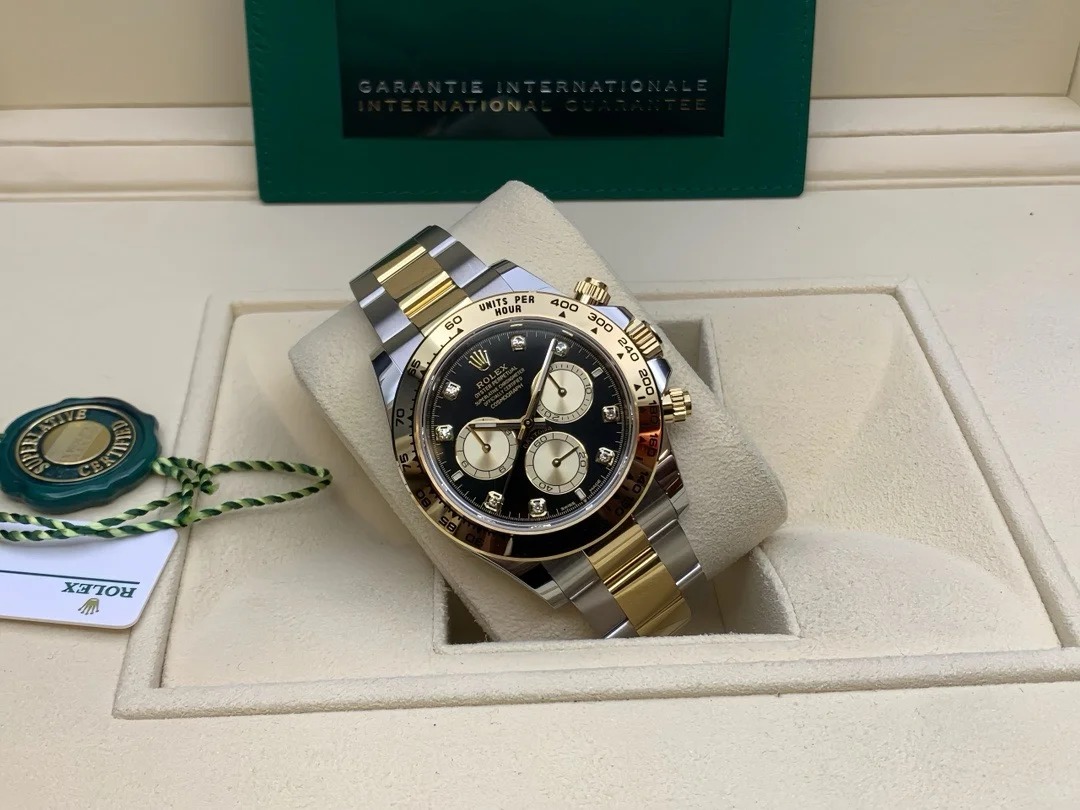 The Oyster Perpetual Cosmograph Daytona in yellow gold and Oystersteel features a diamond-set shiny black and gold dial and an Oyster bracelet with a tachymeter engraved on a yellow gold bezel. -m126503-0002 40mm