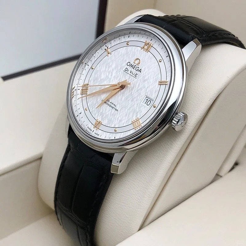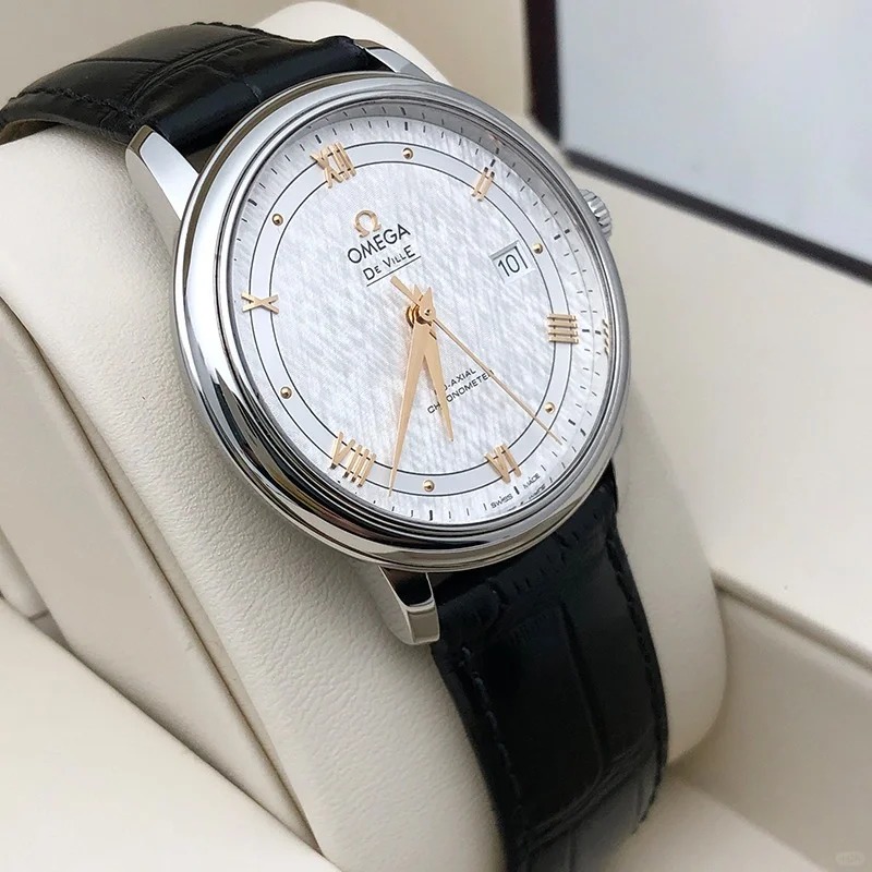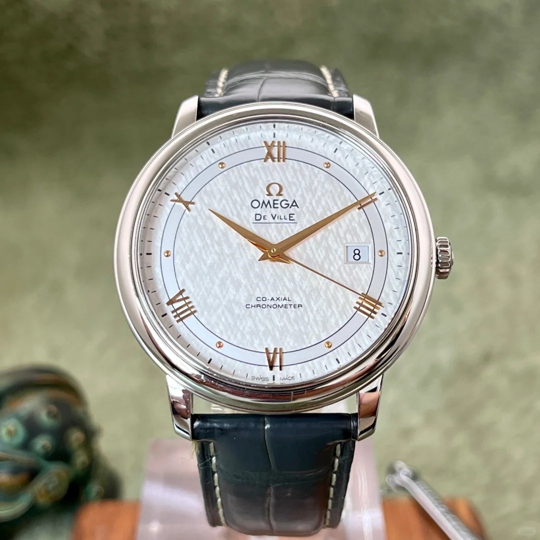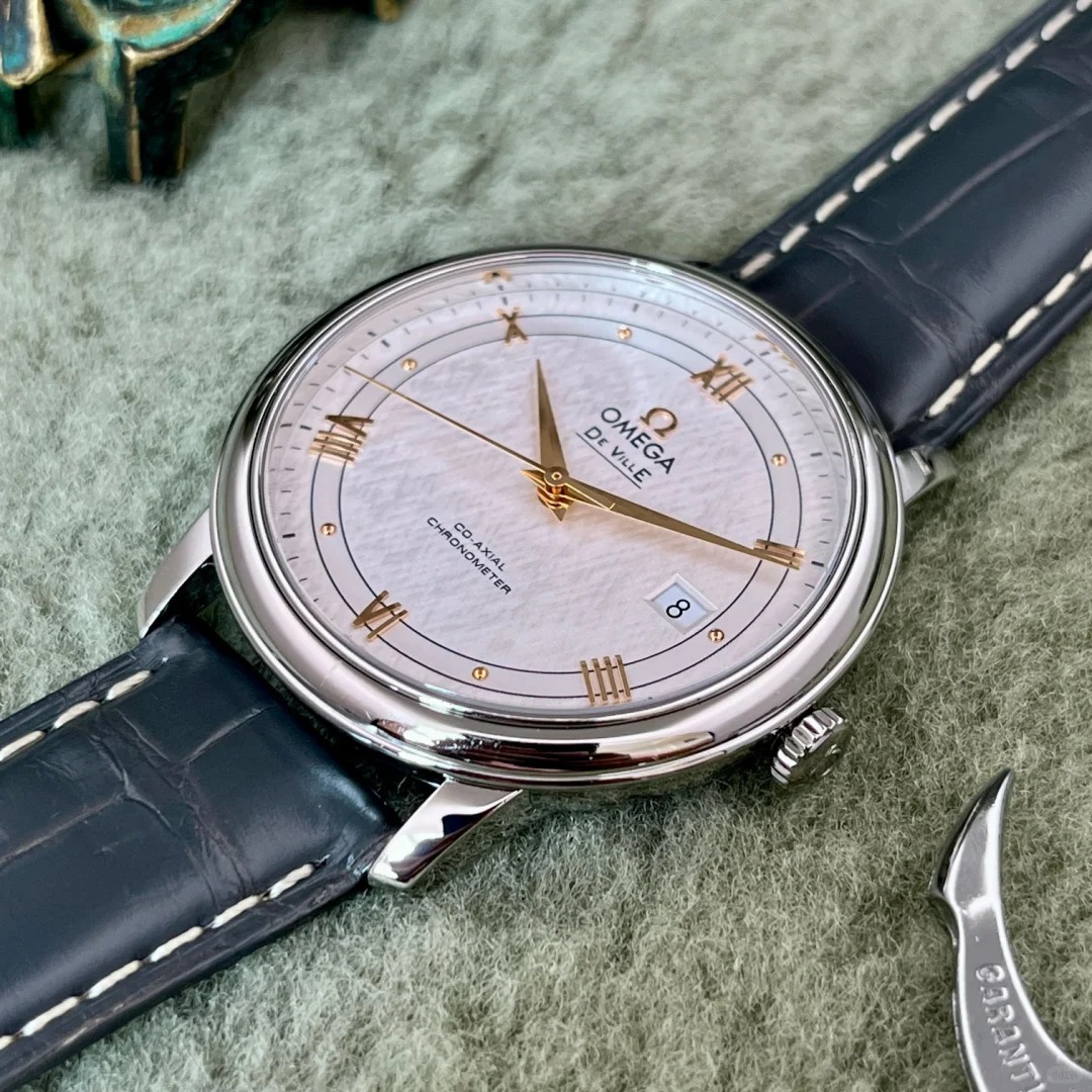Presented on a grey leather strap, this De Ville Prestige watch is powered by the OMEGA Co-Axial calibre 2500.