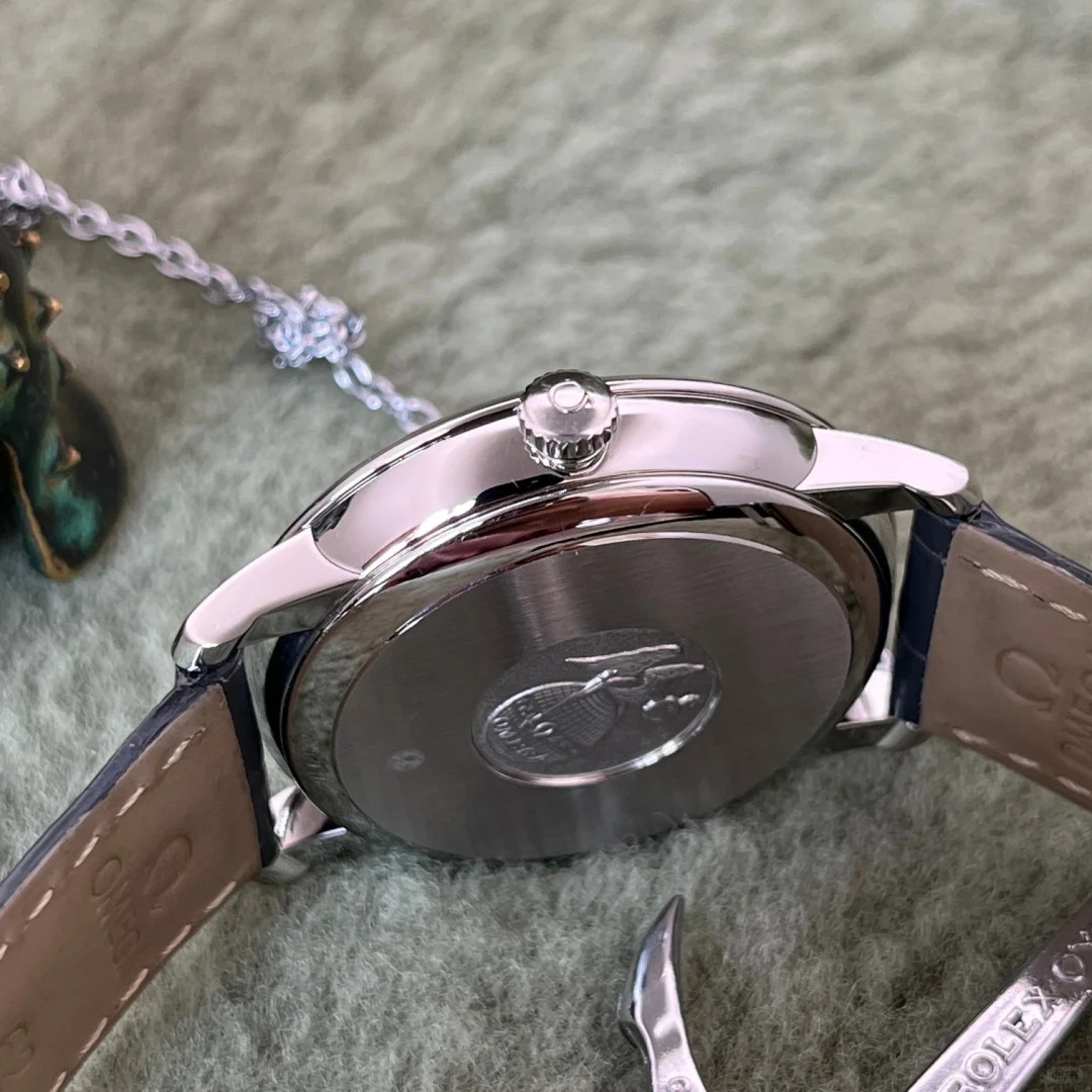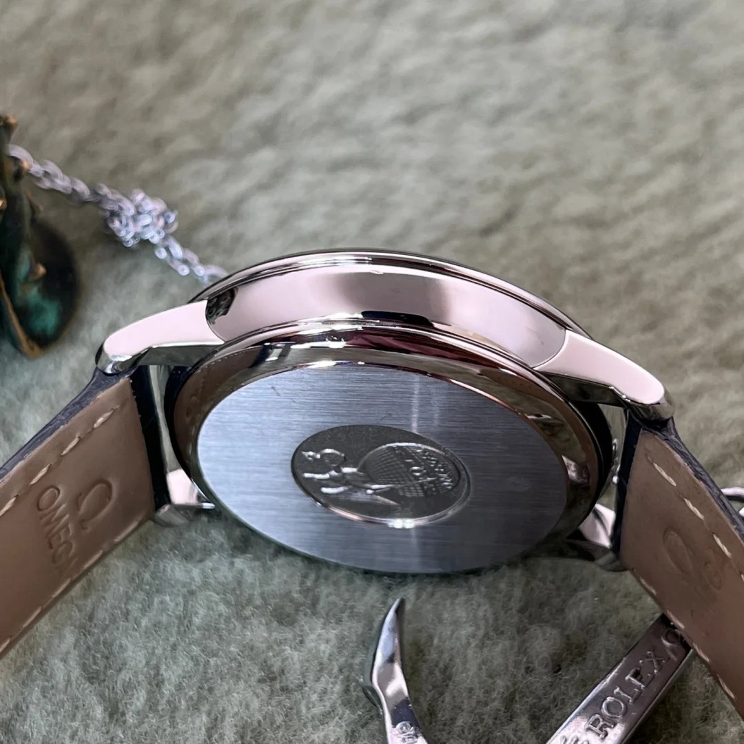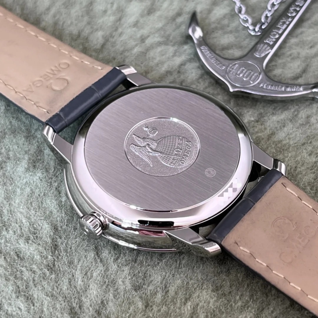 Presented on a grey leather strap, this De Ville Prestige watch is powered by the OMEGA Co-Axial calibre 2500.