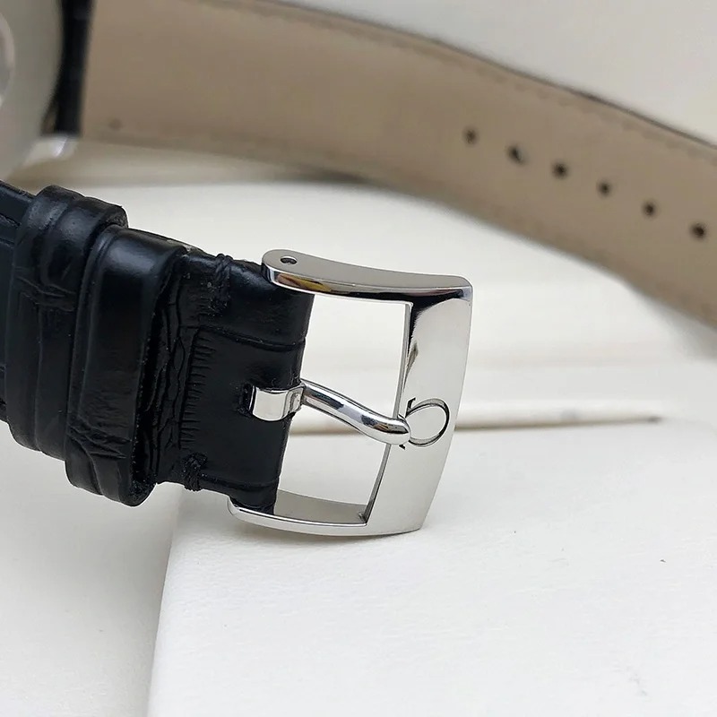 Housed in a stainless steel case, the elegant hour markers are made up of gold-plated cabochon indexes and polished domed Roman numerals, while the date window at 3 o'clock is located. The domed hour and minute hands are gold-plated and diamond-polished.
