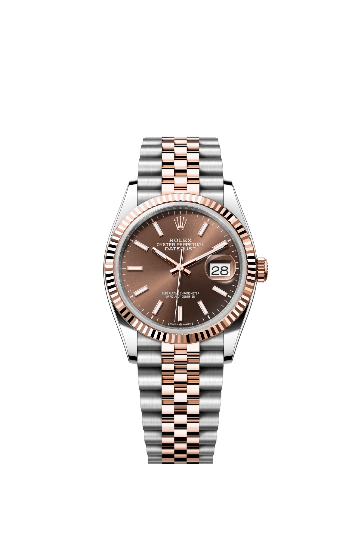 The Oyster Perpetual Datejust 36 is available in Everose gold and Oysteel with a chocolate-coloured dial and an Oyster bracelet. -m126281rbr-0032