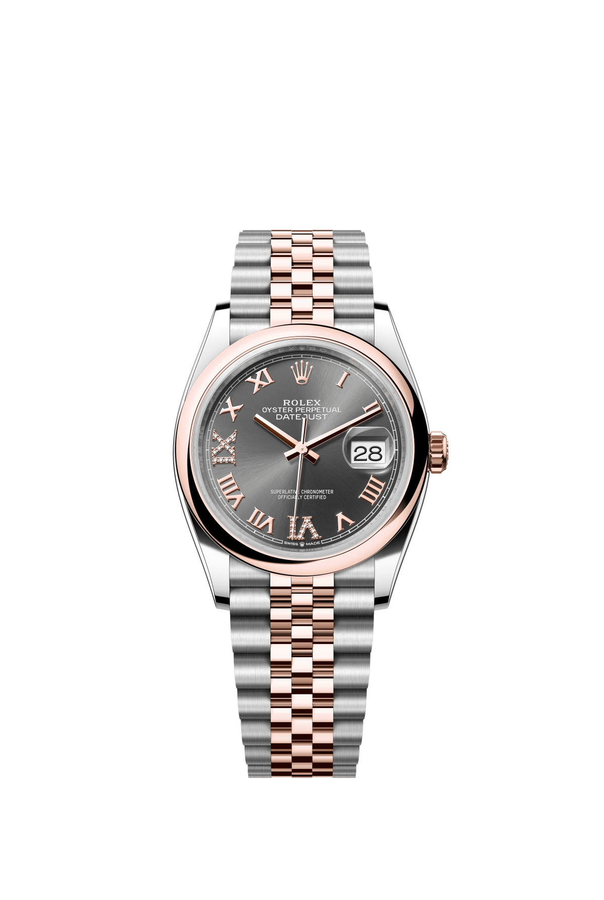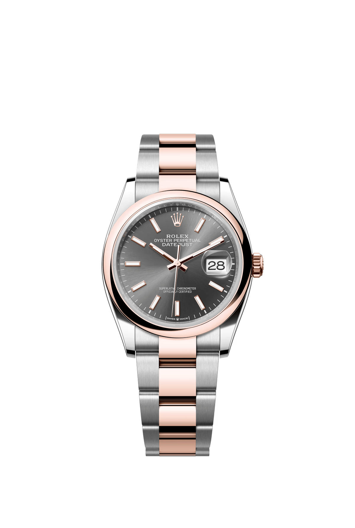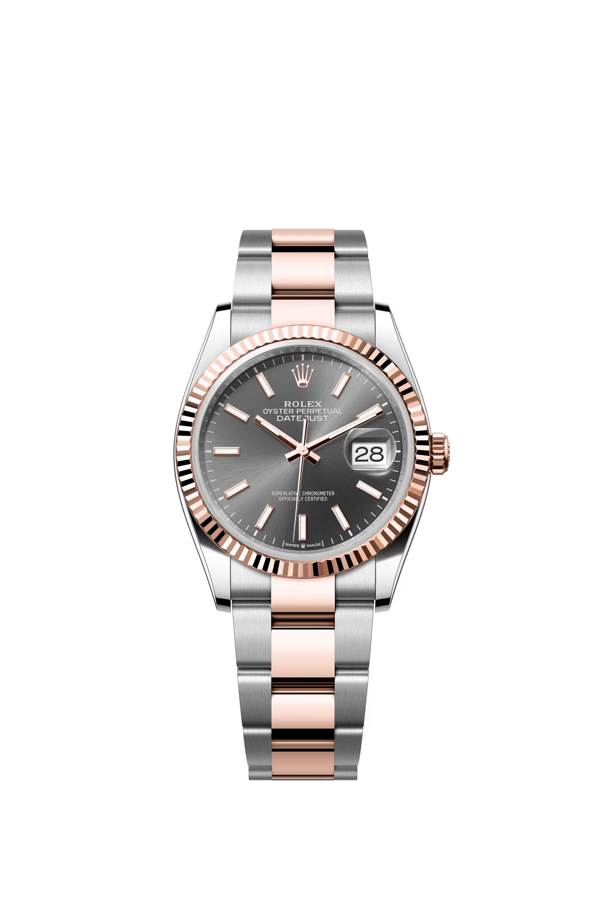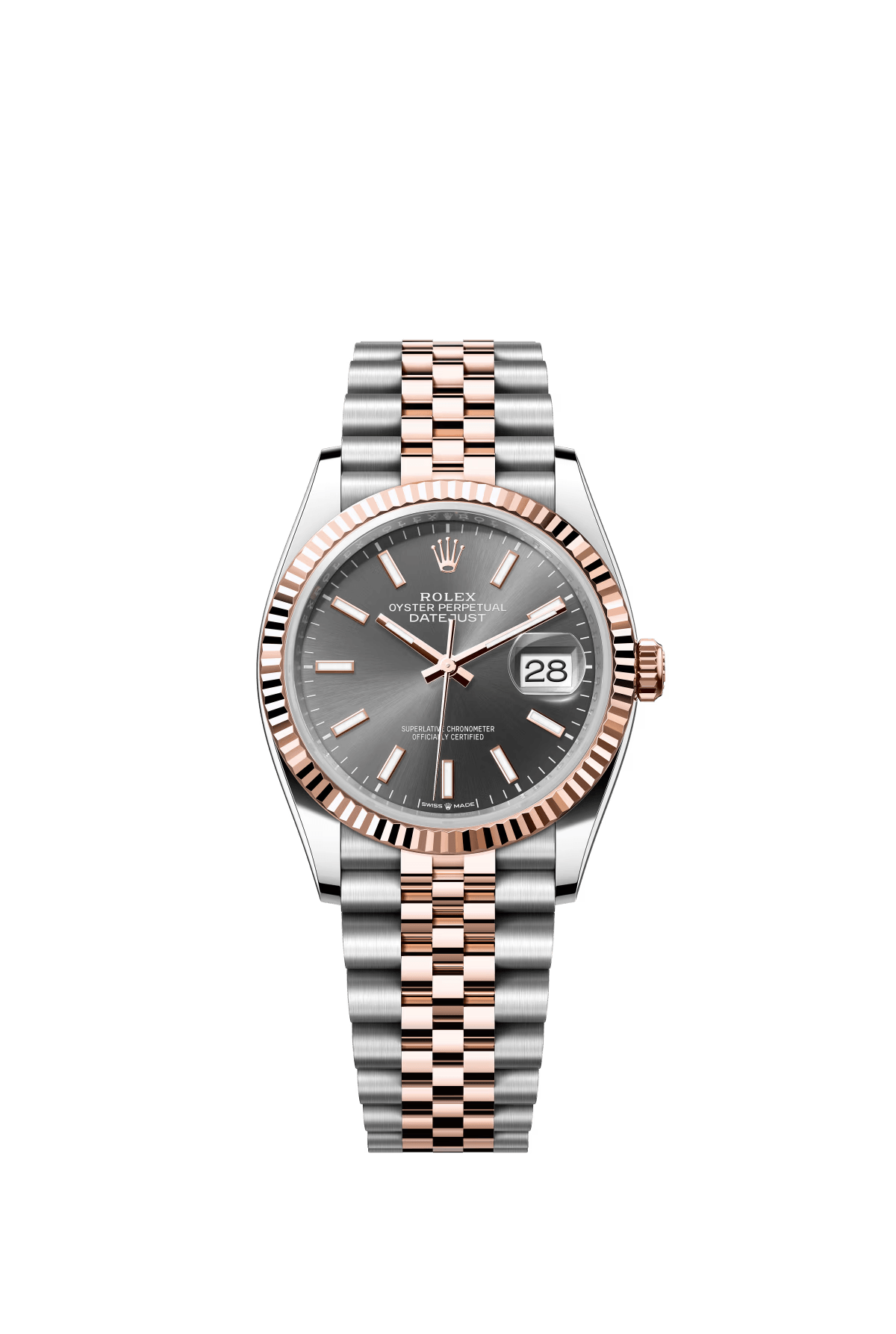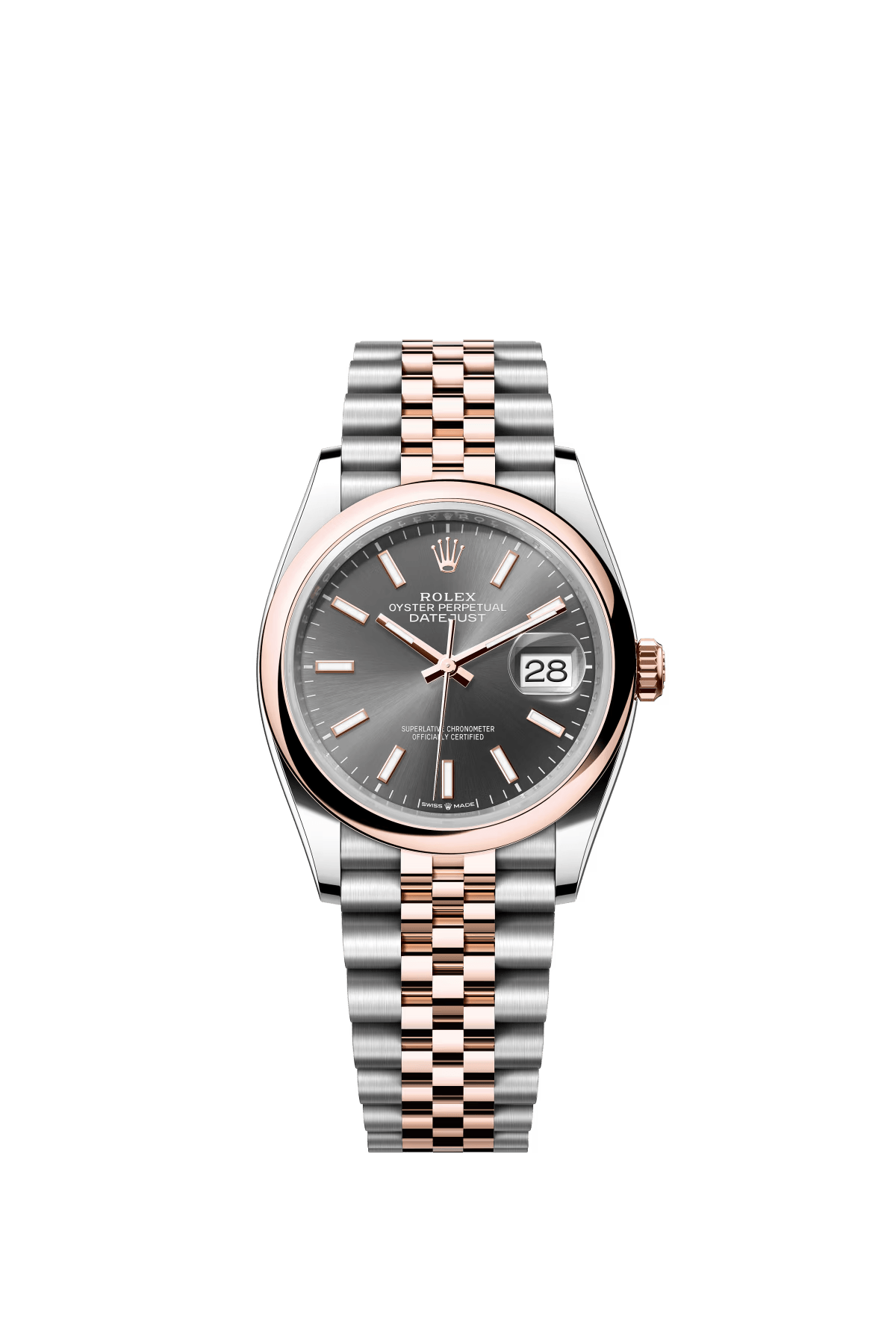 The Oyster Perpetual Datejust 36 is available in Everose gold and Oystersteel, with a slate grey dial and an Oyster bracelet. -m126231-0030
