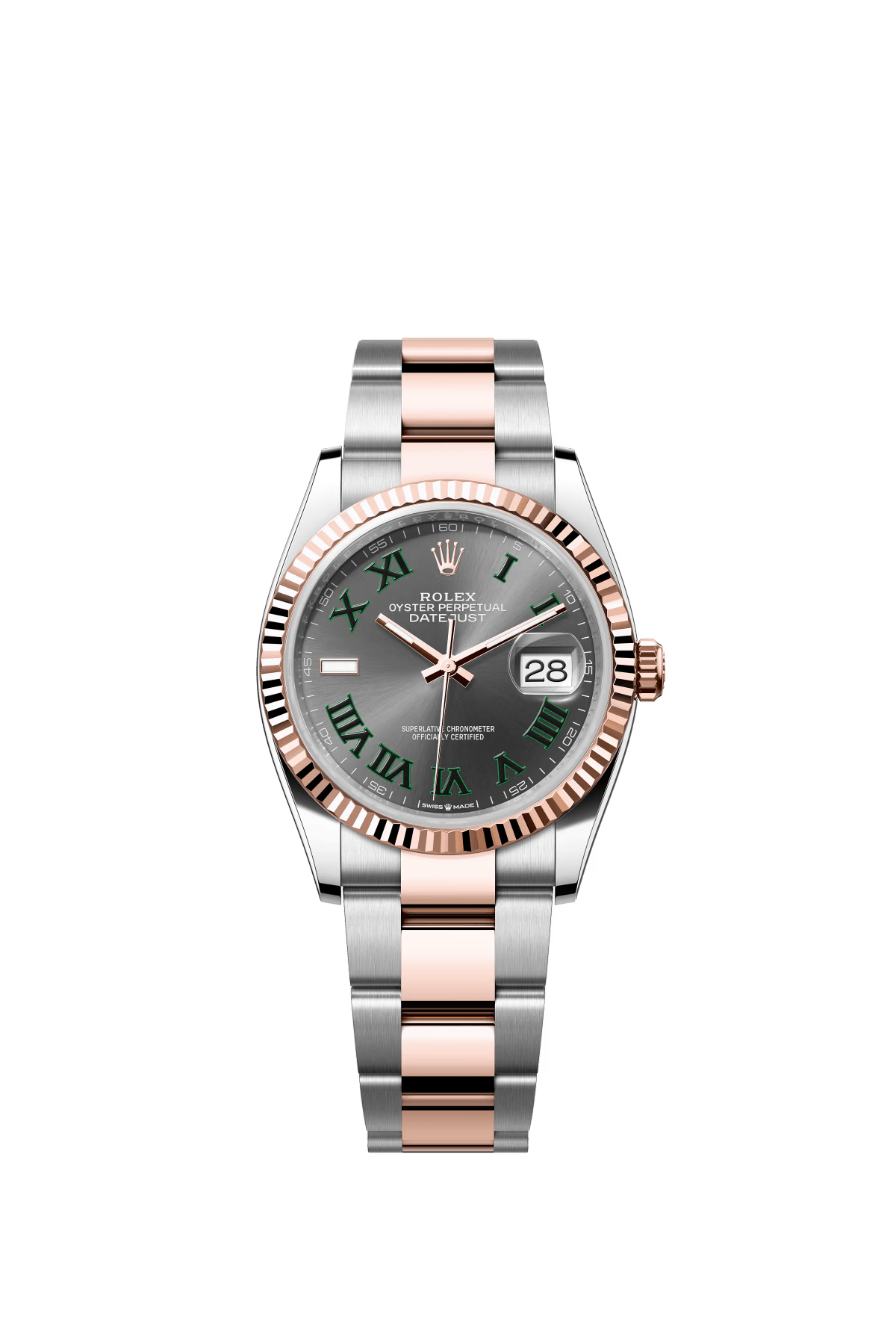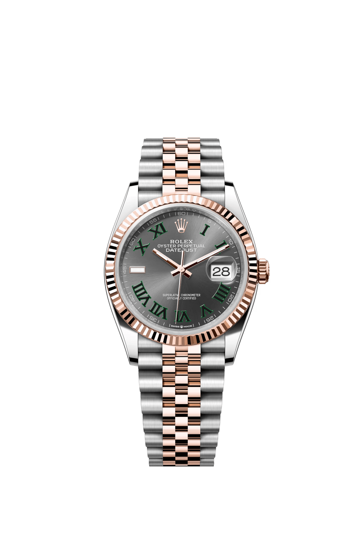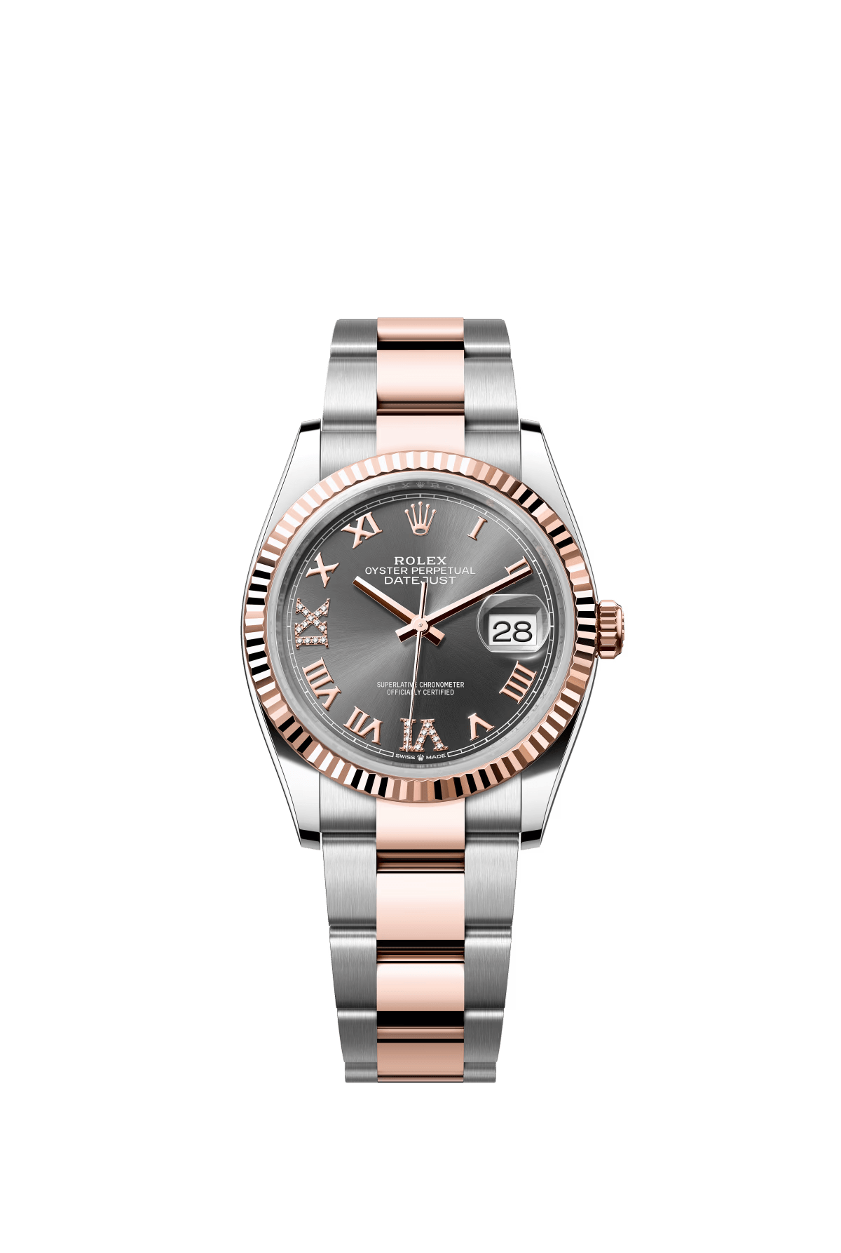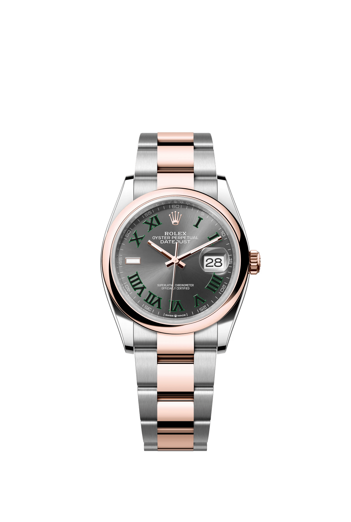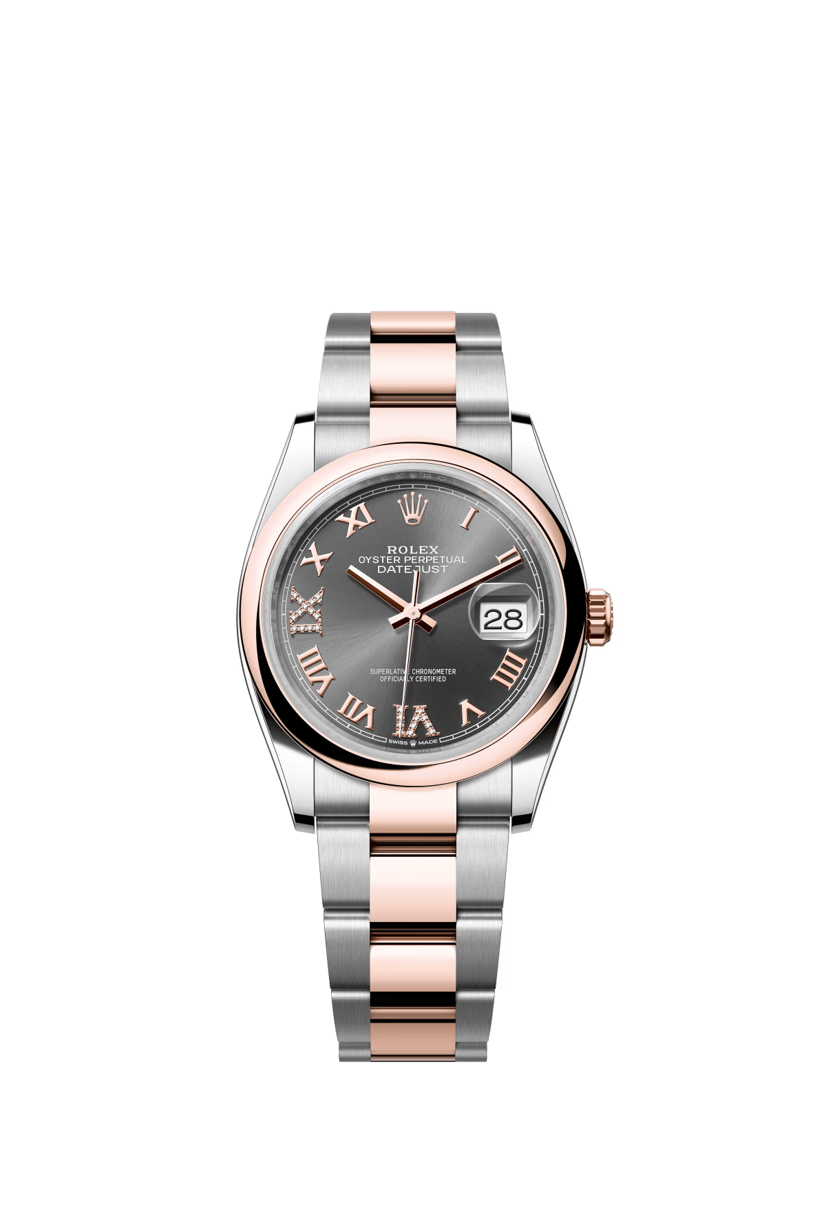 The Oyster Perpetual Datejust 36 is available in Everose gold and Oystersteel, with a slate grey dial and an Oyster bracelet. -m126231-0030