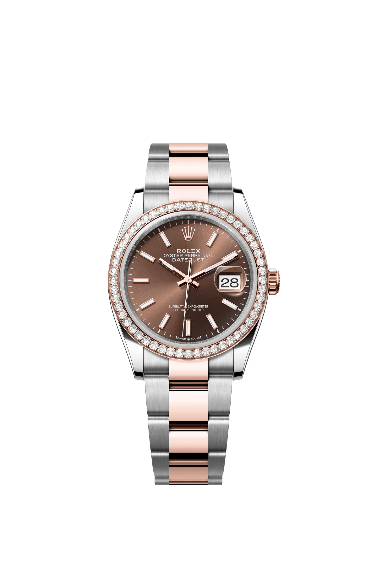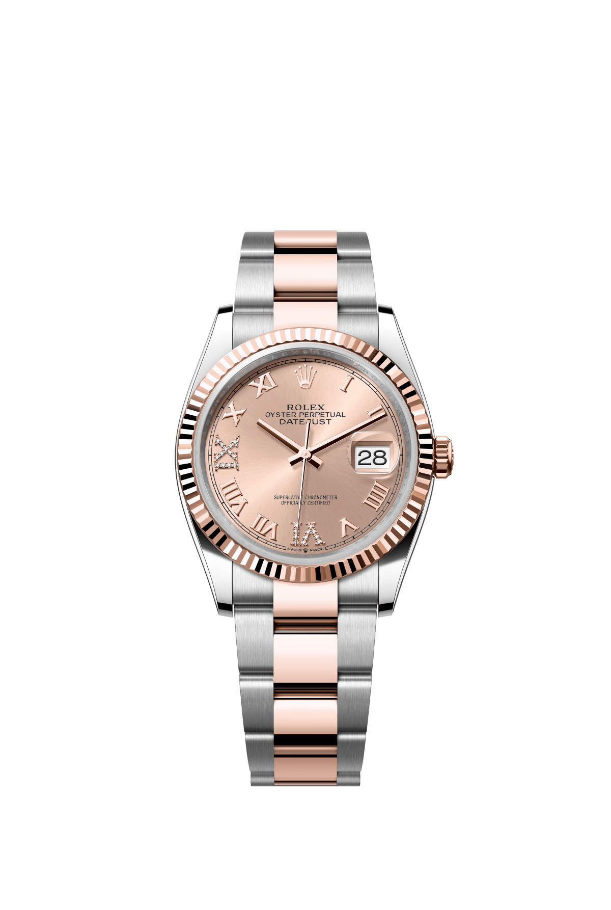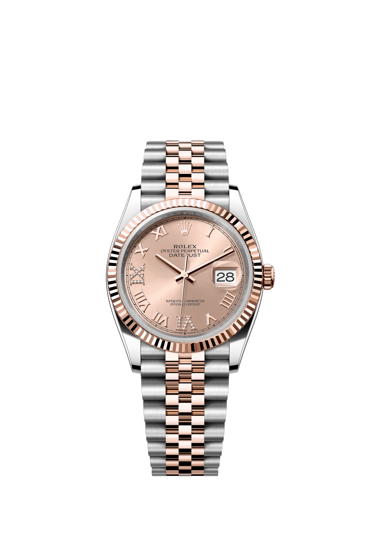 The Oyster Perpetual Datejust 36 is available in Everose gold and Oysteel with a rose gold-tone diamond-set dial and an Oyster bracelet. -m126231-0028