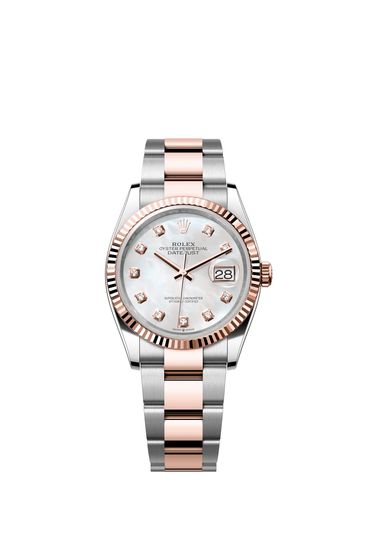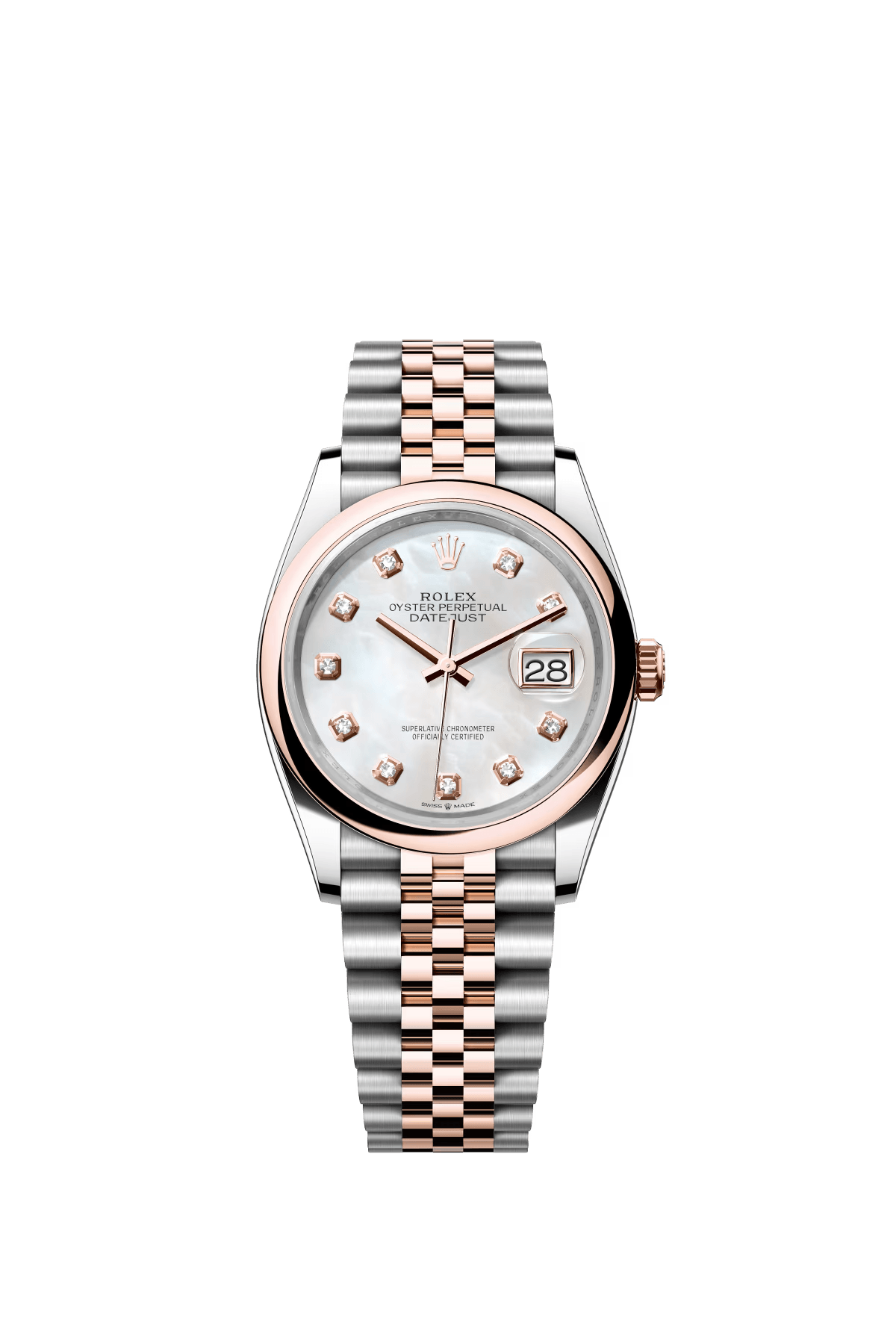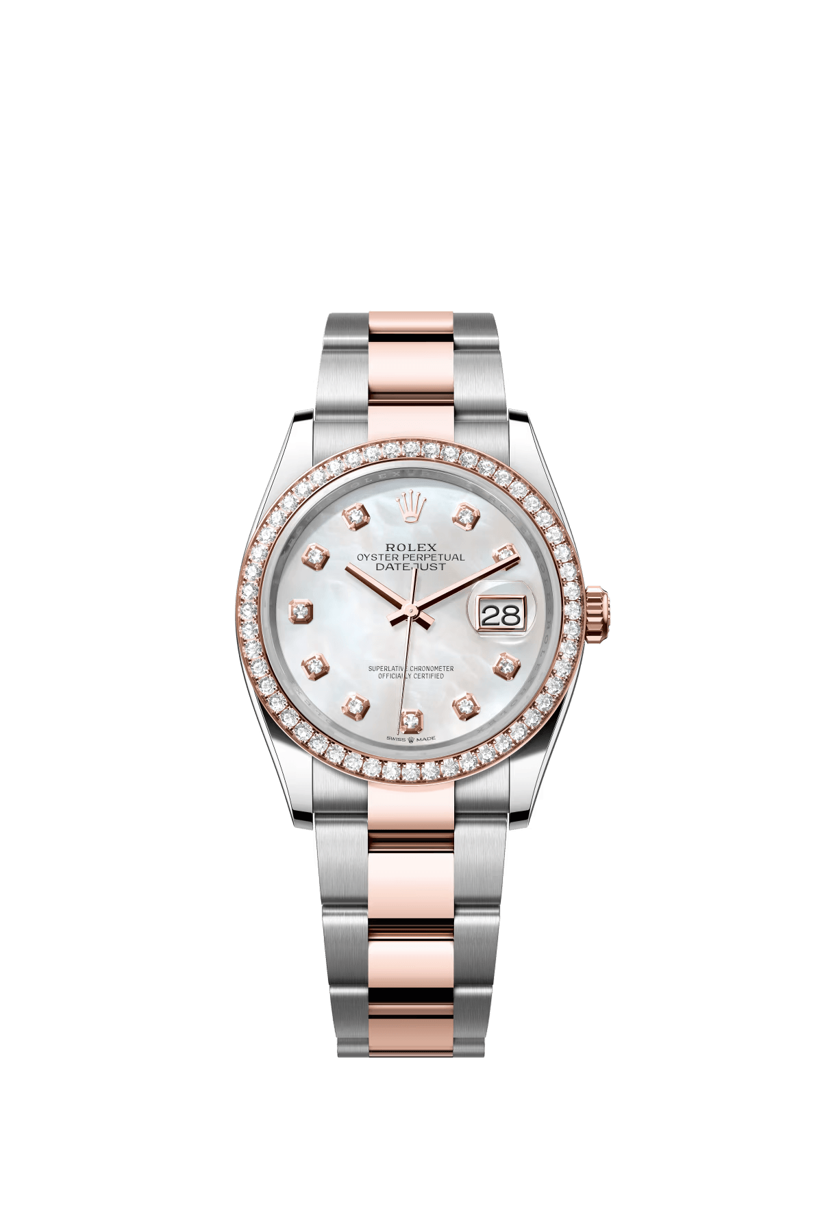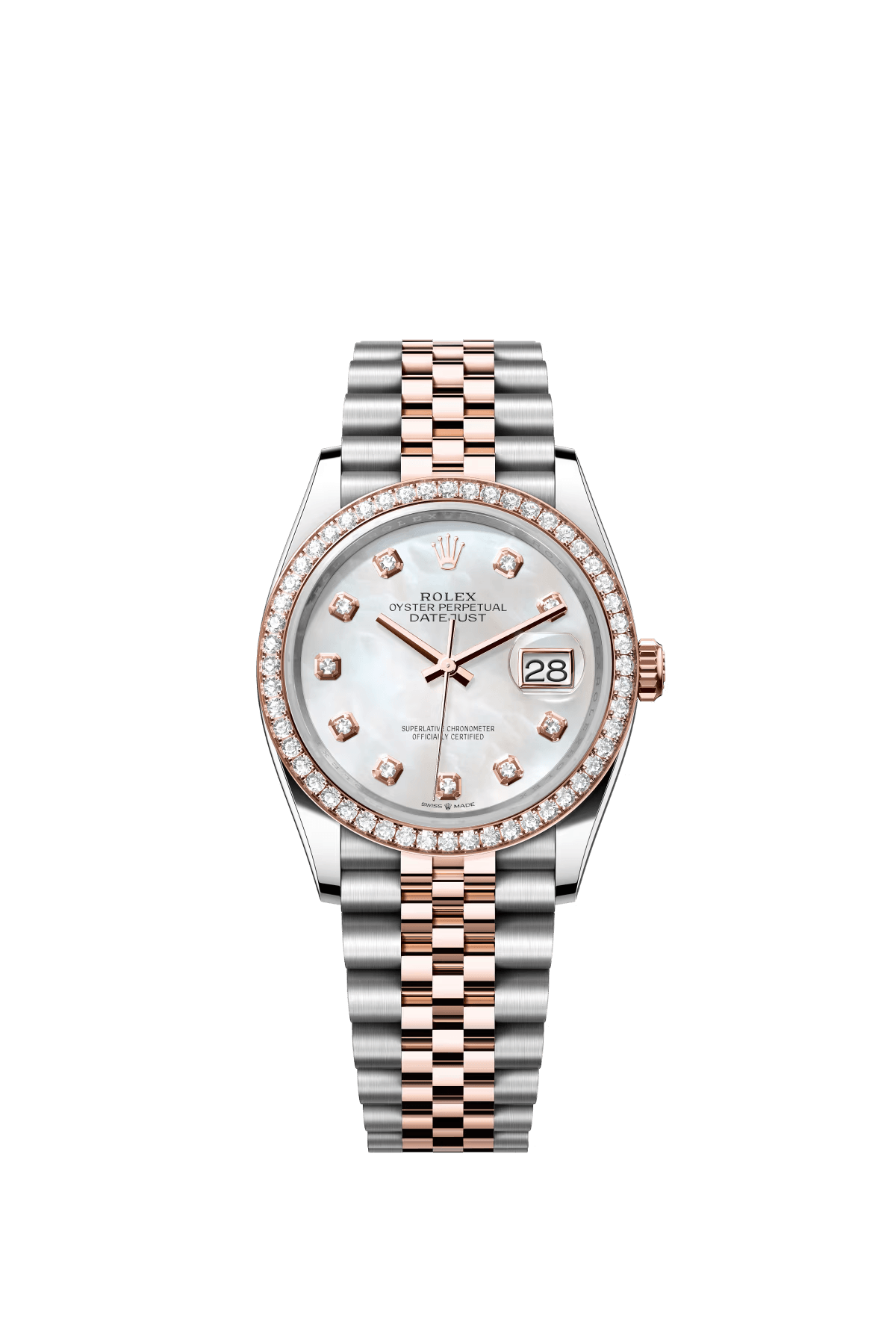 The Oyster Perpetual Datejust 36 is available in Everose gold and Oystersteel, with a diamond-set white mother-of-pearl dial and an Oyster bracelet. -m126281rbr-0010