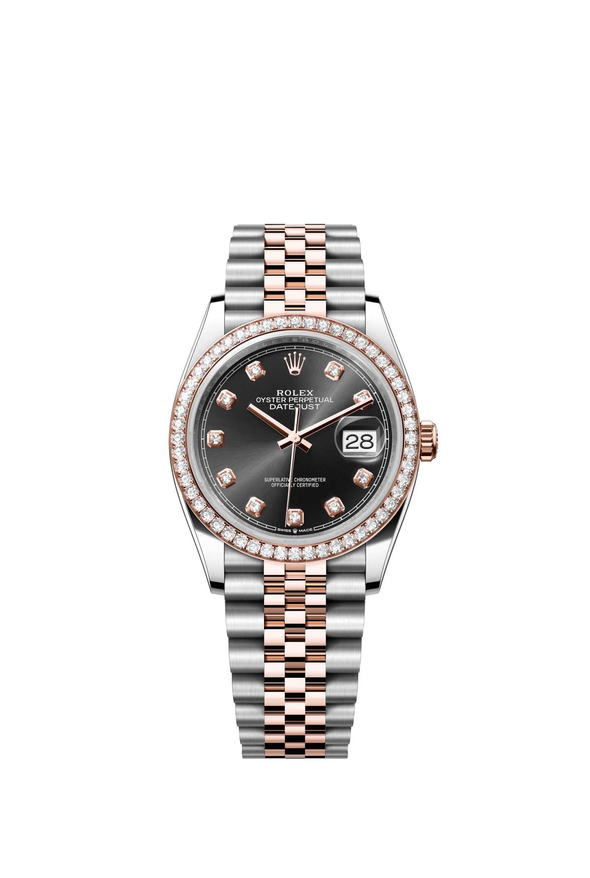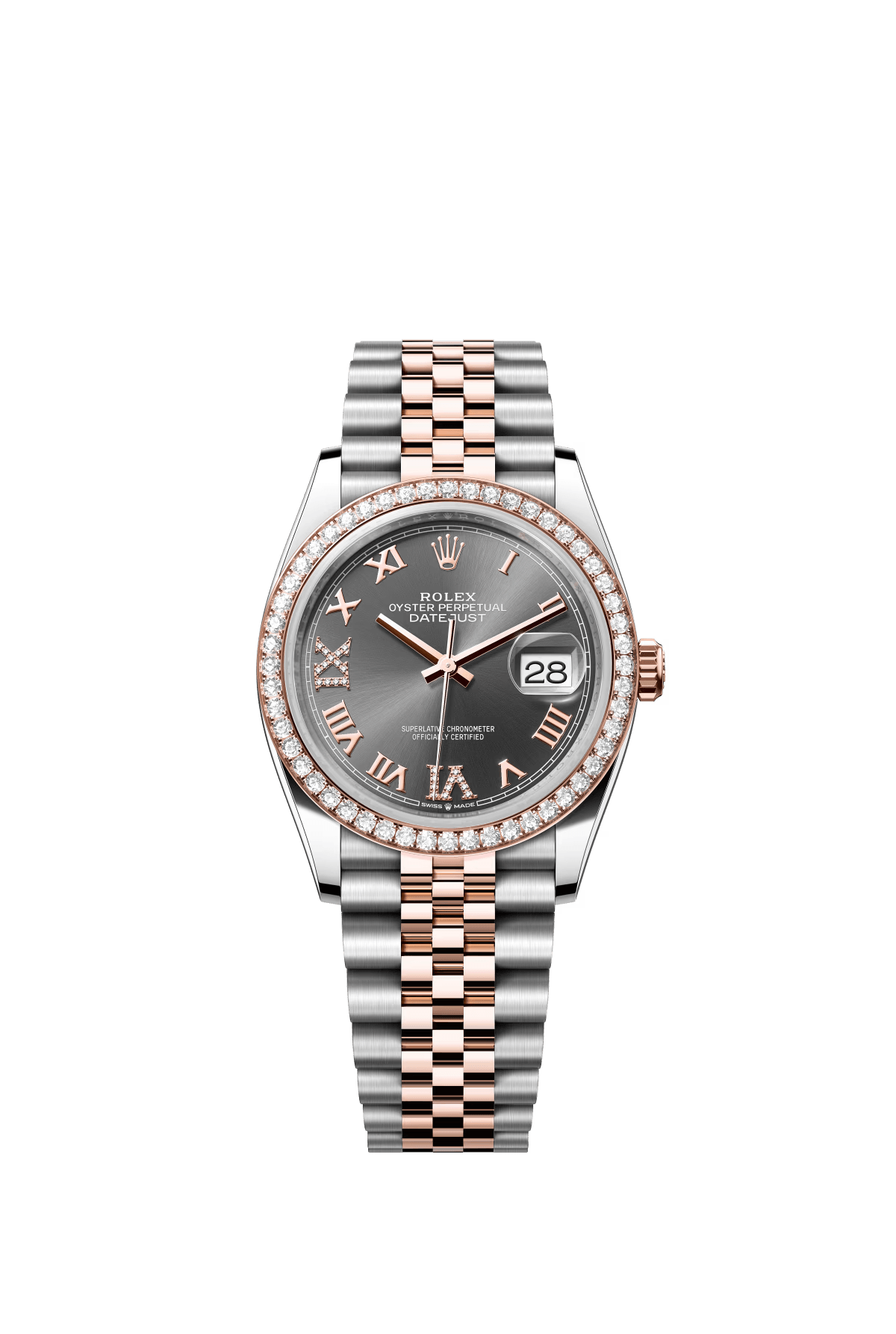 The Oyster Perpetual Datejust 36 is available in Everose gold and Oystersteel with a grey dial set with diamond plates and a Jubilee bracelet. -m126281rbr-0011