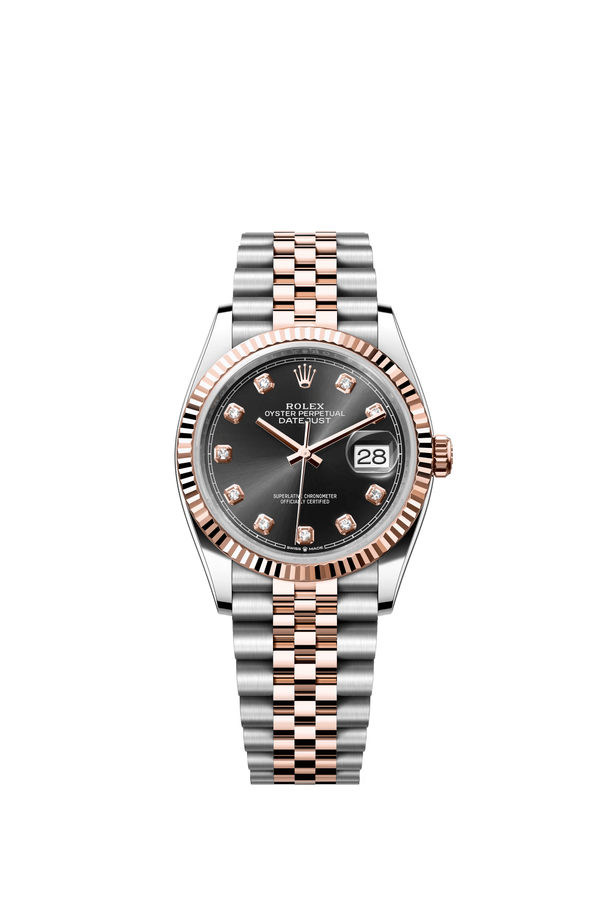 The Oyster Perpetual Datejust 36 is available in Everose gold and Oysteel with a rose gold-tone diamond-set dial and an Oyster bracelet. -m126201-0028