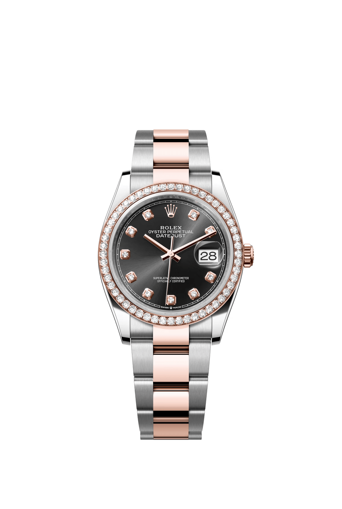 The Oyster Perpetual Datejust 36 is available in Everose gold and Oyster steel with a grey dial set with diamond plates and an Oyster bracelet. -m126281rbr-0012