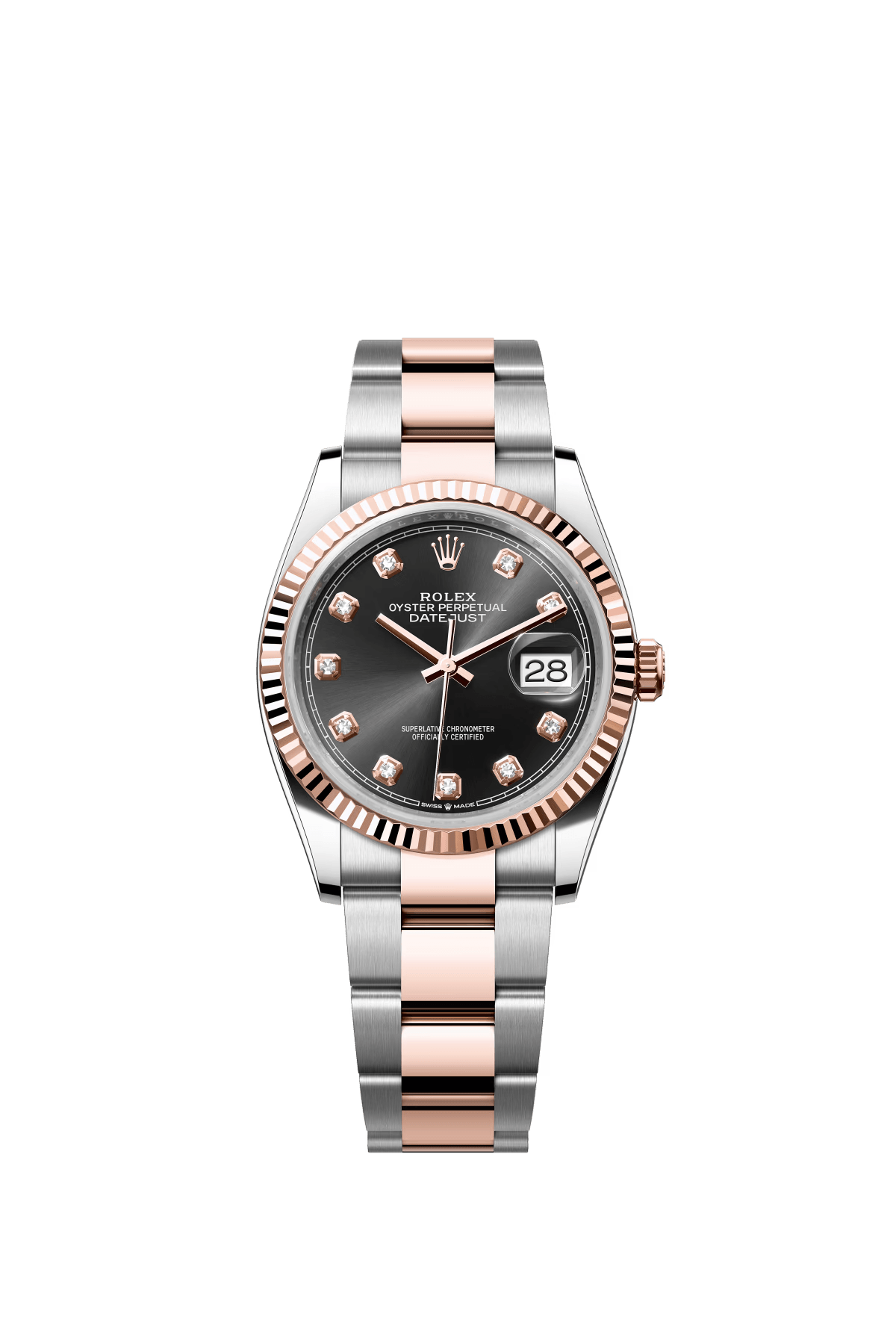 The Oyster Perpetual Datejust 36 is available in Everose gold and Oystersteel, with a slate grey dial and an Oyster bracelet. -m126281rbr-0018
