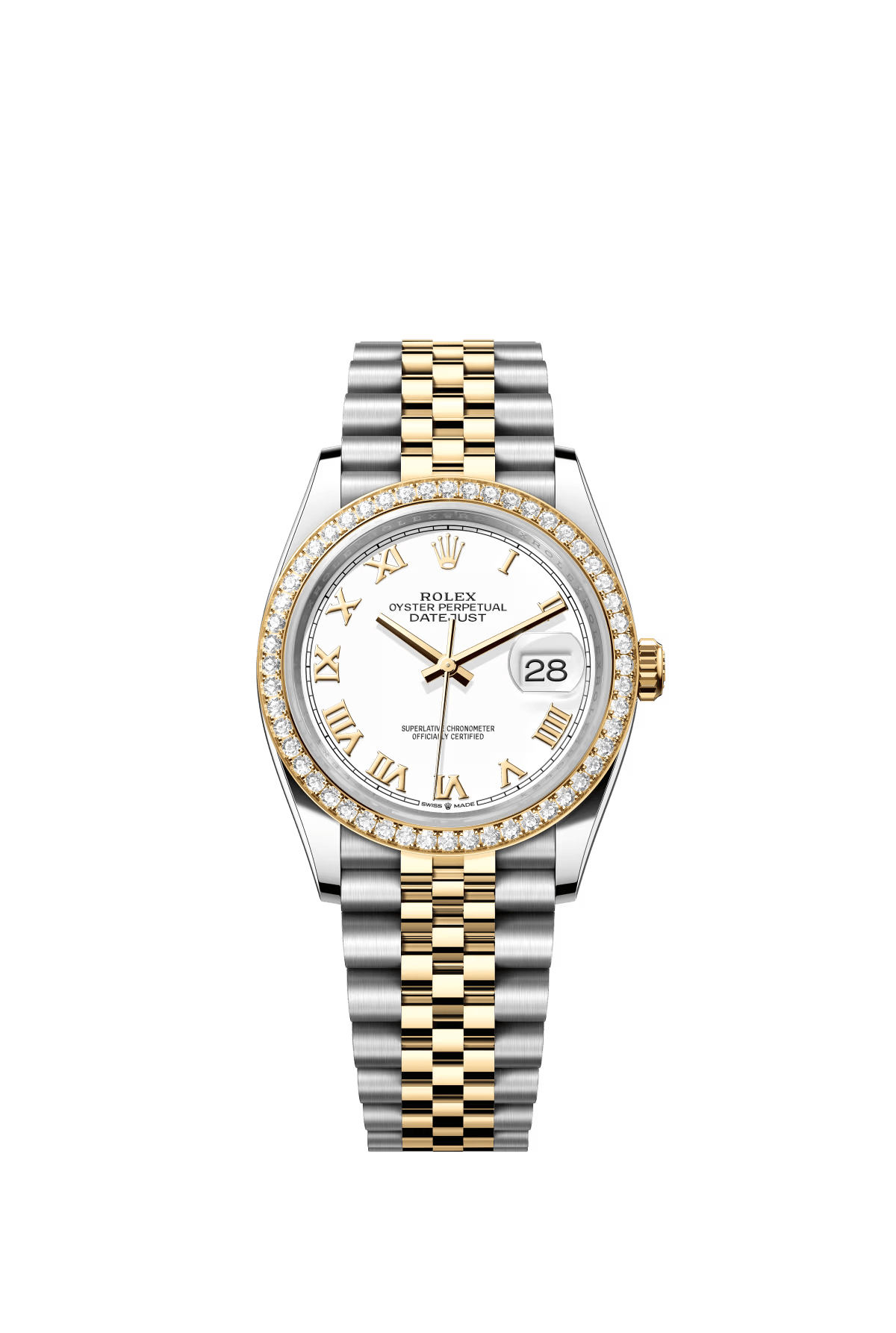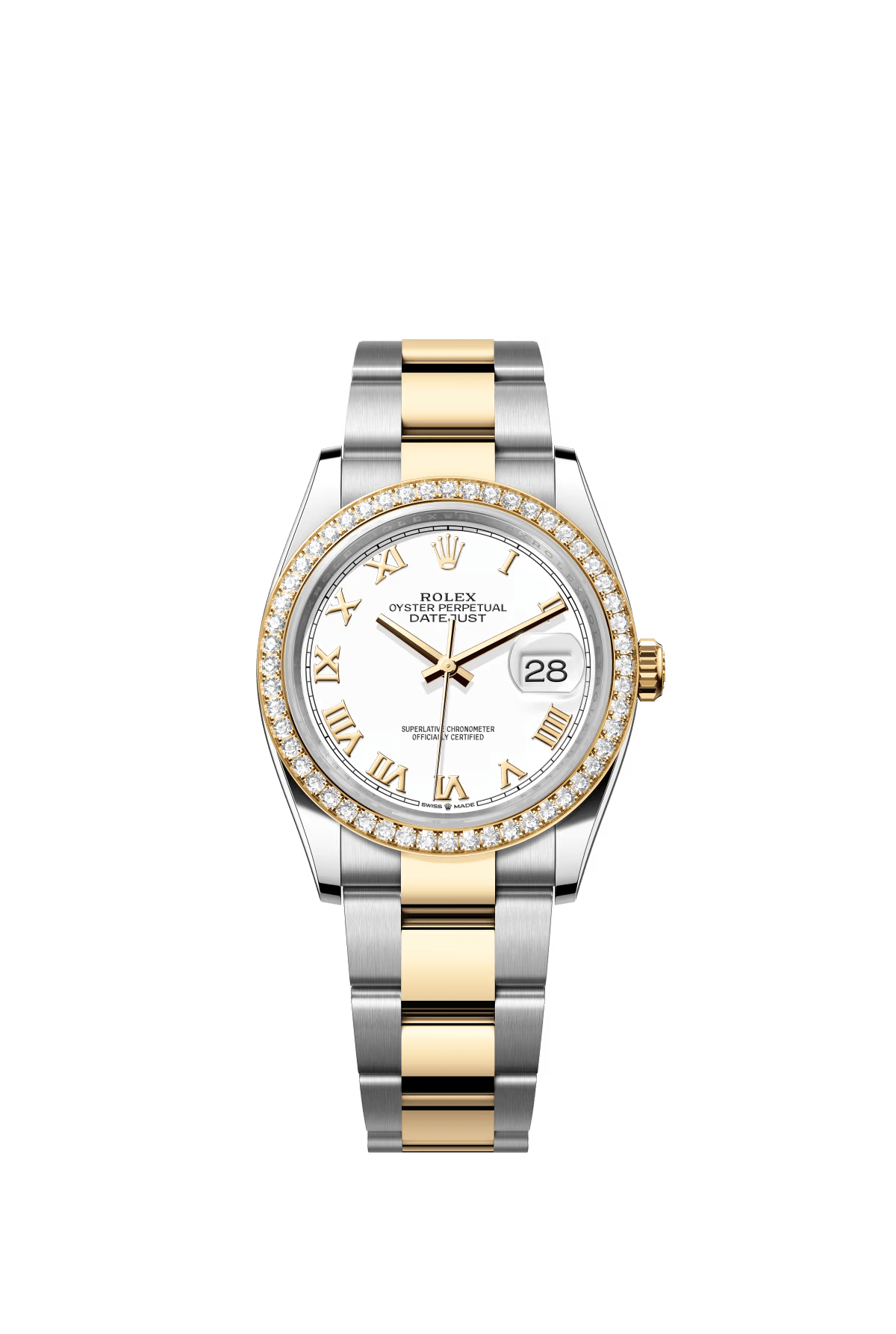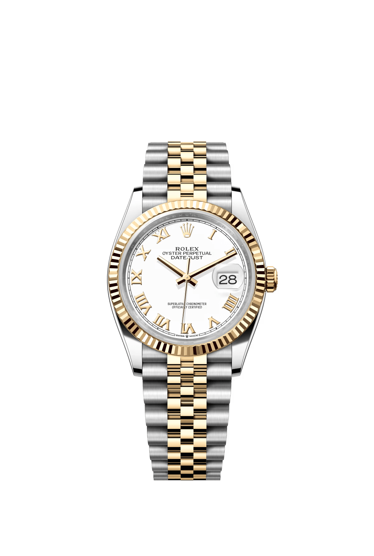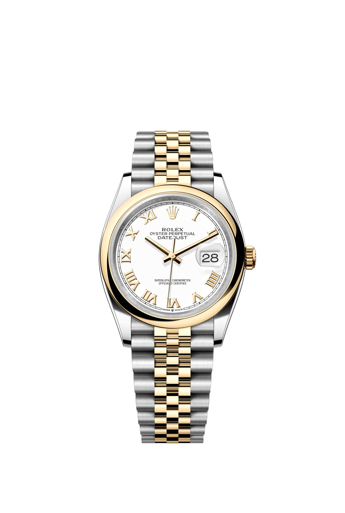 The Oyster Perpetual Datejust 36 is available in yellow gold and Oystersteel with a white dial and Oyster bracelet. -m126283rbr-0016