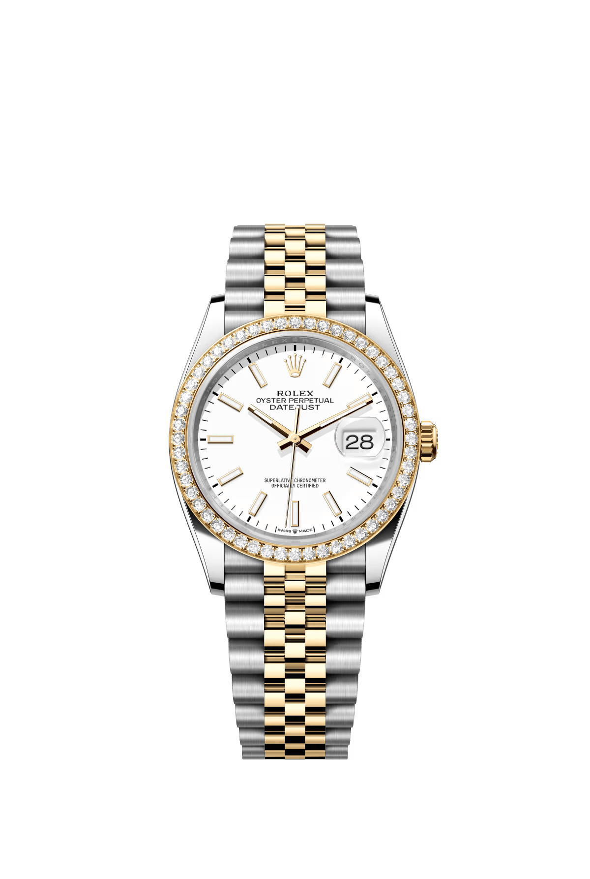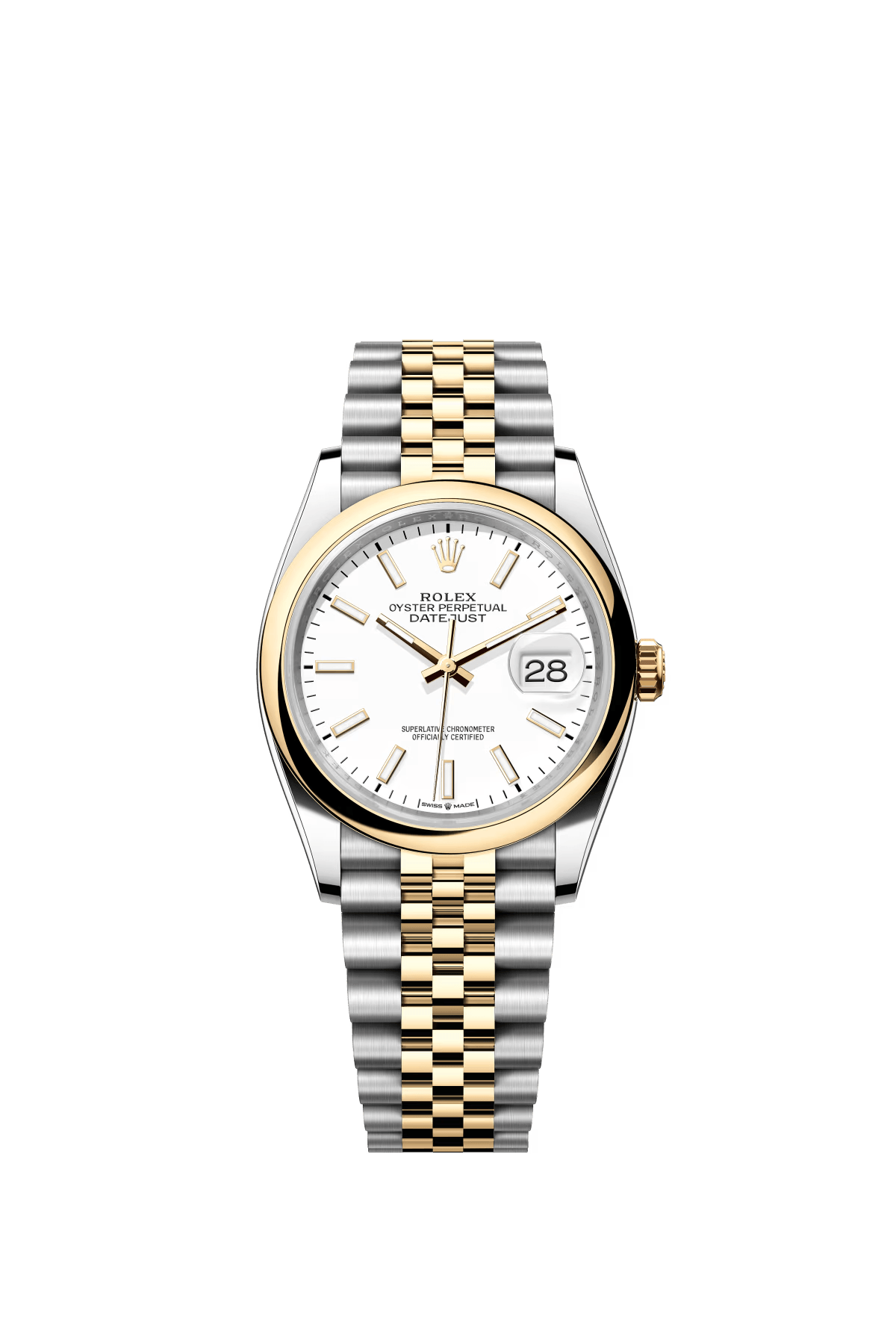 The Oyster Perpetual Datejust 36 is available in yellow gold and Oystersteel with a white dial and Oyster bracelet. -m126233-0030