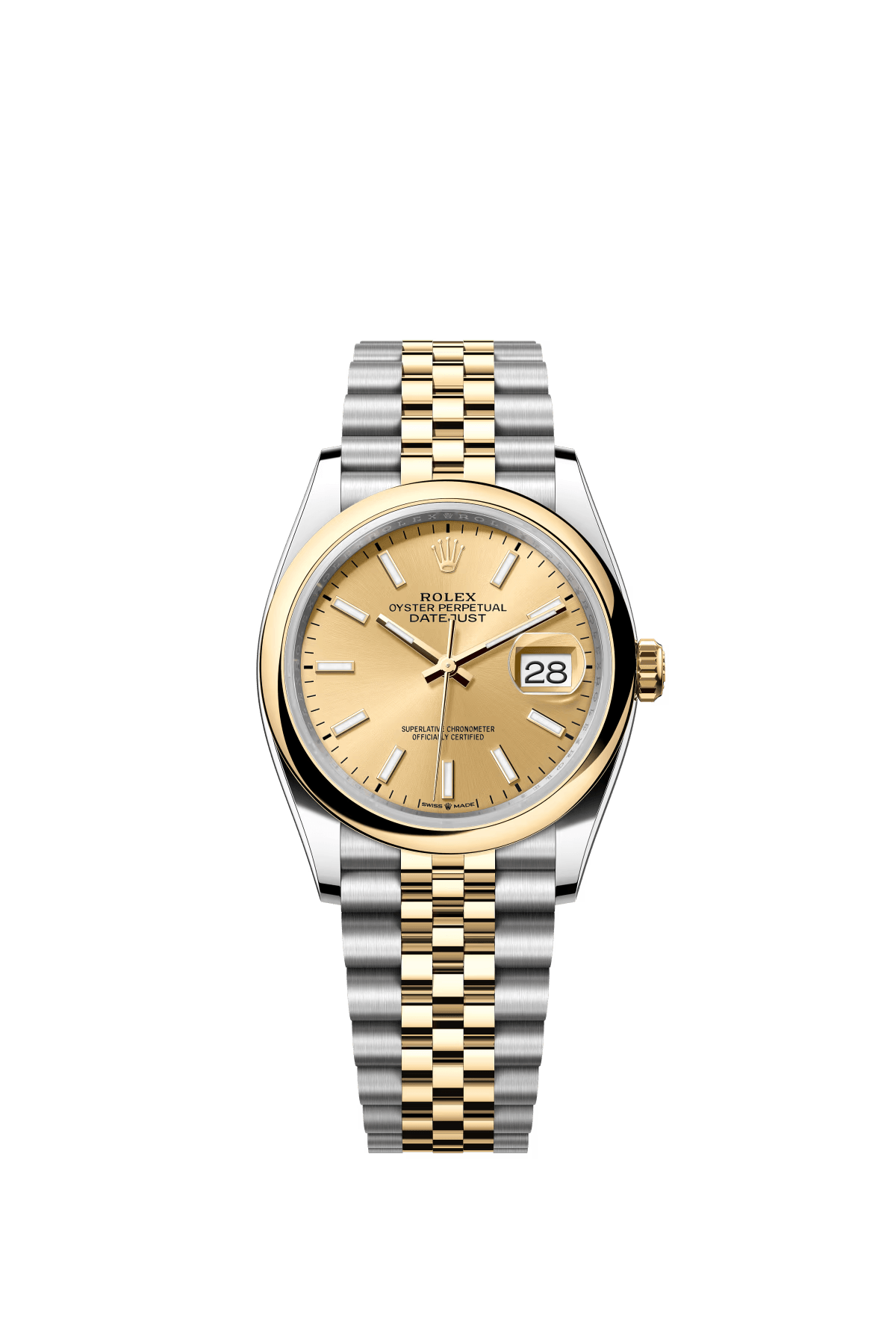 The Oyster Perpetual Datejust 36 is available in yellow gold and Oystersteel with a champagne-coloured dial and a Jubilee bracelet. -m126283rbr-0001