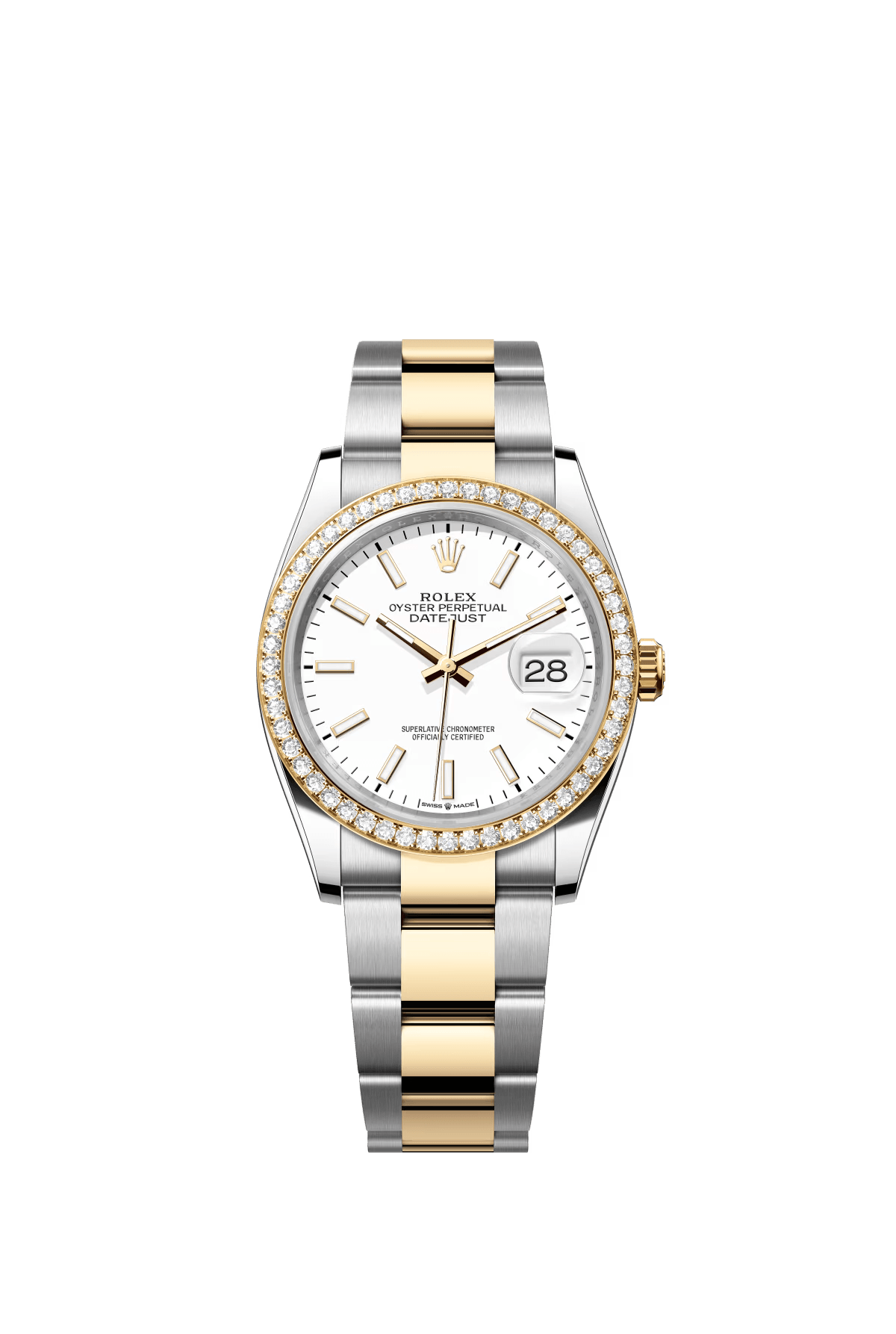 The Oyster Perpetual Datejust 36 is available in yellow gold and Oystersteel with a white dial and Oyster bracelet. -m126203-0020