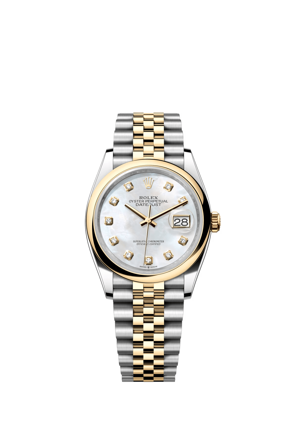 The Oyster Perpetual Datejust 36 is available in yellow gold and Oysteel, with a diamond-set white mother-of-pearl dial and an Oyster bracelet. -m126233-0024
