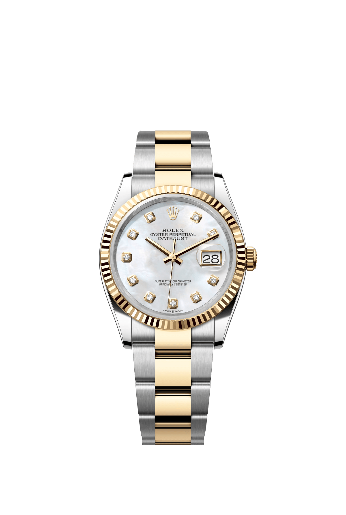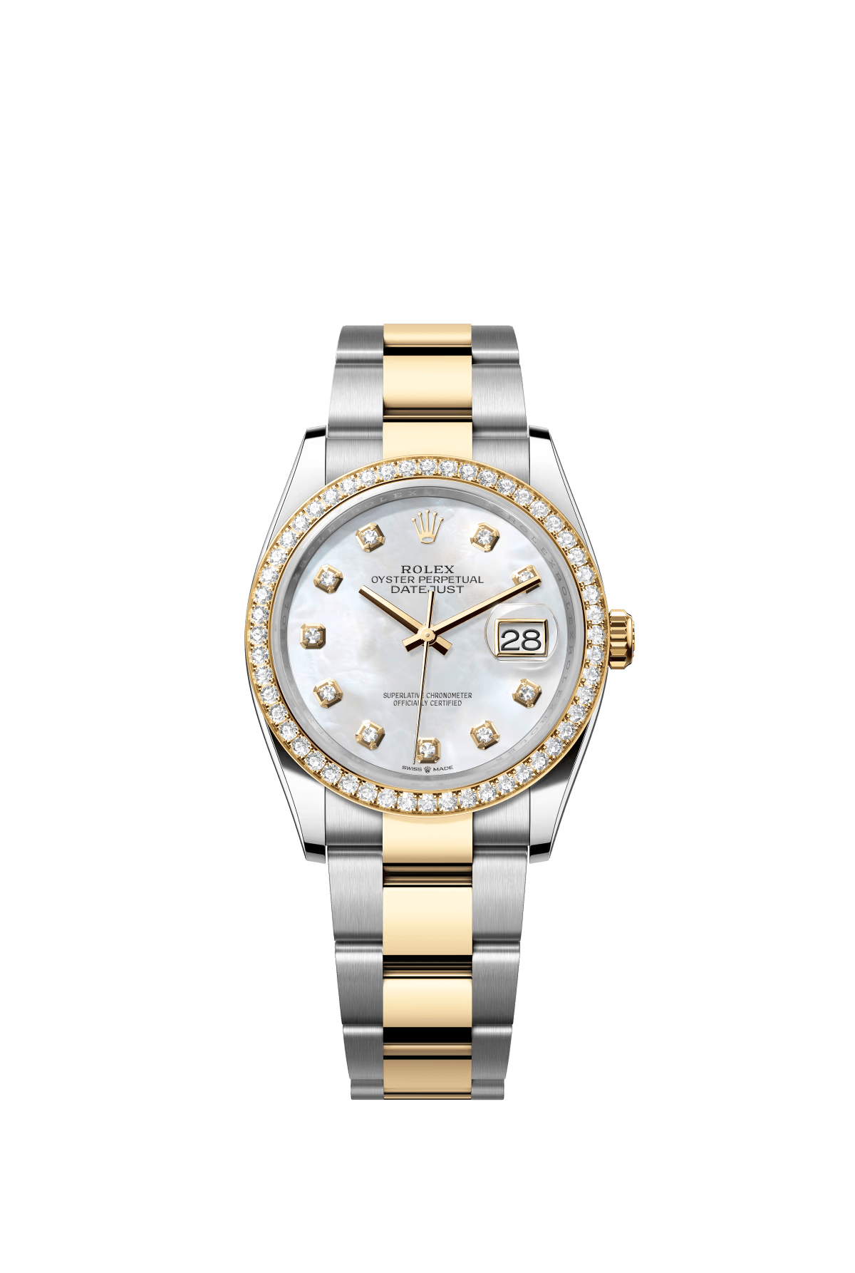The Oyster Perpetual Datejust 36 is available in yellow gold and Oysteel, with a diamond-set white mother-of-pearl dial and an Oyster bracelet. -m126283rbr-0010