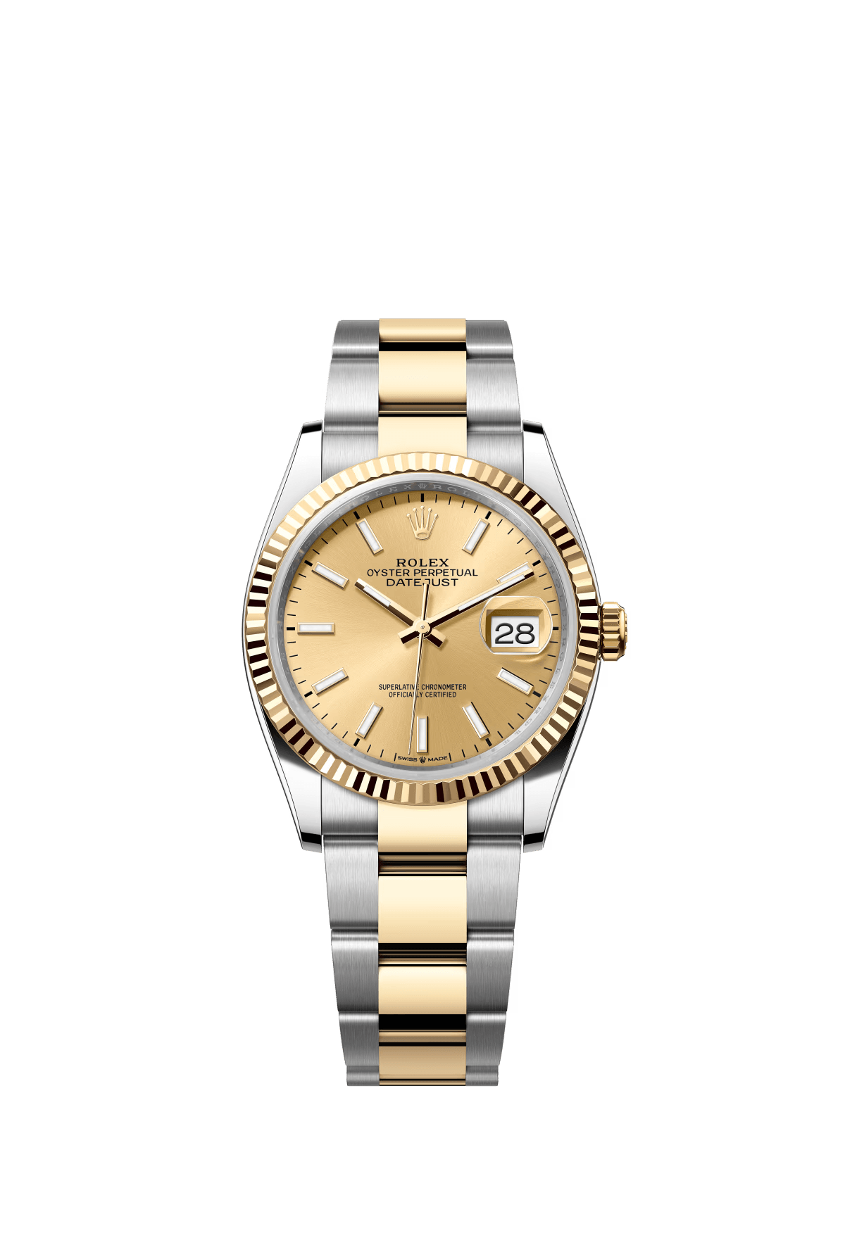 The Oyster Perpetual Datejust 36 is available in yellow gold and Oysteel, with a champagne-coloured dial and an Oyster bracelet. -m126233-0016