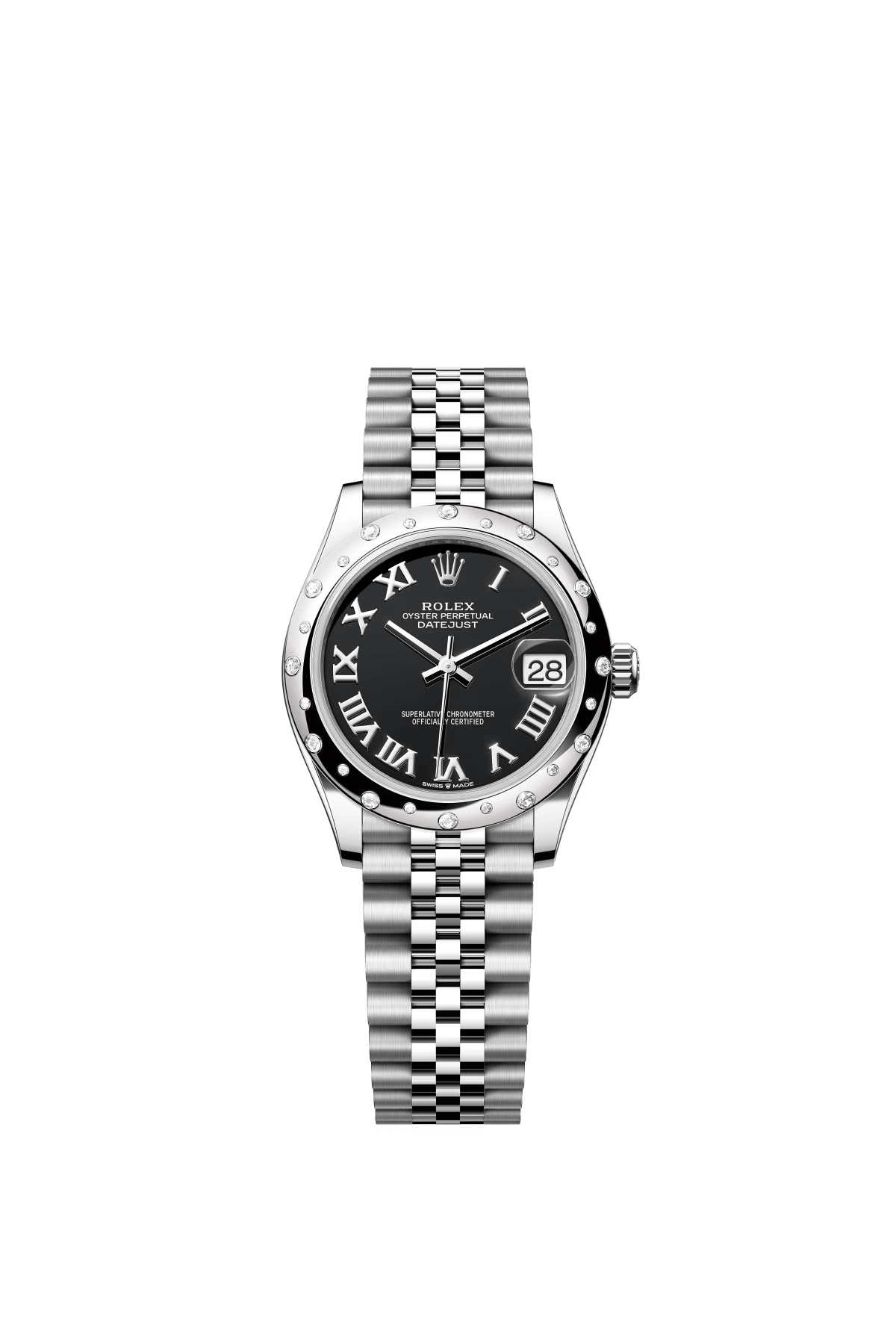 The Oyster Perpetual Datejust 31 is available in white gold and Oystersteel, with a glossy black dial and a Jubilee bracelet. -m278344rbr-0002