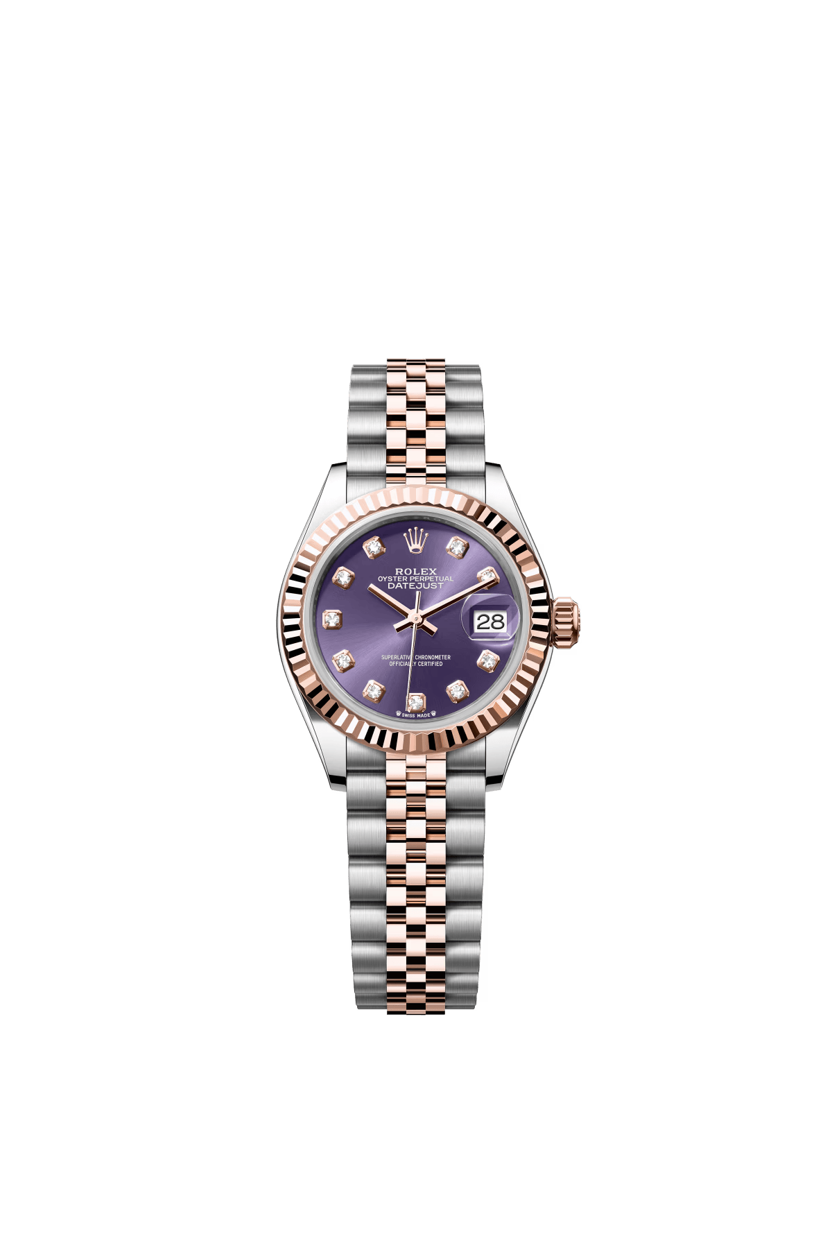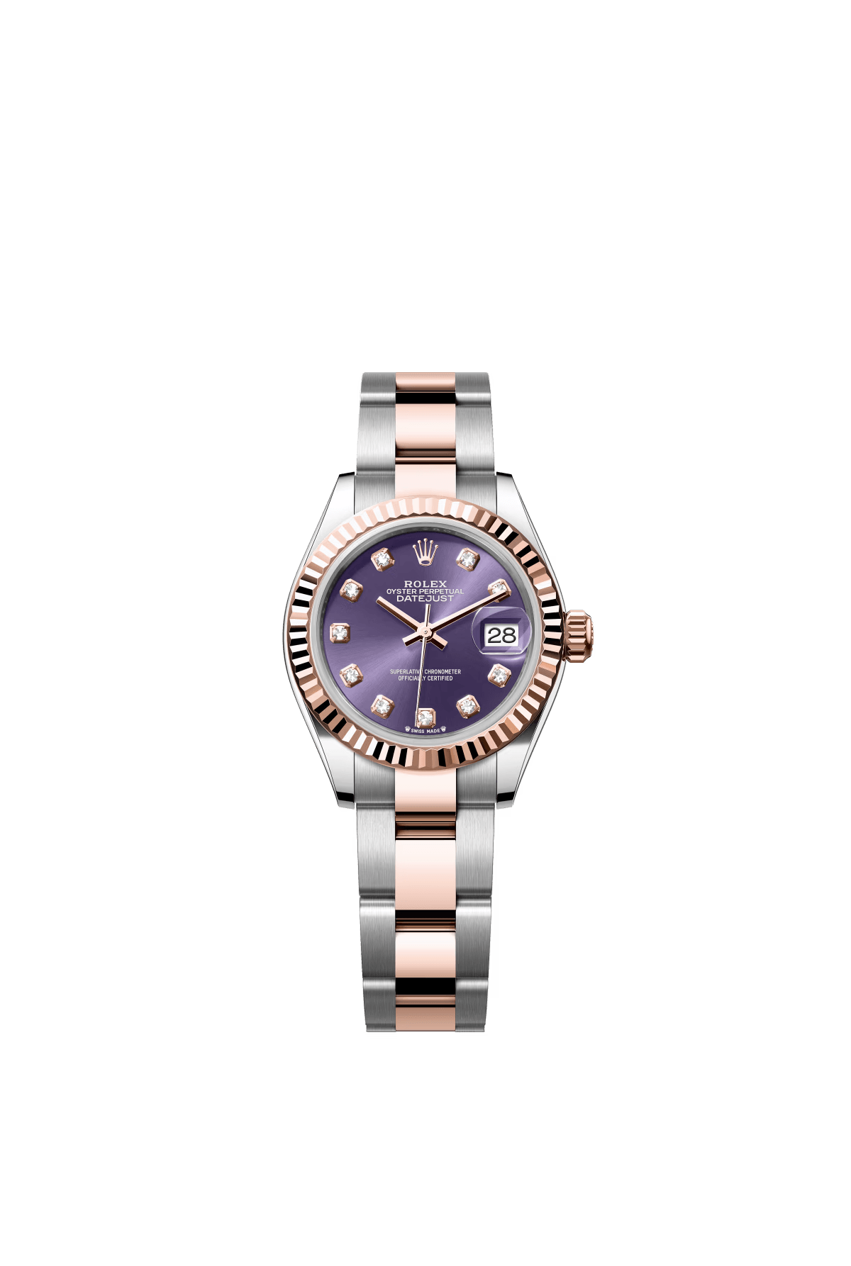 The Oyster Perpetual Lady-Datejust in Everose gold and Oystersteel features a diamond-set eggplant purple dial and an Oyster bracelet. -m279171-0016 28mm