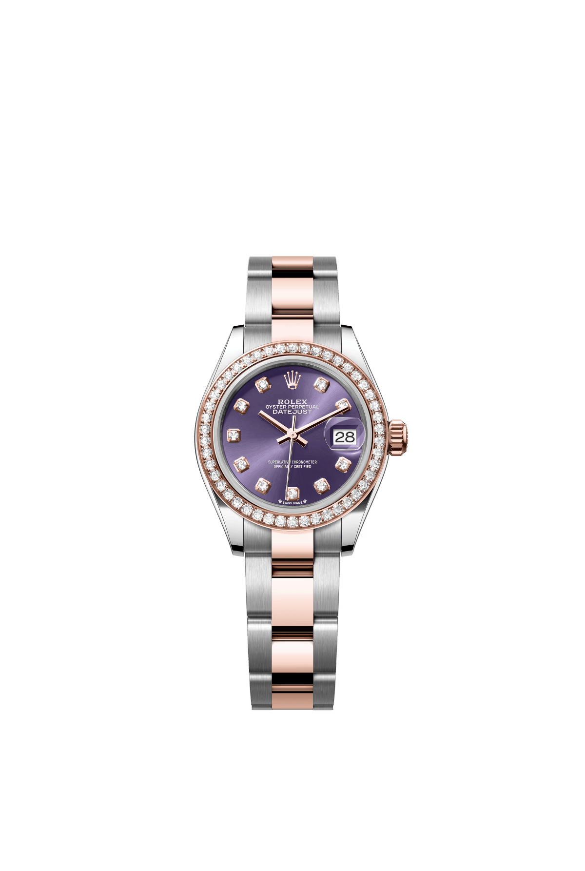 The Oyster Perpetual Lady-Datejust in Everose gold and Oystersteel features a diamond-set eggplant purple dial and an Oyster bracelet. -m279381rbr-0016 28mm