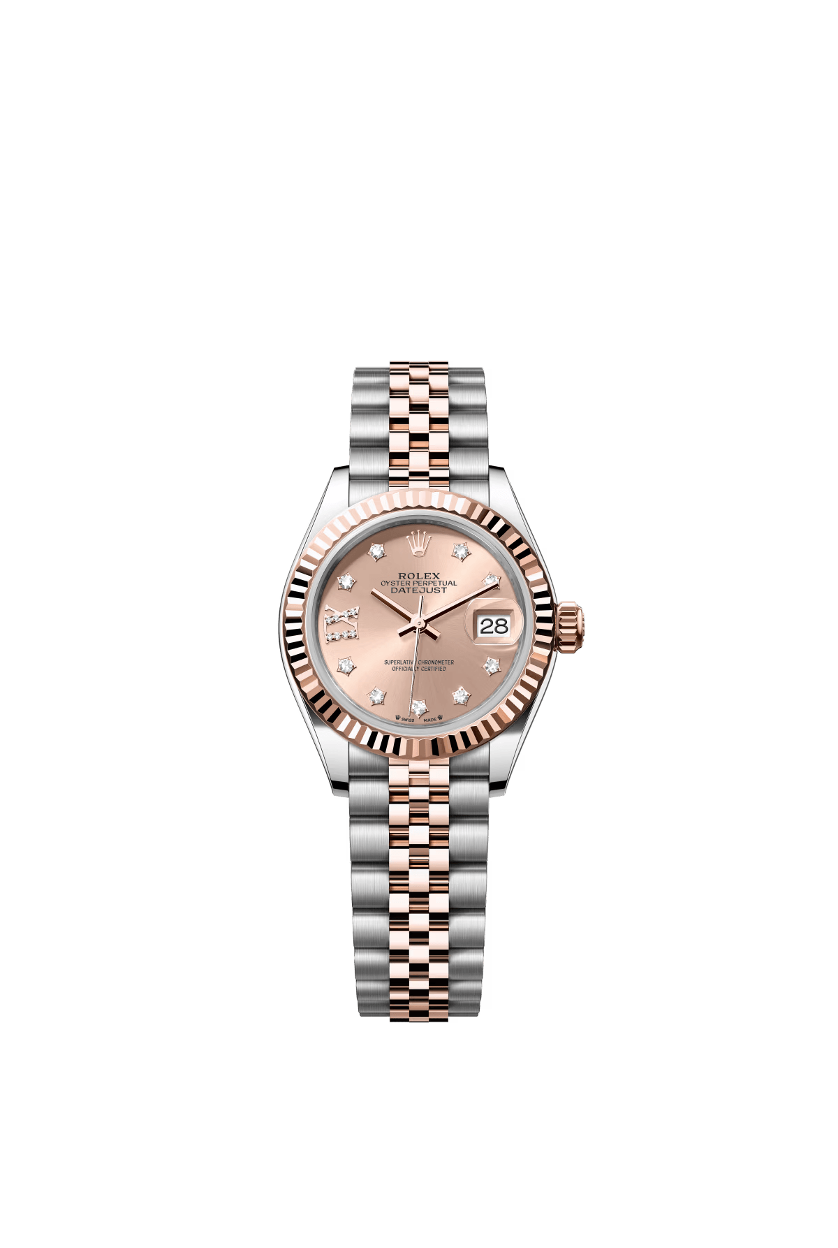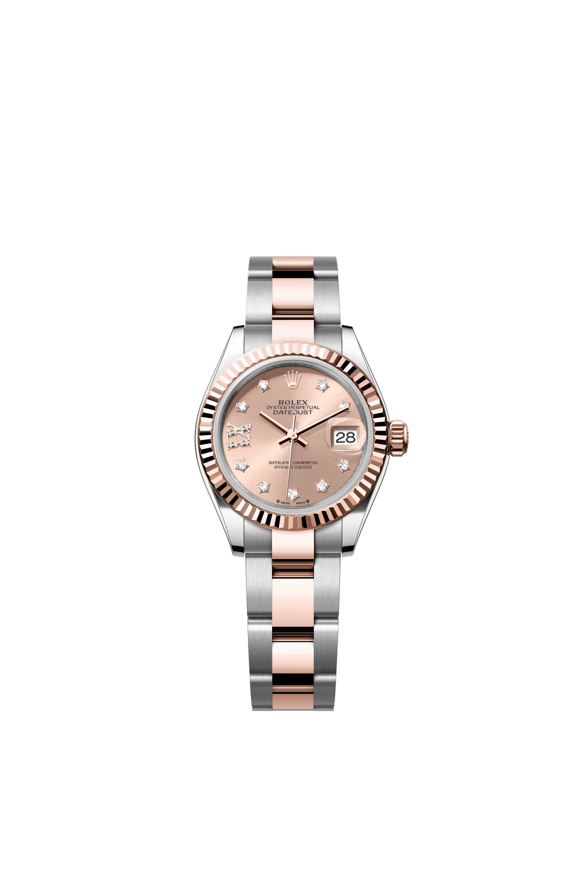 The Oyster Perpetual Lady-Datejust is available in Everose gold and Oystersteel, with a rose gold-tone dial set with diamonds and an Oyster bracelet. -m279381rbr-0028 28mm