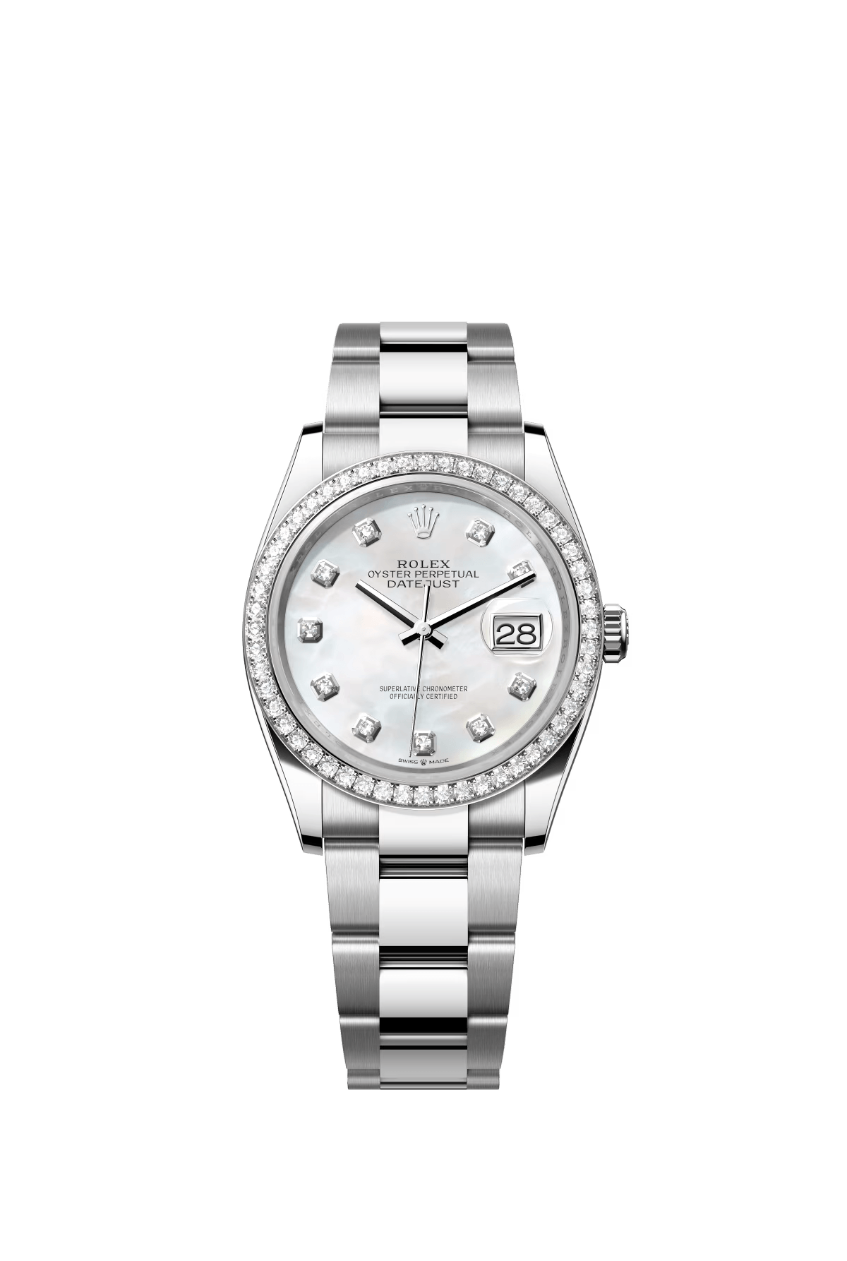 The Oyster Perpetual Datejust 36 is available in white gold and Oystersteel with a diamond-set white mother-of-pearl dial and an Oyster bracelet. -m126284rbr-0012