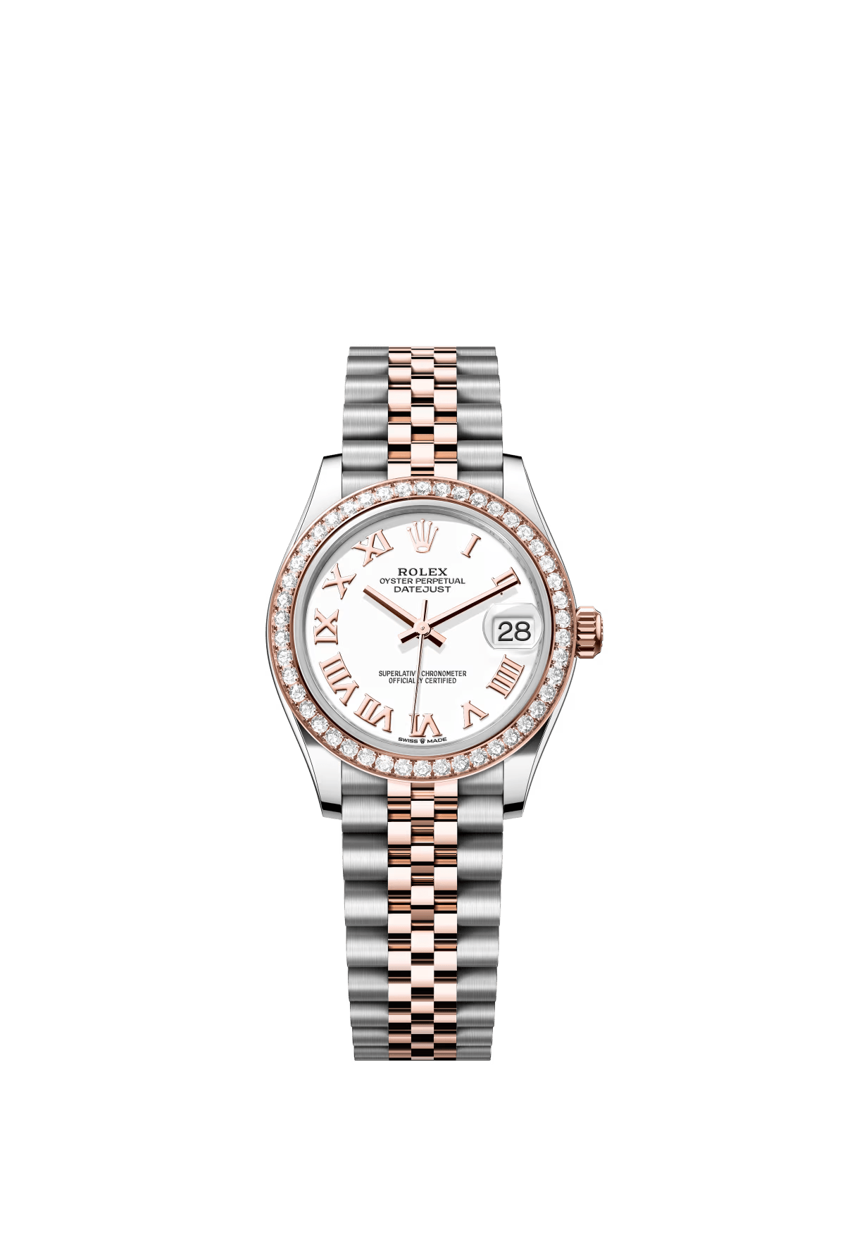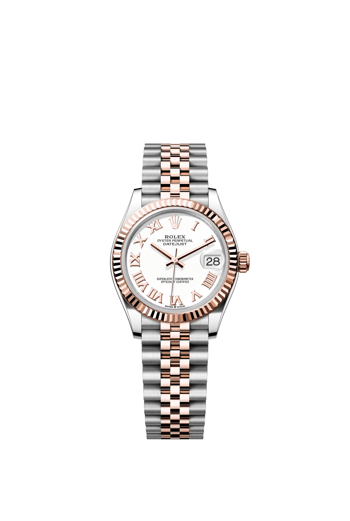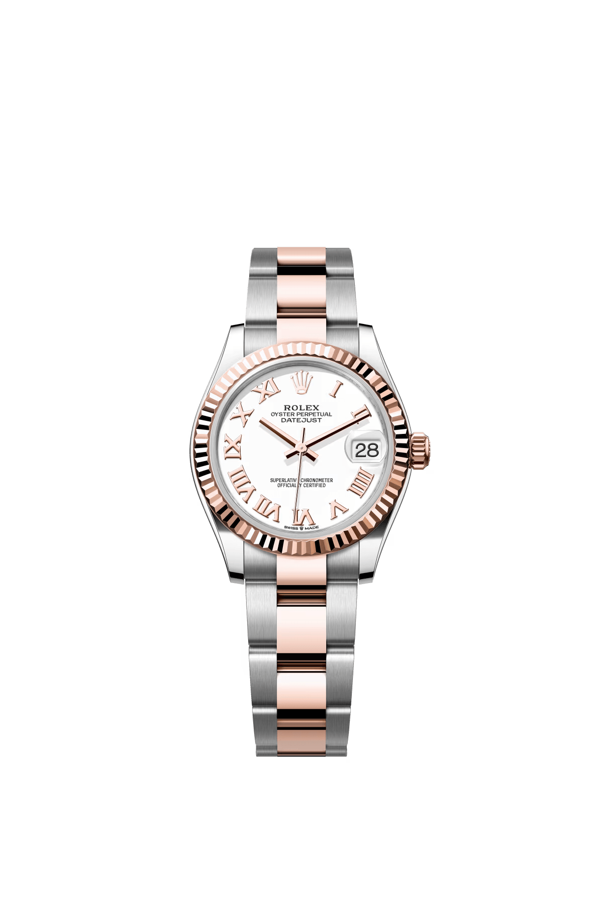 The Oyster Perpetual Datejust 31 is available in Everose gold and Oystersteel with a white dial and Oyster bracelet. -m278271-0001