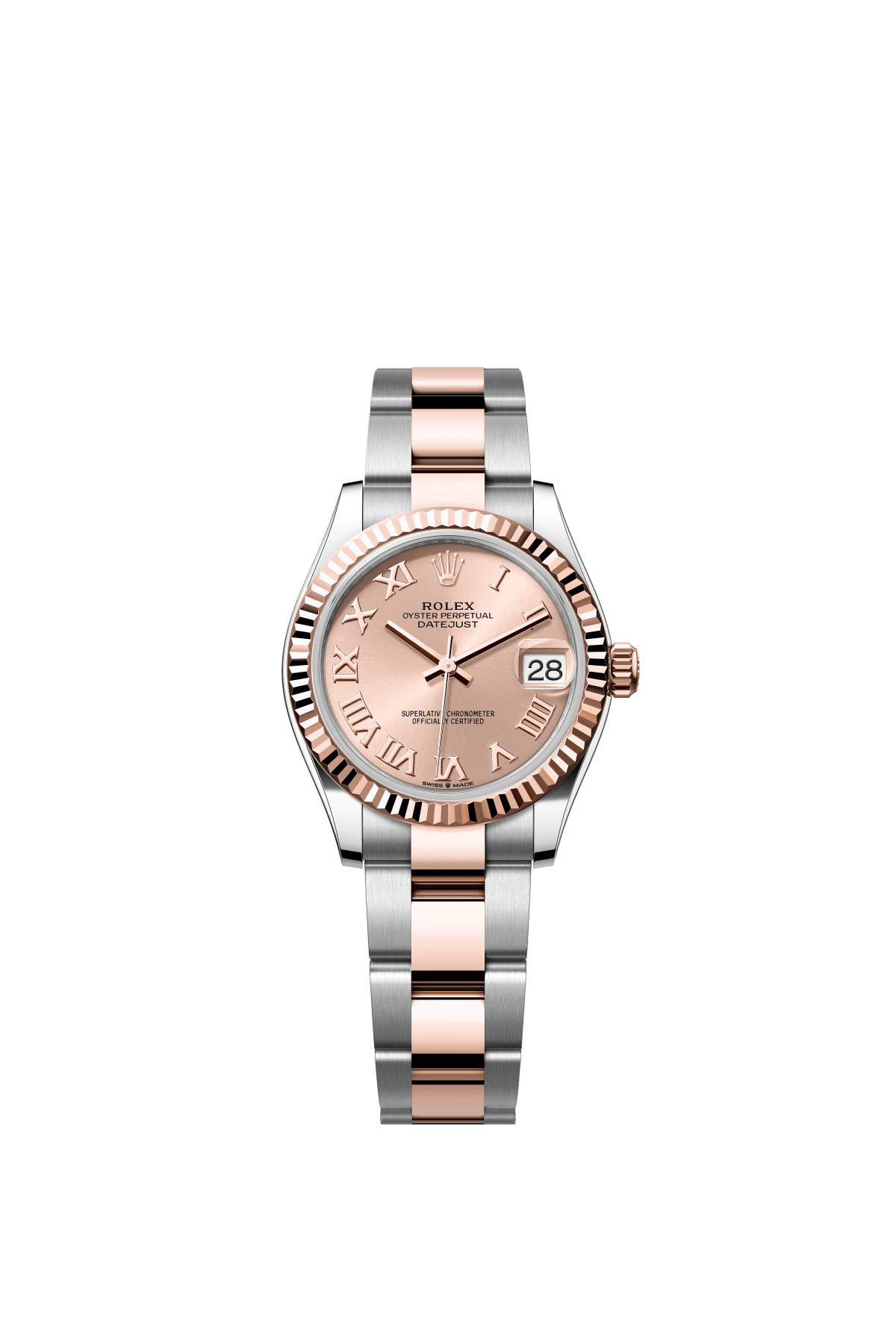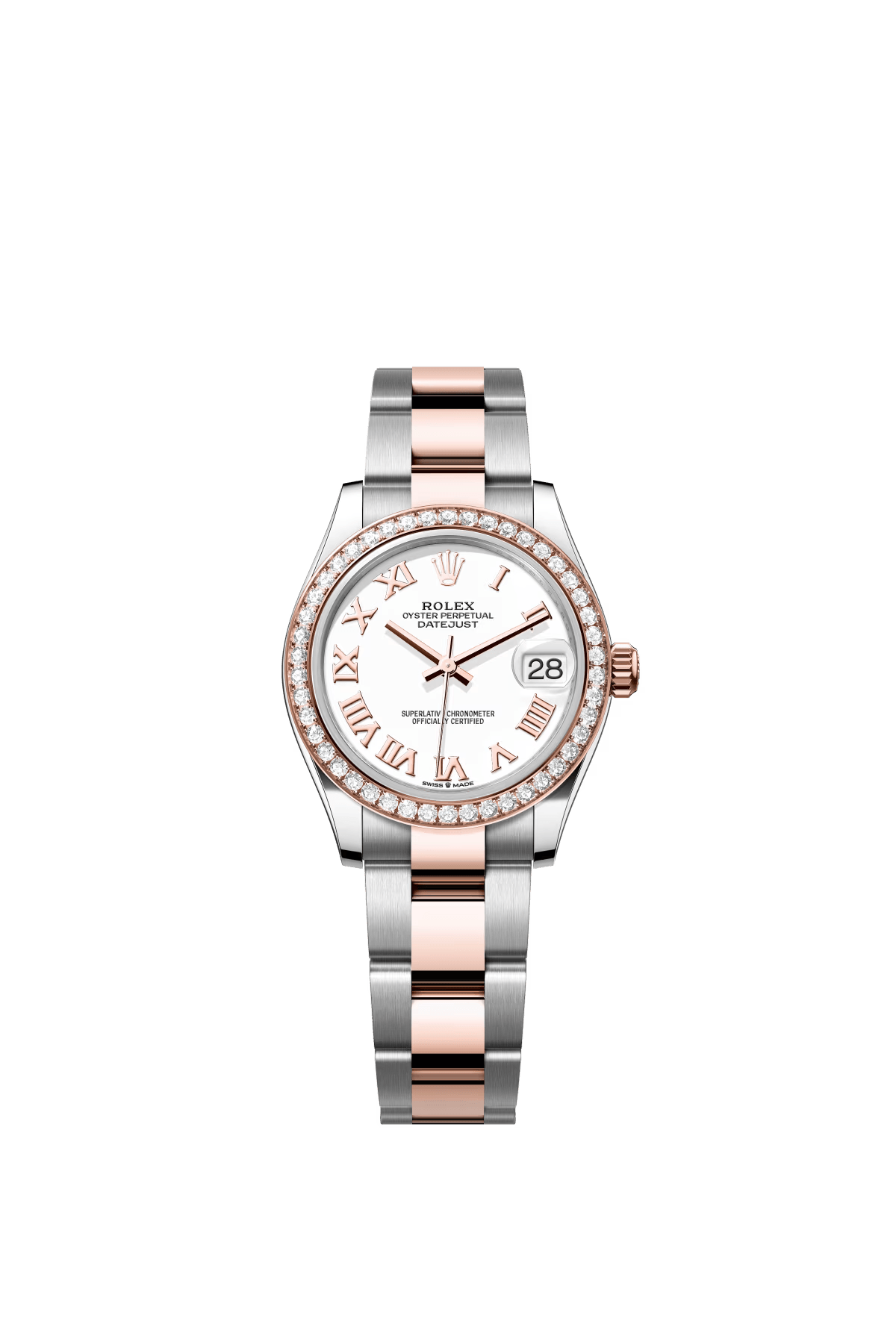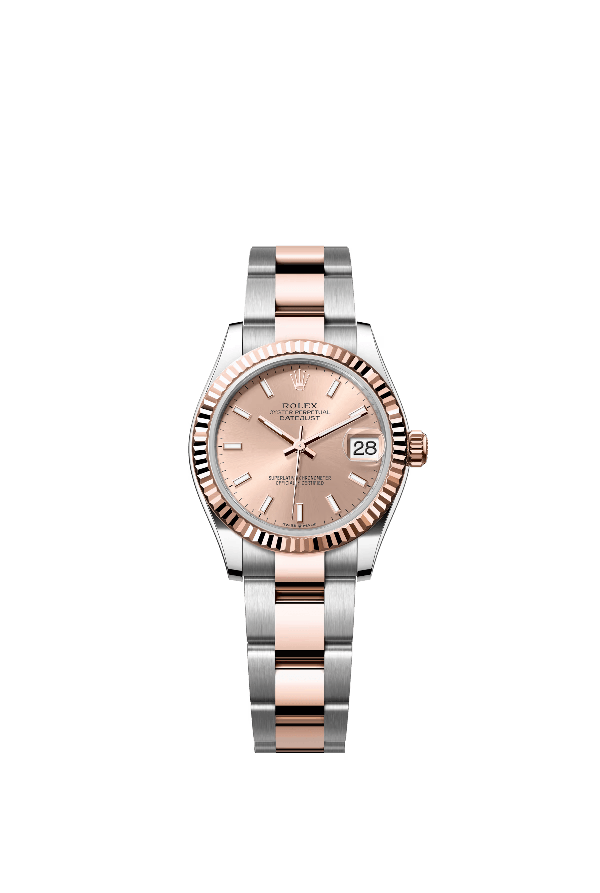 The Oyster Perpetual Datejust 31 is available in Everose gold and Oystersteel with a white dial and Oyster bracelet. -m278271-0001
