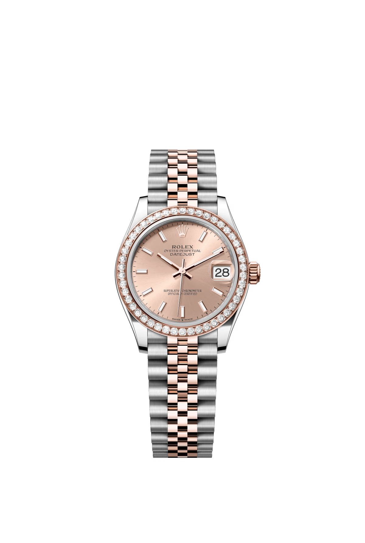 The Oyster Perpetual Datejust 31 is available in Everose gold and Oystersteel with a rose gold-tone diamond-set dial and a Jubilee bracelet. -m278341rbr-0024