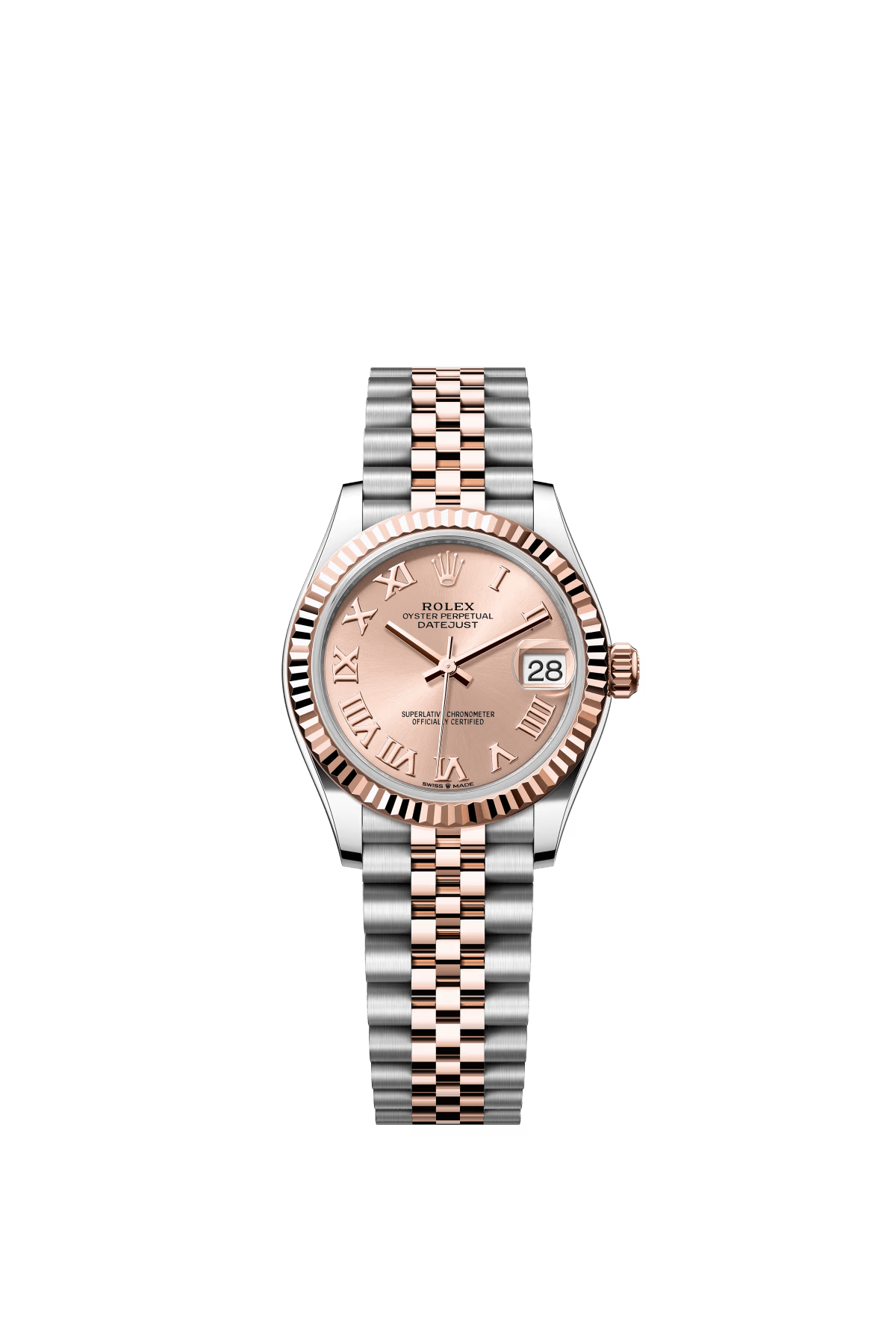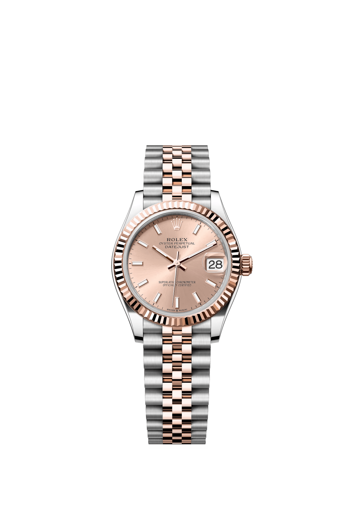 The Oyster Perpetual Datejust 31 is available in Everose gold and Oystersteel with a white dial and a Jubilee bracelet. -m278271-0002