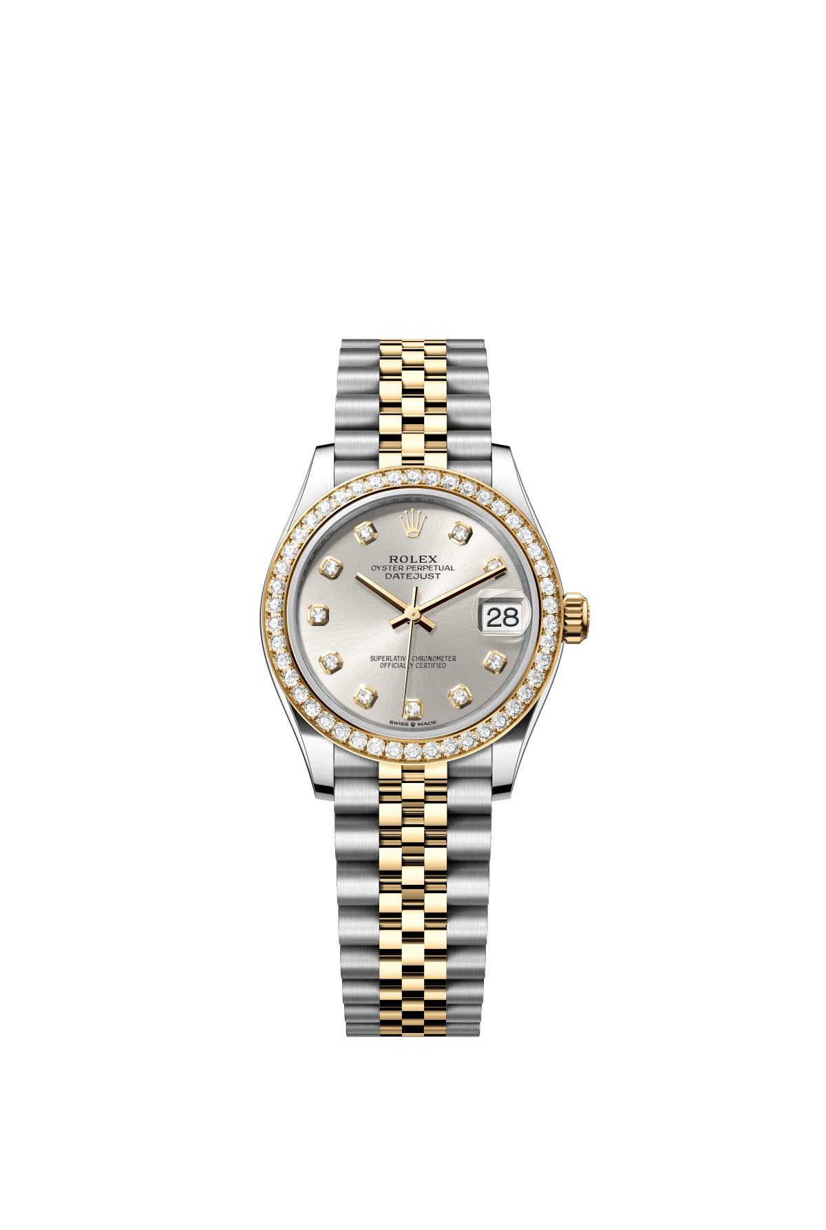 The Oyster Perpetual Datejust 31 is available in yellow gold and Oystersteel, with a silver-toned diamond-set dial and a Jubilee bracelet. -m278383rbr-0020