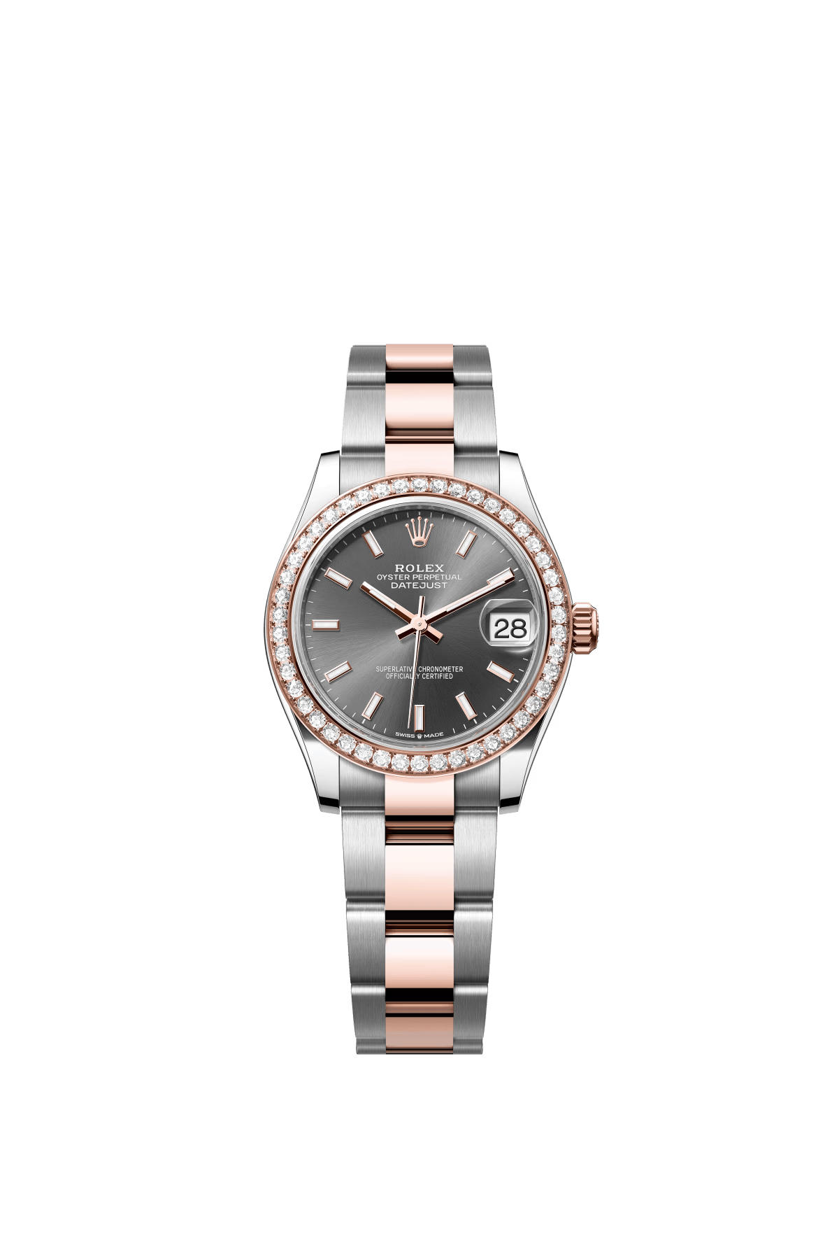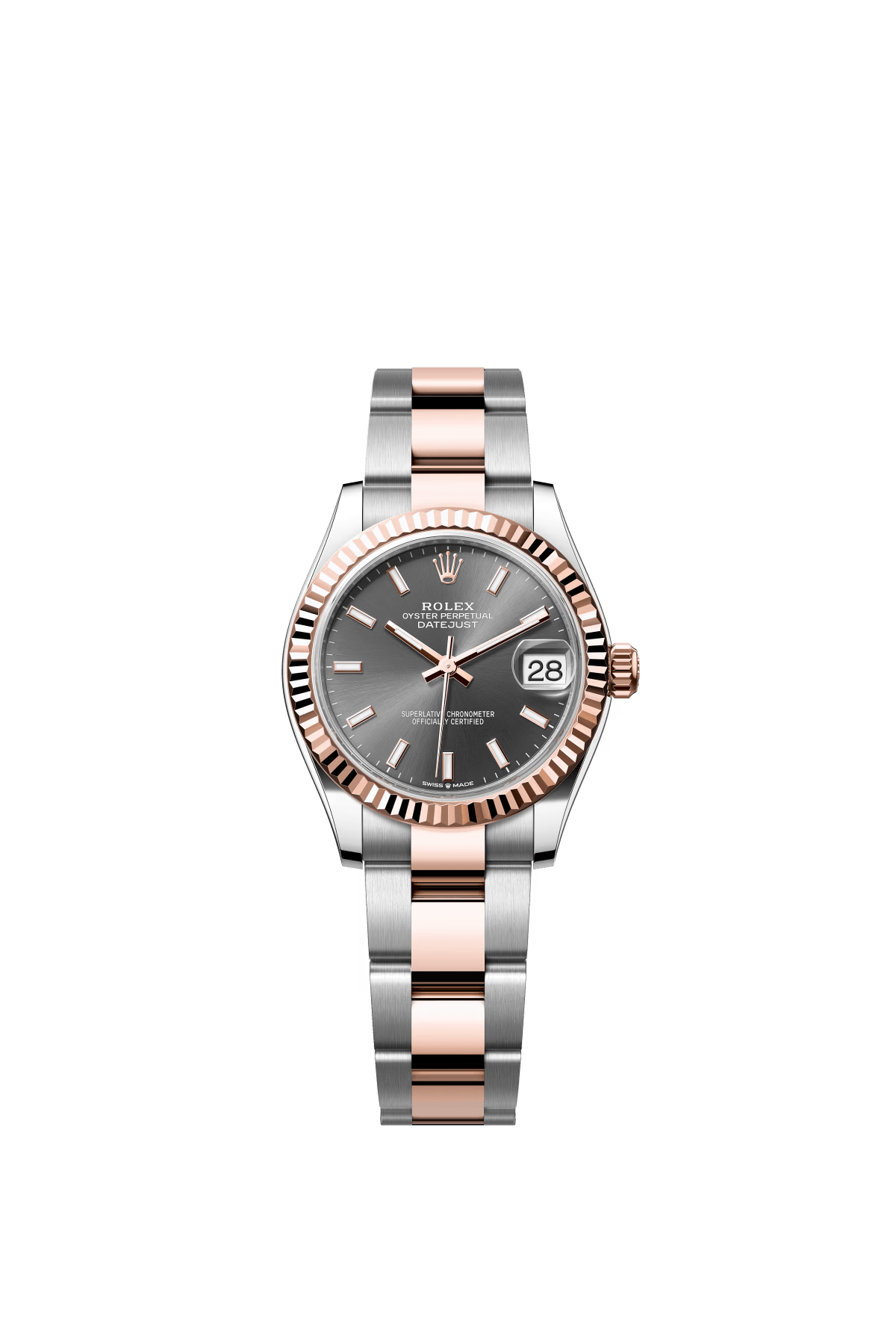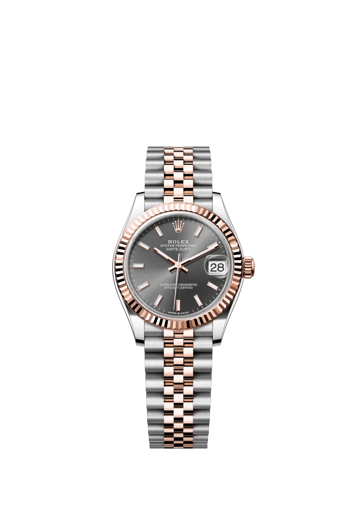 The Oyster Perpetual Datejust 31 is available in Everose gold and Oystersteel, with a slate grey dial and an Oyster bracelet. -m278381rbr-0017