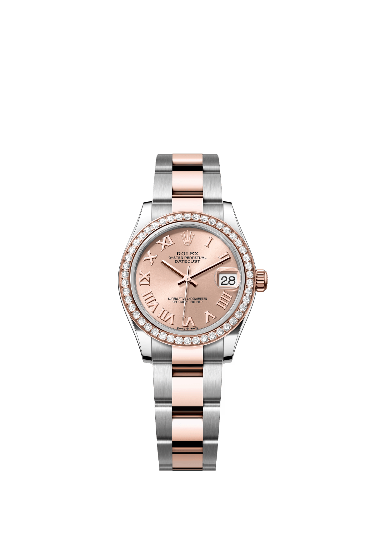 The Oyster Perpetual Datejust 31 is available in Everose gold and Oystersteel, with a rose gold-colour dial set with diamonds and an Oyster bracelet. -m278271-0023