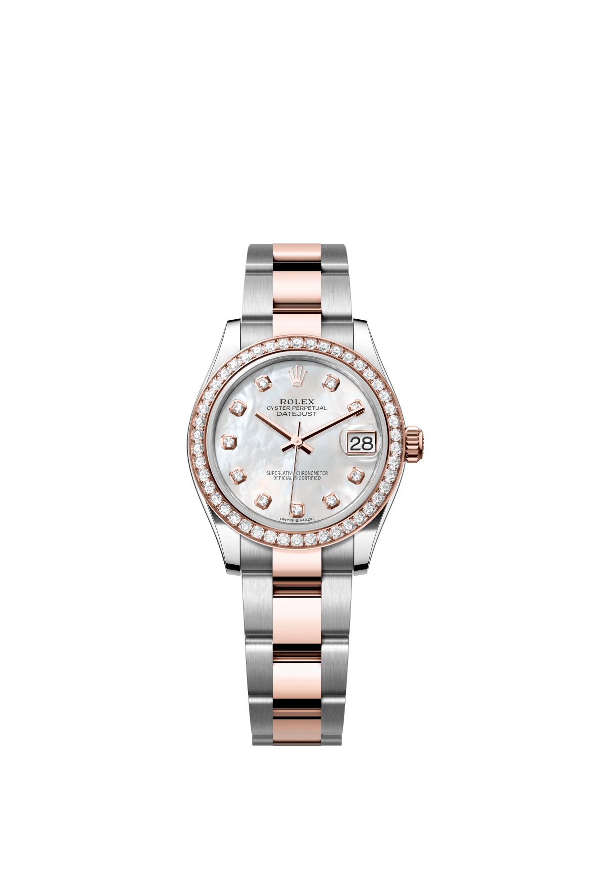 The Oyster Perpetual Datejust 31 is available in Everose gold and Oystersteel, with a diamond-set white mother-of-pearl dial and an Oyster bracelet. -m278381rbr-0025