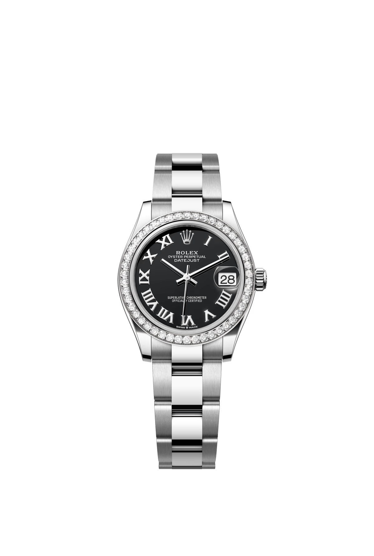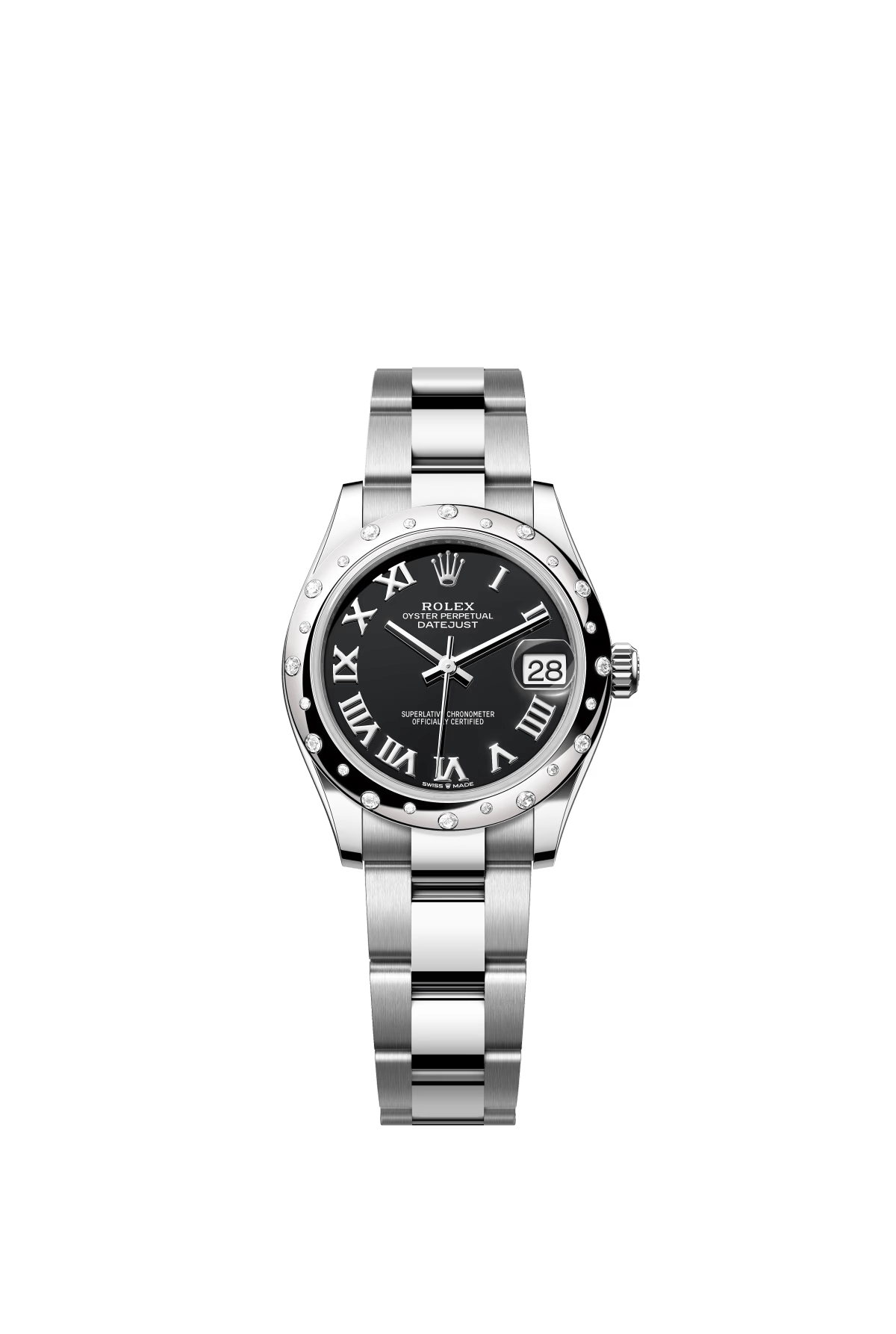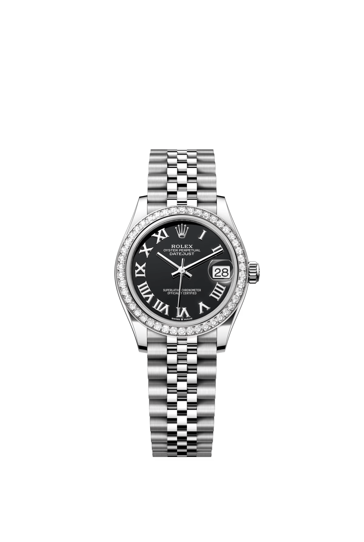 The Oyster Perpetual Datejust 31 is available in white gold and Oystersteel with a glossy black dial and an Oyster bracelet. -m278274-0001