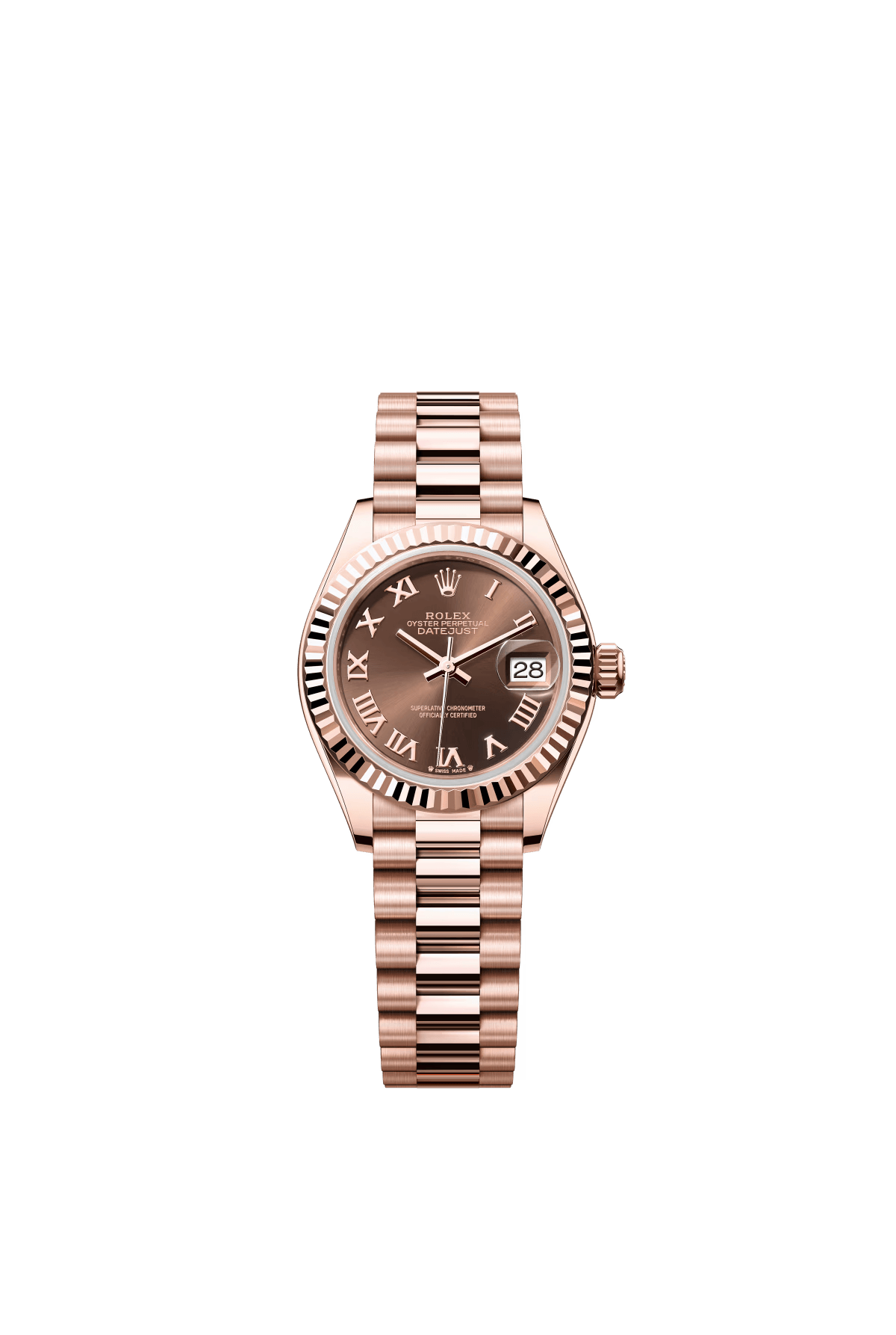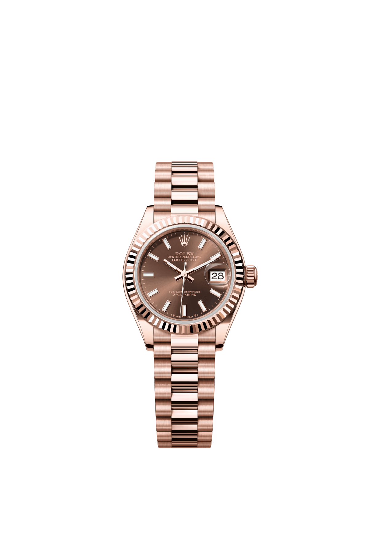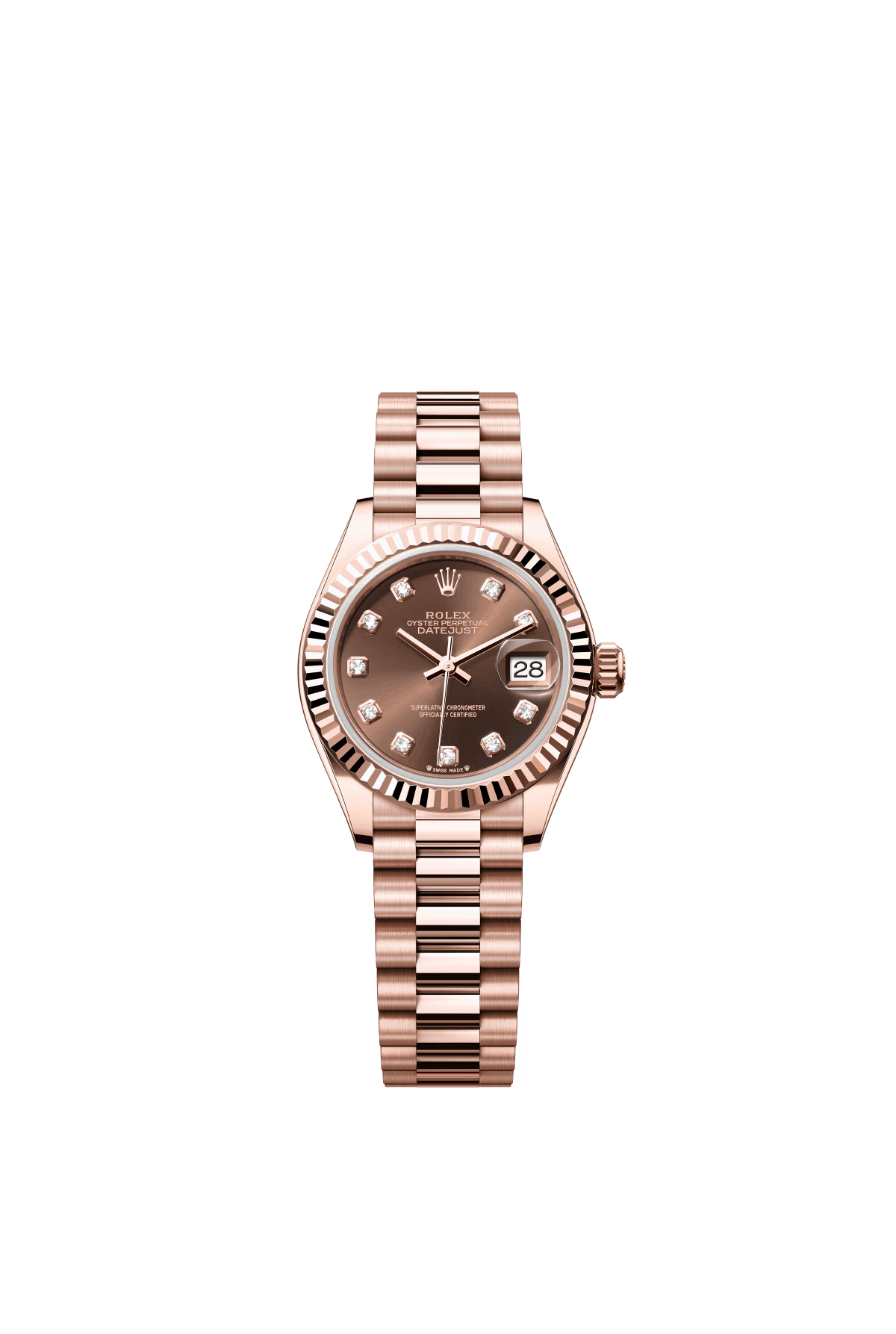 The Oyster Perpetual Lady-Datejust in 18 ct Everose gold with a chocolate-coloured diamond-set dial and a President bracelet. -m279135rbr-0017 28mm