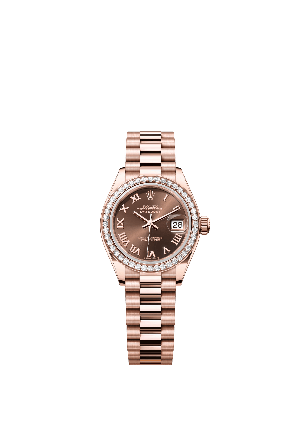 The Oyster Perpetual Lady-Datejust in 18 ct Everose gold with a chocolate-coloured diamond-set dial and a President bracelet. -m279135rbr-0001 28mm
